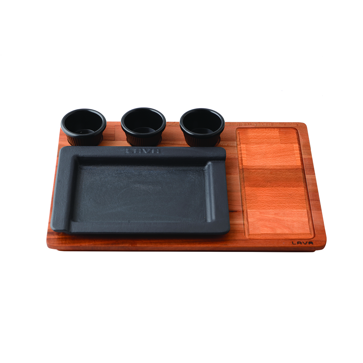 Сервировочное блюдо квадратное черное на деревянном подносе 18x25cm. (не включает соусники)