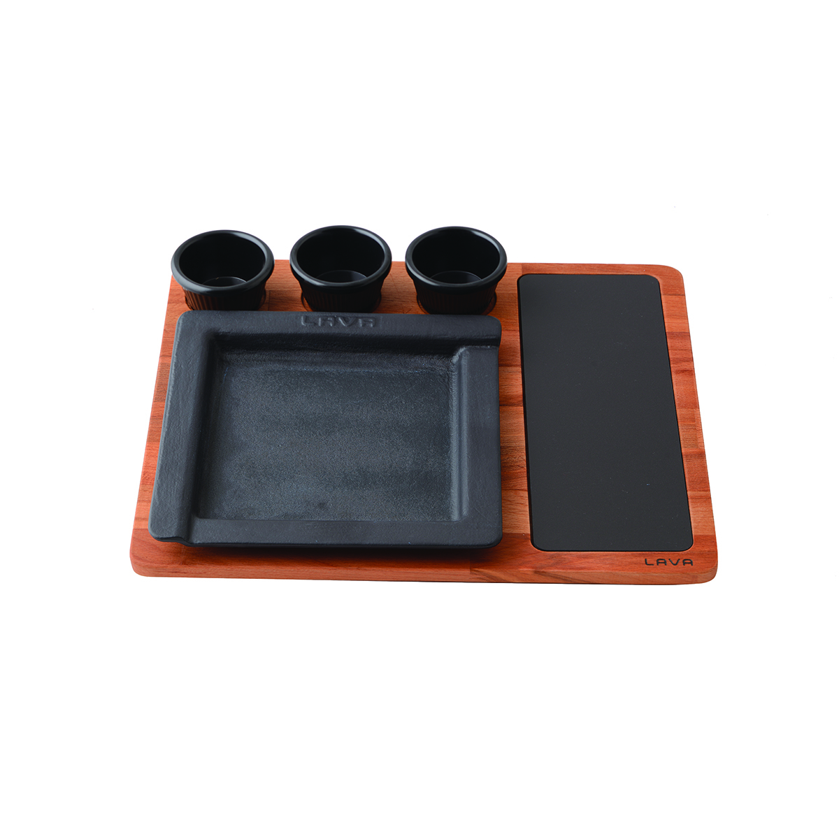 Сервировочное блюдо квадратное на деревянном подносе и съемная литая чугунная панель 22x22cm. (не включает соусники)