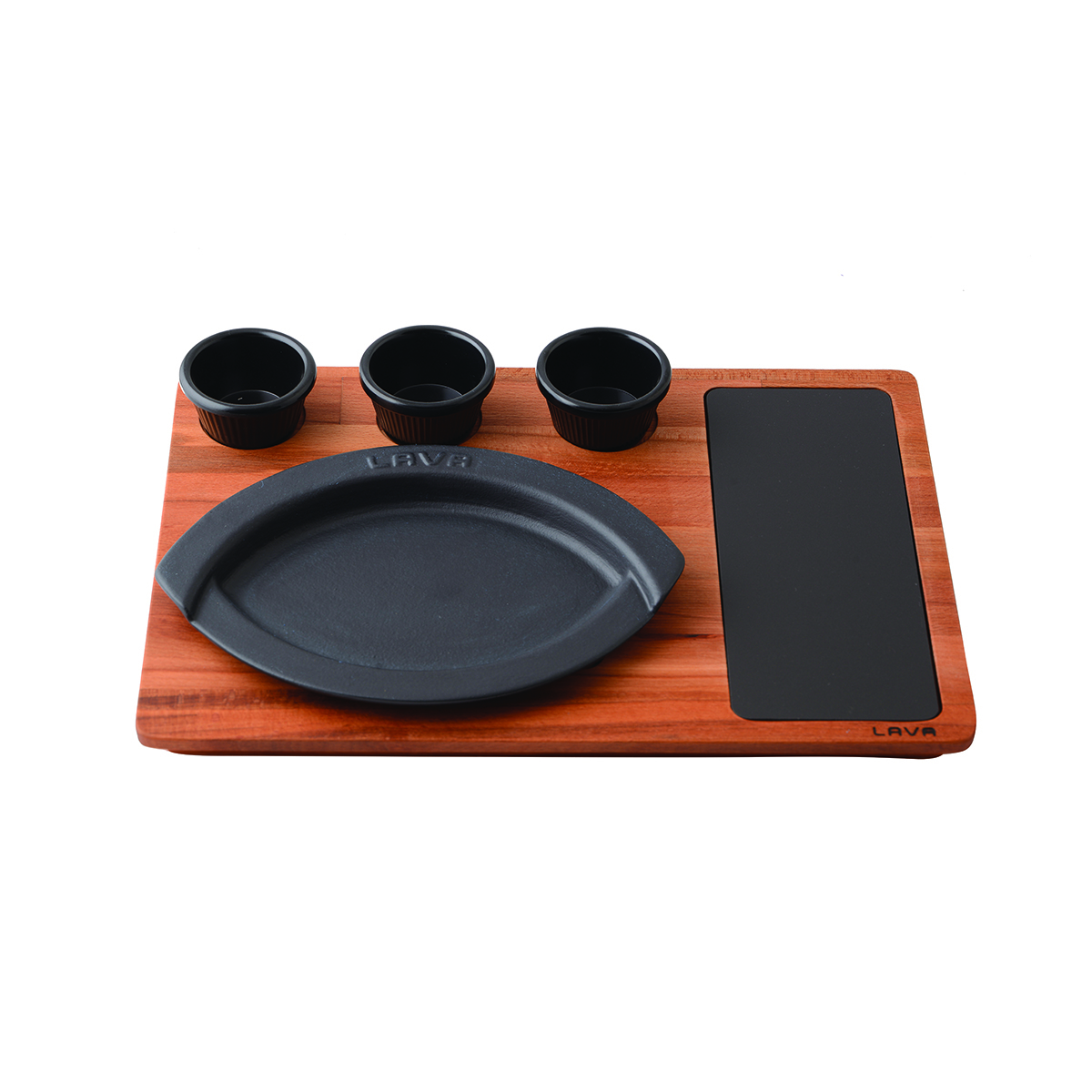 Сервировочное блюдо овальное на деревянном подносе и съемная литая чугунная панель18x25cm. (не включает соусники)