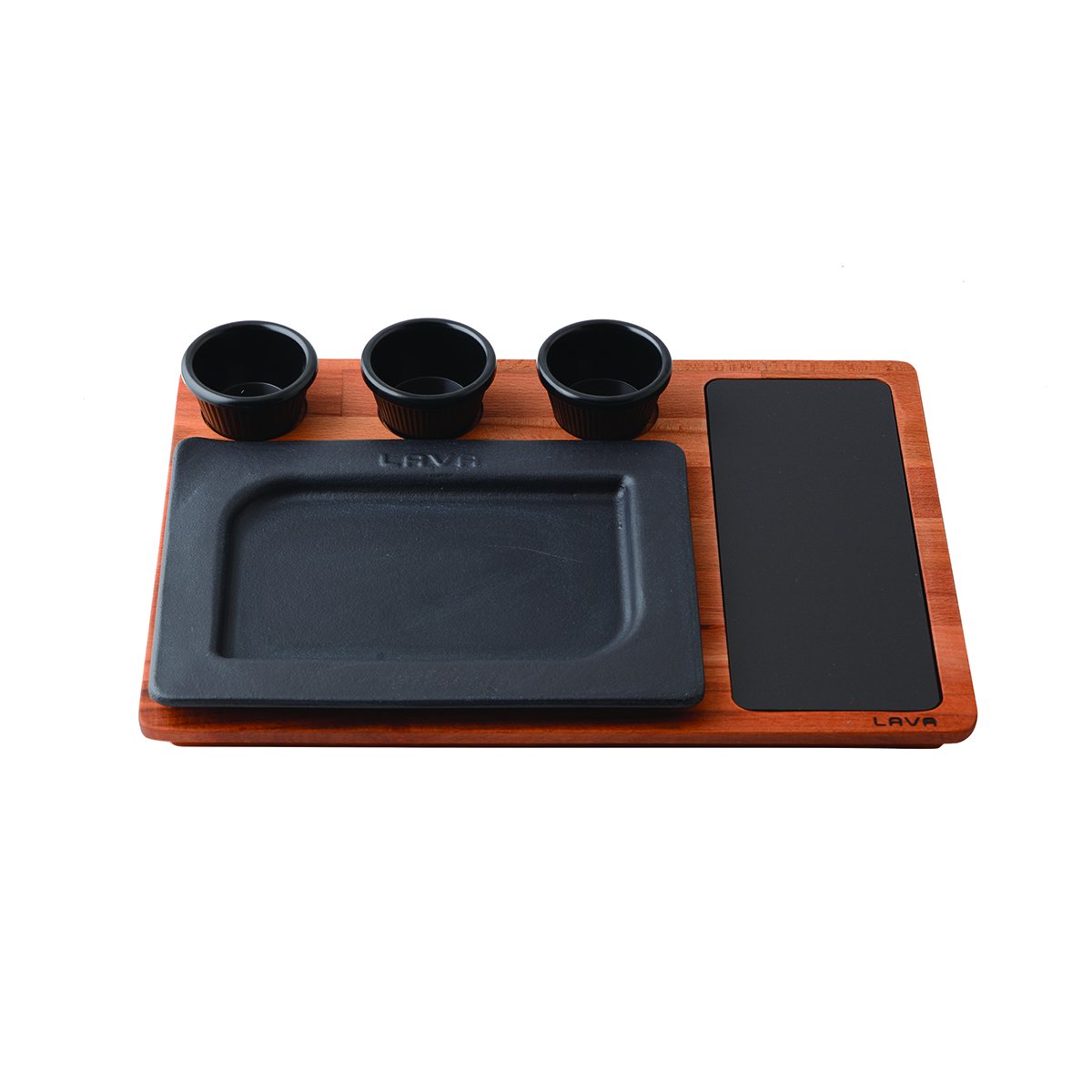 Сервировочное блюдо прямоугольное на деревянном подносе и съемная литая чугунная панель 19x26cm. (не включает соусники)
