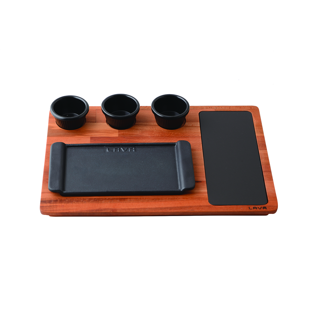 Сервировочное блюдо прямоугольное на деревянном подносе и съемная литая чугунная панель. черное. 13x25cm. (не включает соусники)