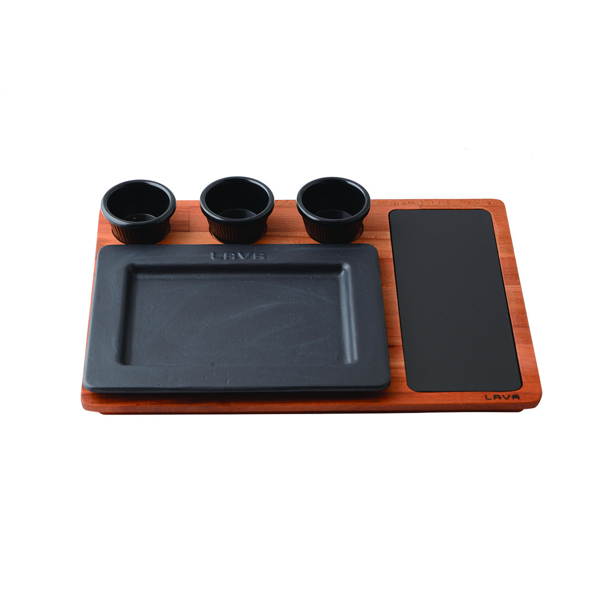 Сервировочное блюдо прямоугольное на деревянном подносе и съемная литая чугунная панель.19x26cm. (не включает соусники)