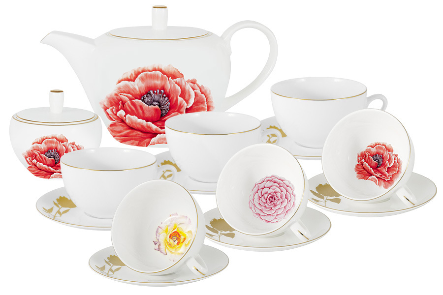Чашки декорированы изображением мака, миддлемиста и камелии, чайник и сахарница – маком.