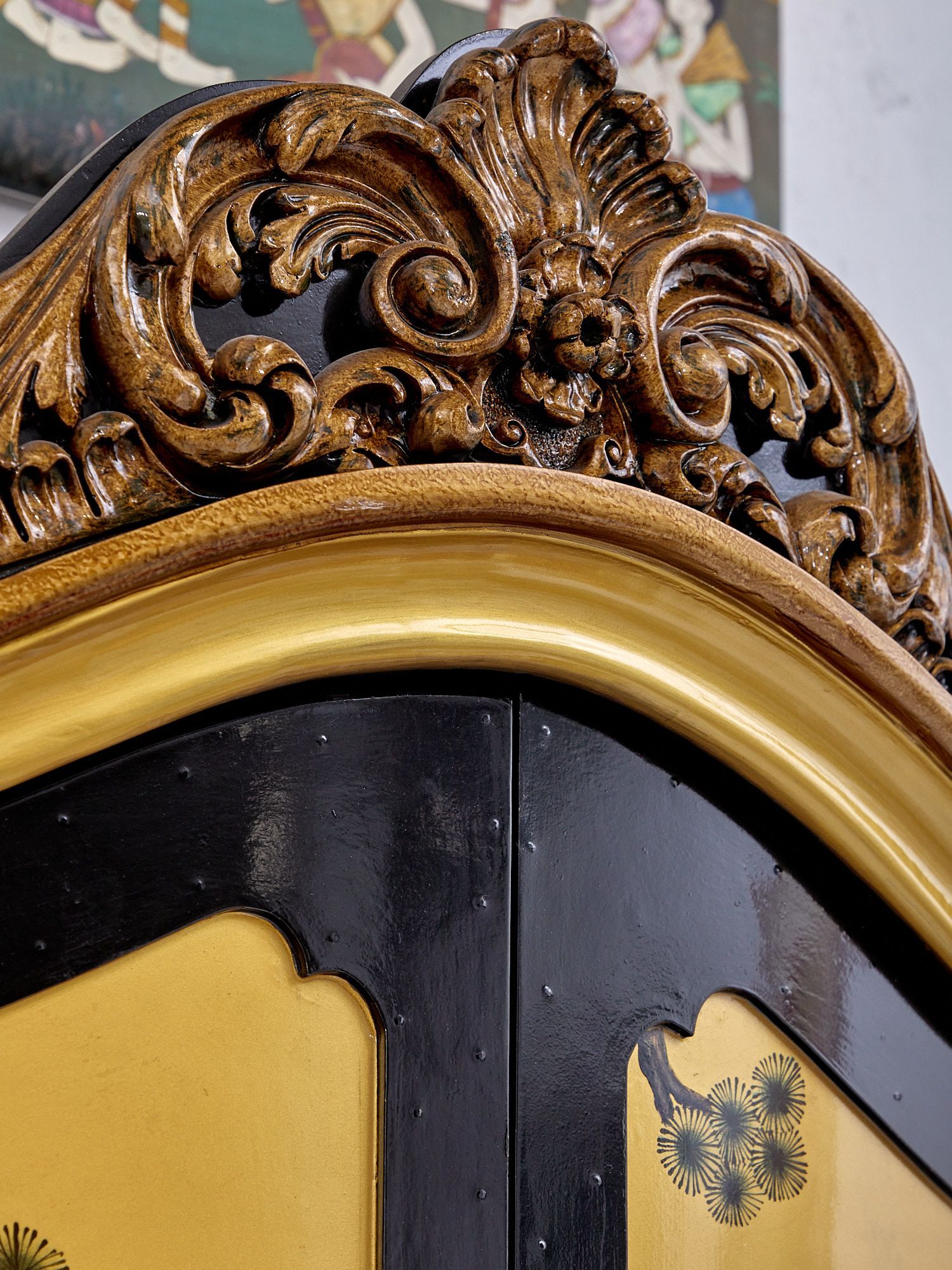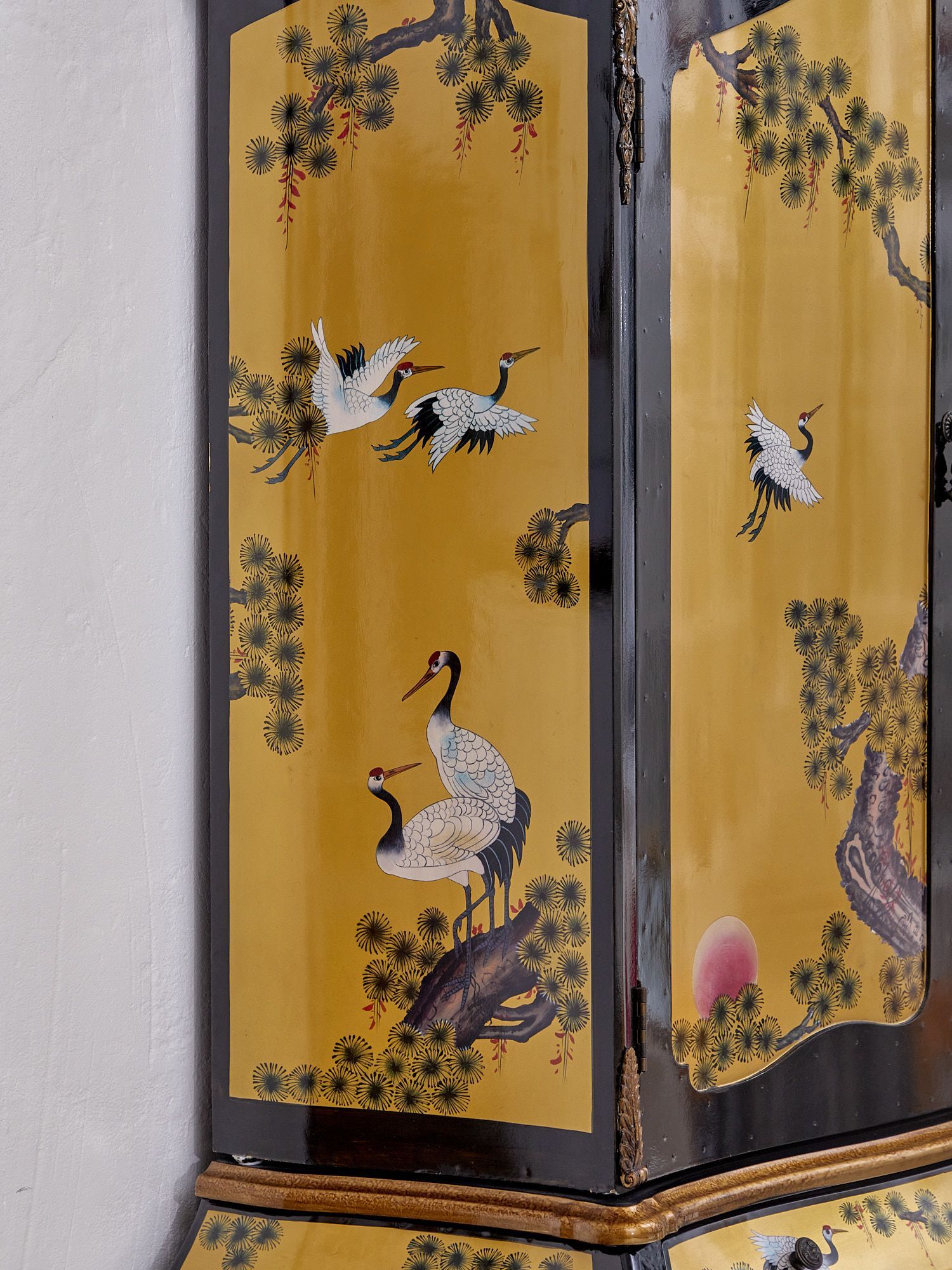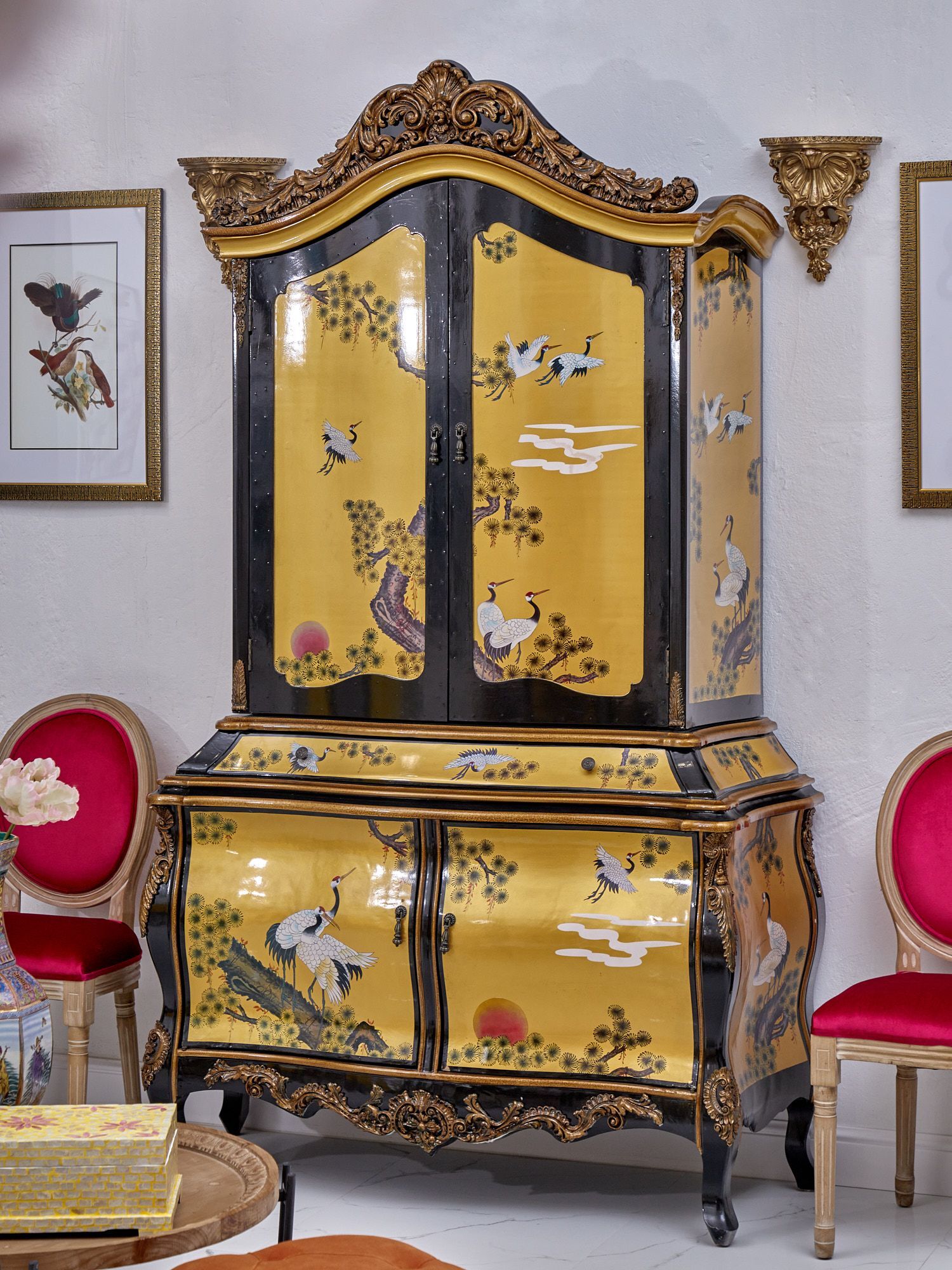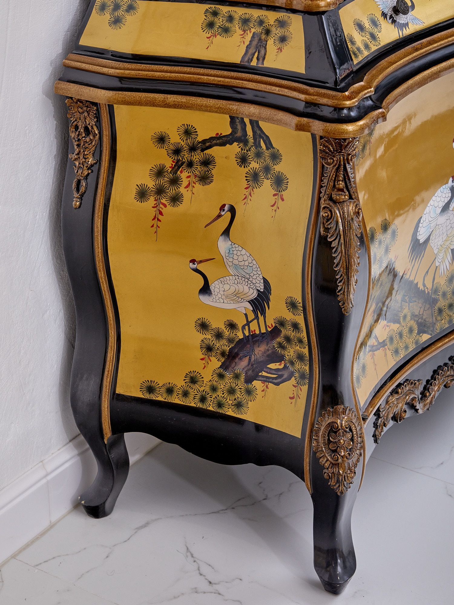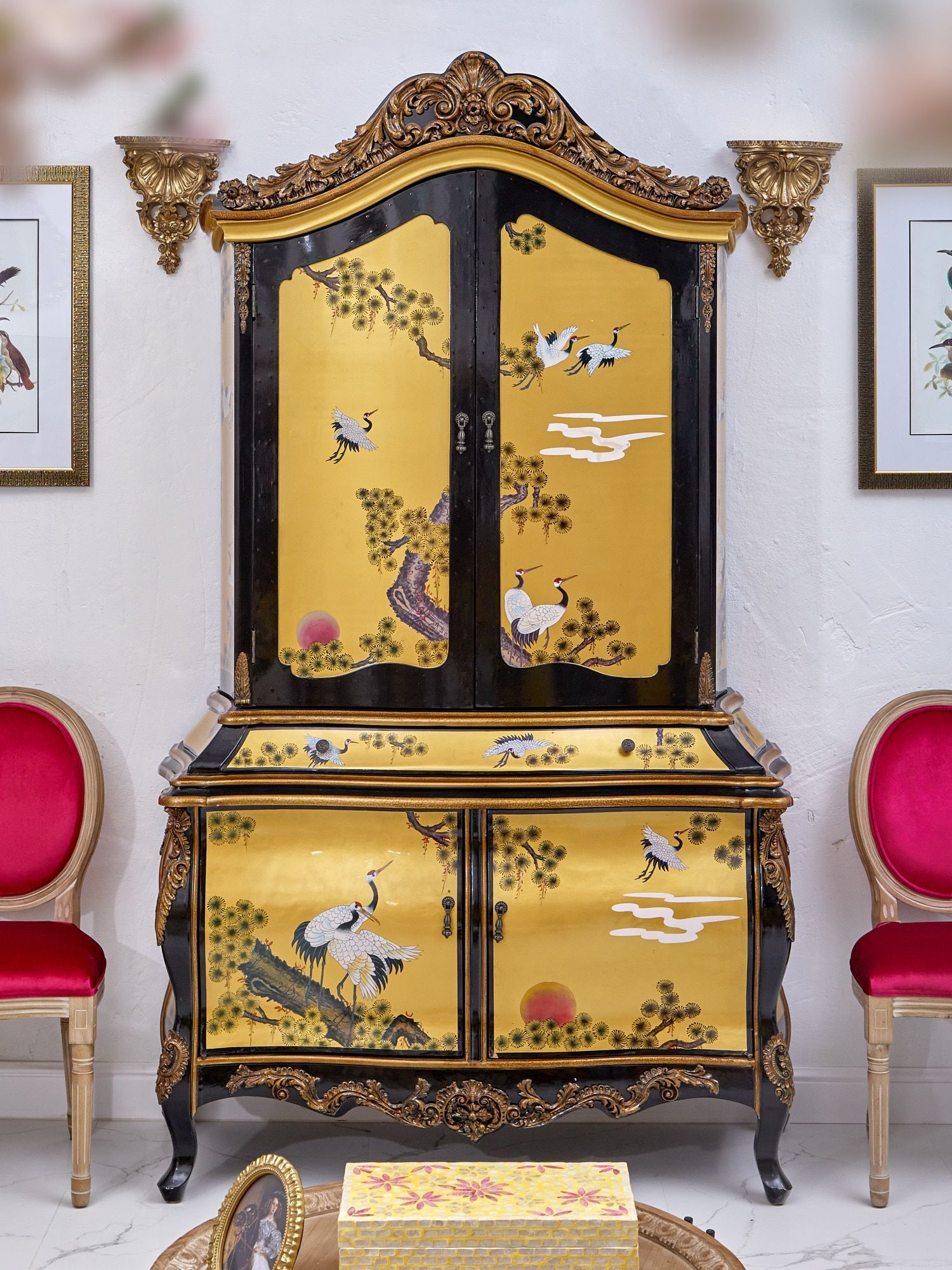 Уникальный шкаф в стиле барокко с отсеками для хранения любимых вещей. Ручная роспись панели в вариациях японских пейзажей, неординарные формы и резная отделка привлекут внимание ваших гостей и отправят в путешествие во времена дворцовых интерьеров и убранств.