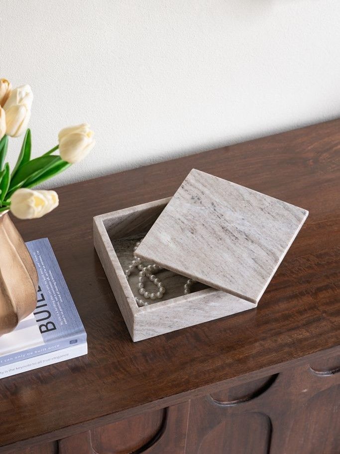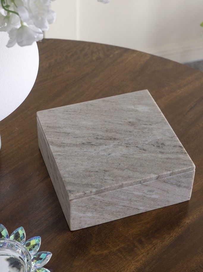 Декоративная шкатулка, выполненная из натурального серого мрамора, сочетает в себе органичный дизайн и современный минимализм, имеет квадратный силуэт, полированную поверхность и заметные прожилки. В изделии можно хранить бижутерию, ювелирные украшения и предметы первой необходимости. Шкатулка украсит интерьер вашей гостиной, прихожей, спальной комнаты или кабинета, гармонично сочетаясь с традиционными, современными, ваби-саби и индустриальными стилями.