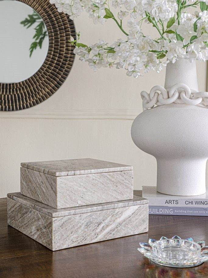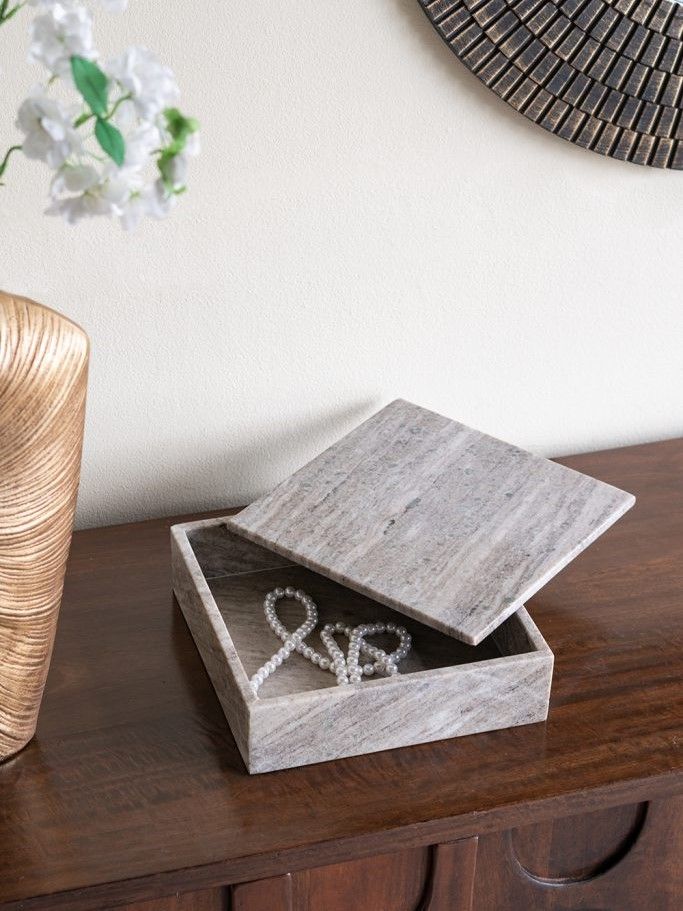 Декоративная шкатулка, выполненная из натурального серого мрамора, сочетает в себе органичный дизайн и современный минимализм, имеет квадратный силуэт, полированную поверхность и заметные прожилки. В изделии можно хранить бижутерию, ювелирные украшения и предметы первой необходимости. Шкатулка украсит интерьер вашей гостиной, прихожей, спальной комнаты или кабинета, гармонично сочетаясь с традиционными, современными, ваби-саби и индустриальными стилями.