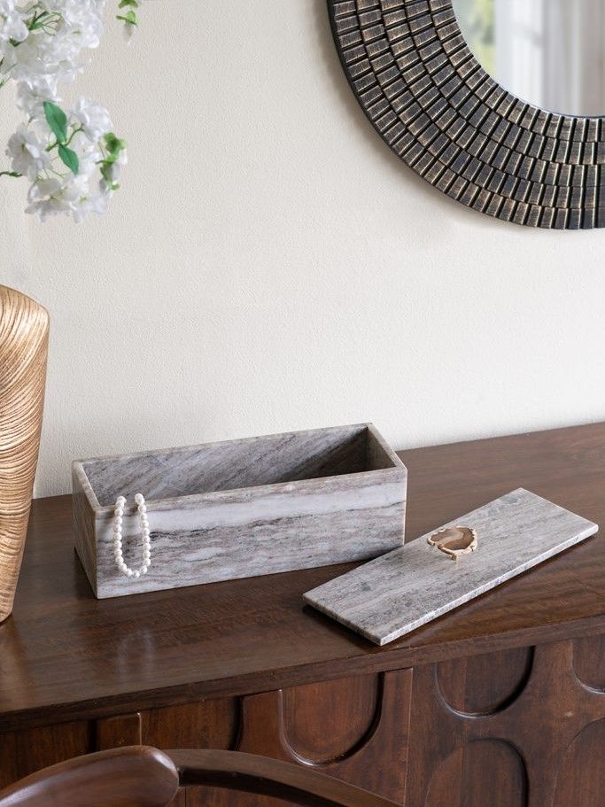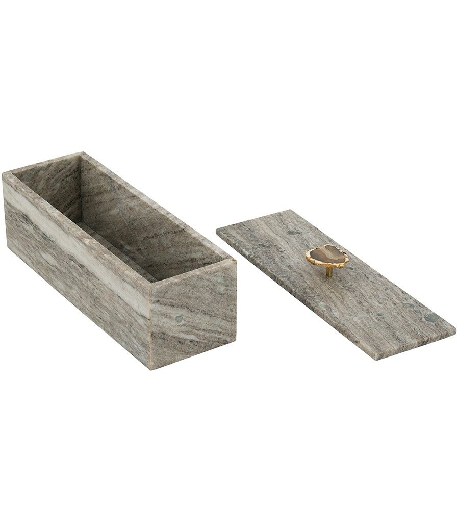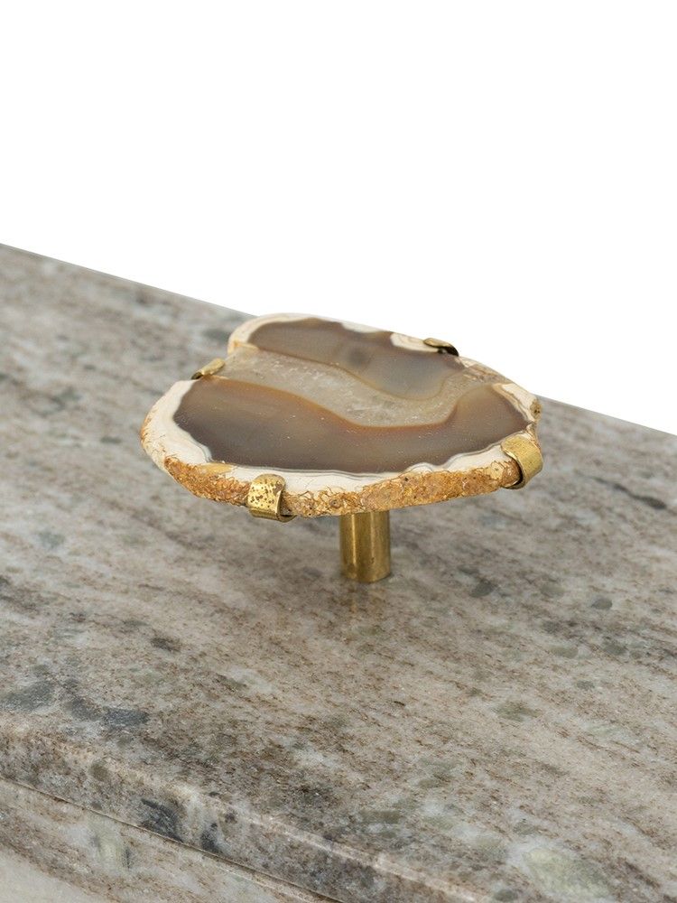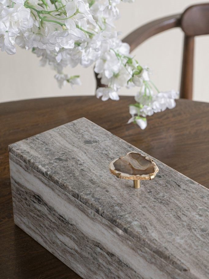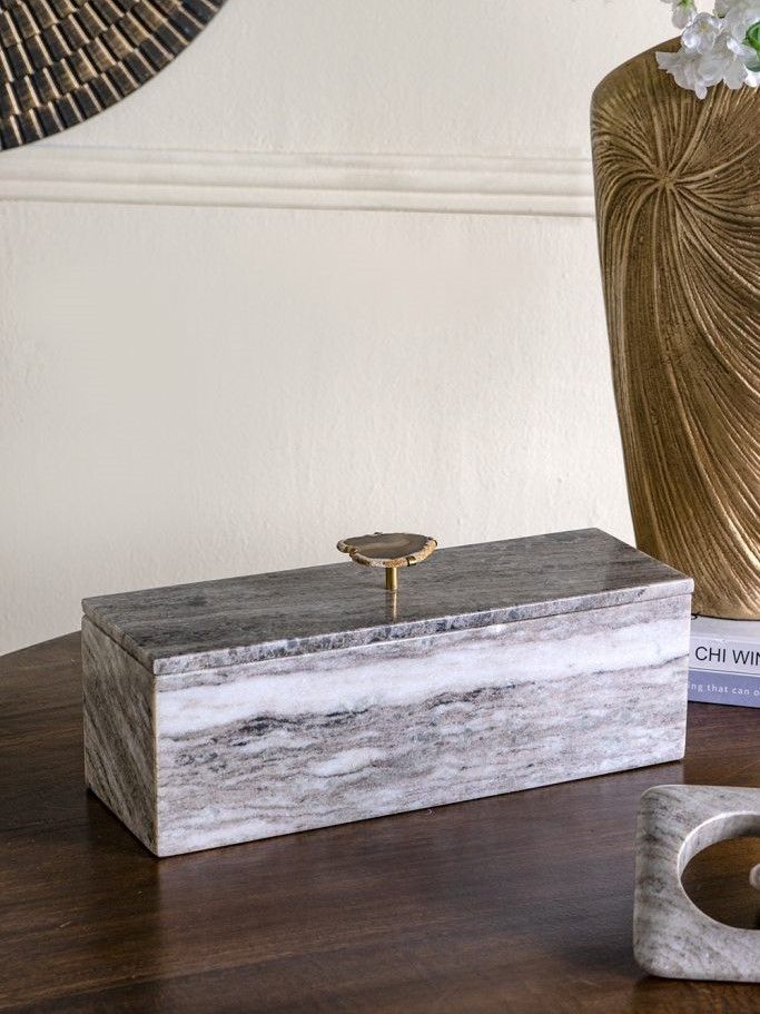 Декоративная шкатулка для хранения украшений, выполненная из натурального серого мрамора, сочетает в себе органичный дизайн и современный минимализм. Изделие имеет элегантный прямоугольный силуэт с латунной ручкой, украшенной натуральным агатом. В шкатулке можно хранить бижутерию, ювелирные украшения и предметы первой необходимости, органично впишется в интерьер вашей гостиной, прихожей, спальни или кабинета, гармонируя с современным, переходным, минималистичным дизайном и стилем арт-деко.