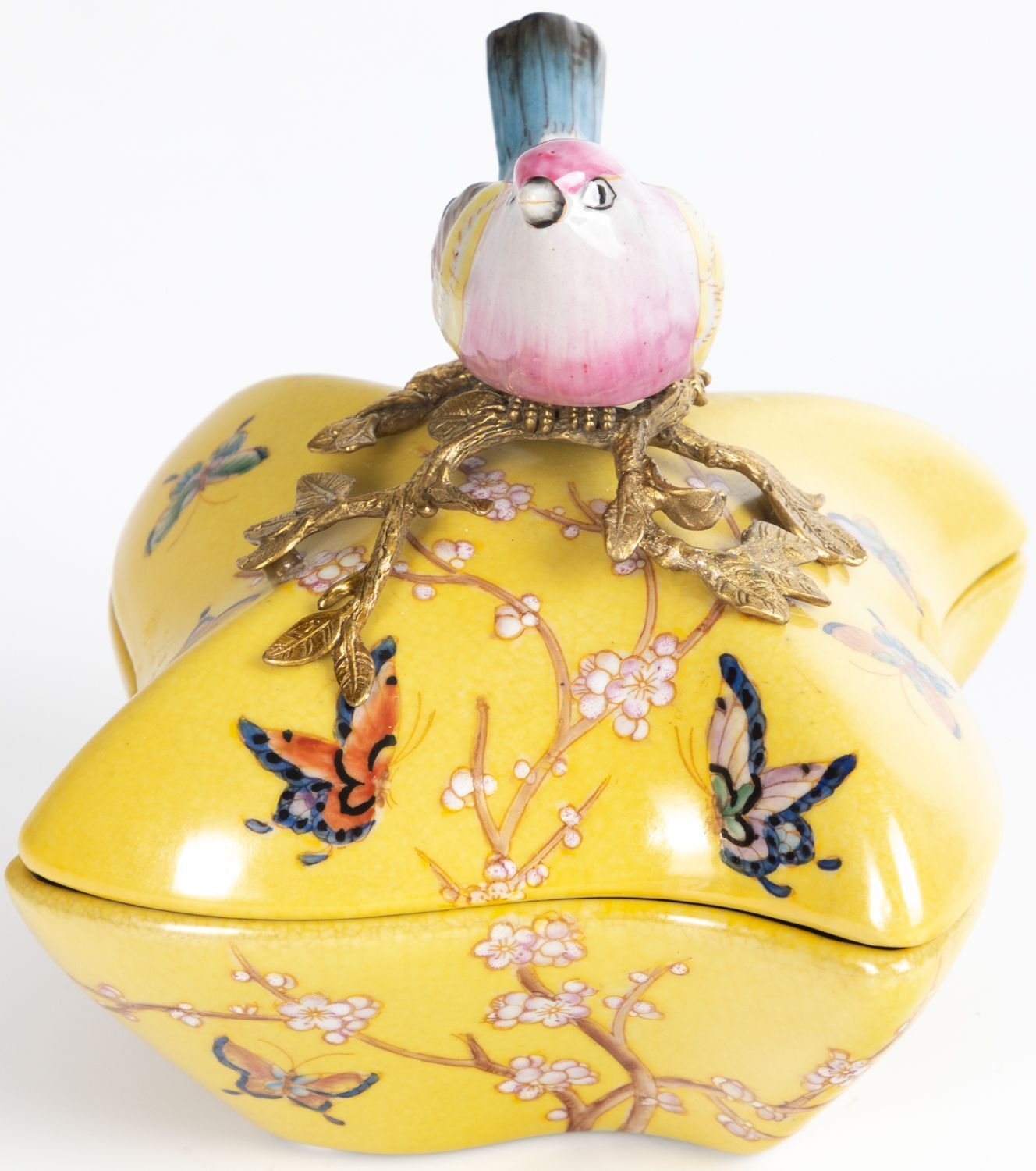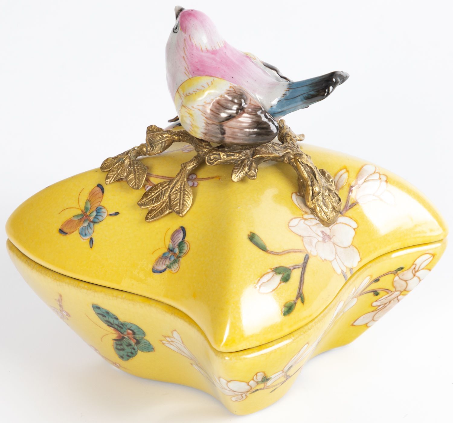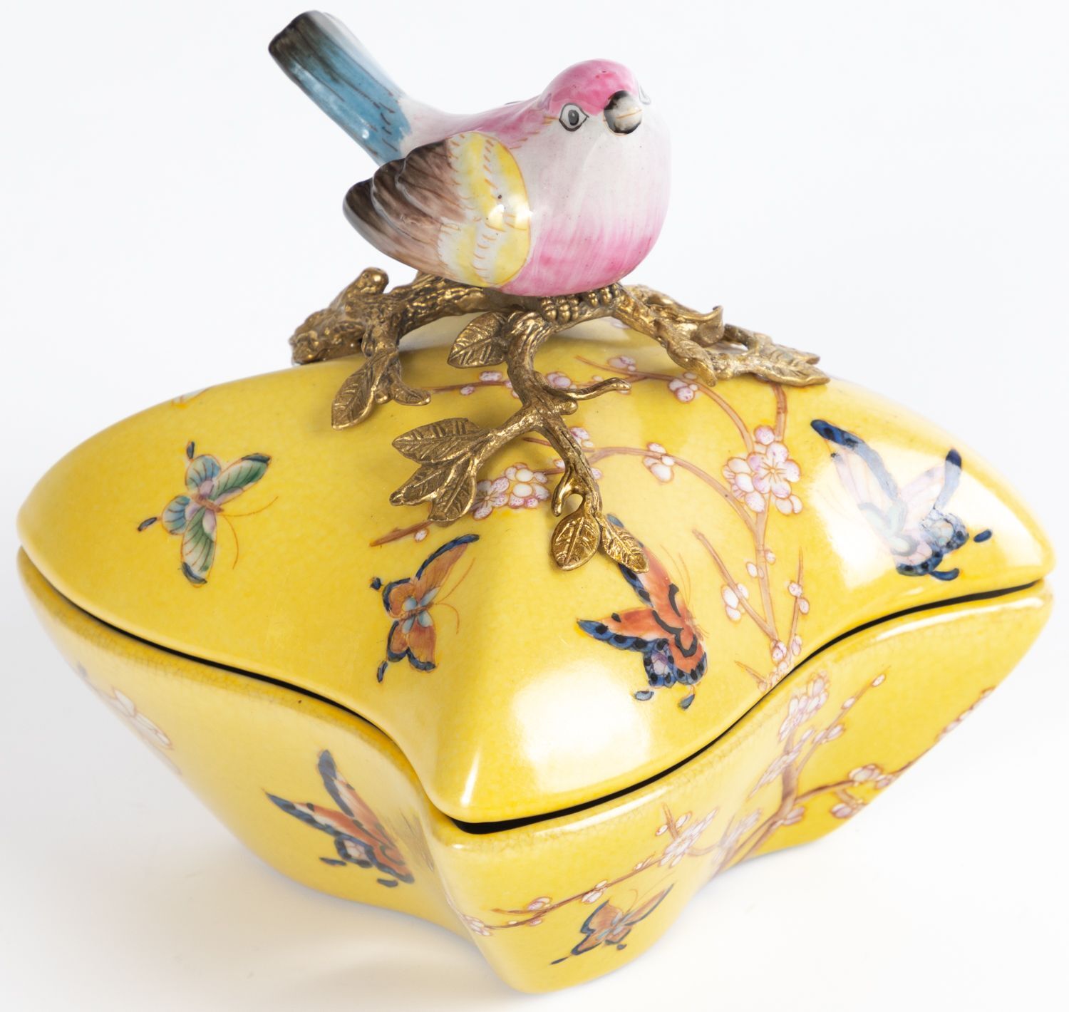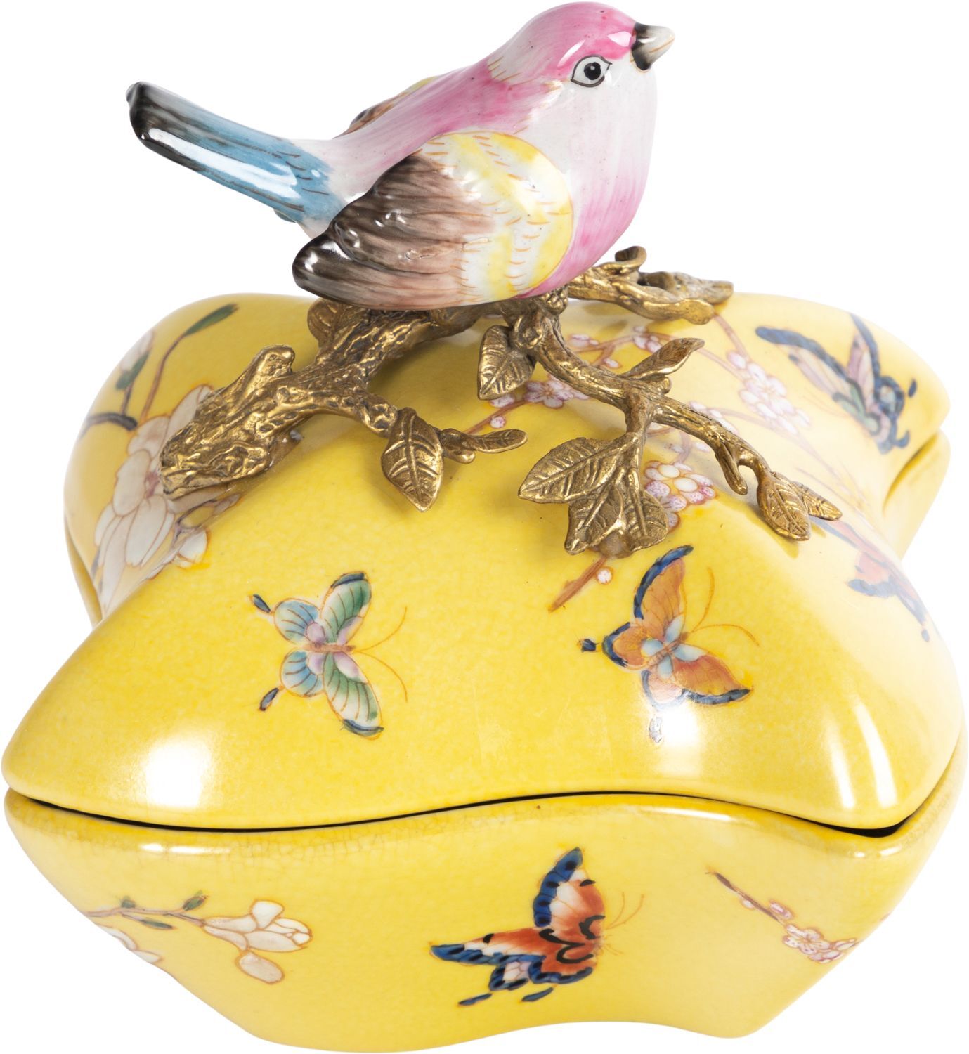 Шкатулка с птичкой, выполненная из фарфора с бронзовыми элементами. Уникальное изделие ручной работы. При производстве этих художественных изделий из фарфора с бронзой используются вековые традиции китайских мастеров. Видимые трещинки (кракелюры) делаются по уникальной технологии, что придает более благородный вид старинного изделия.