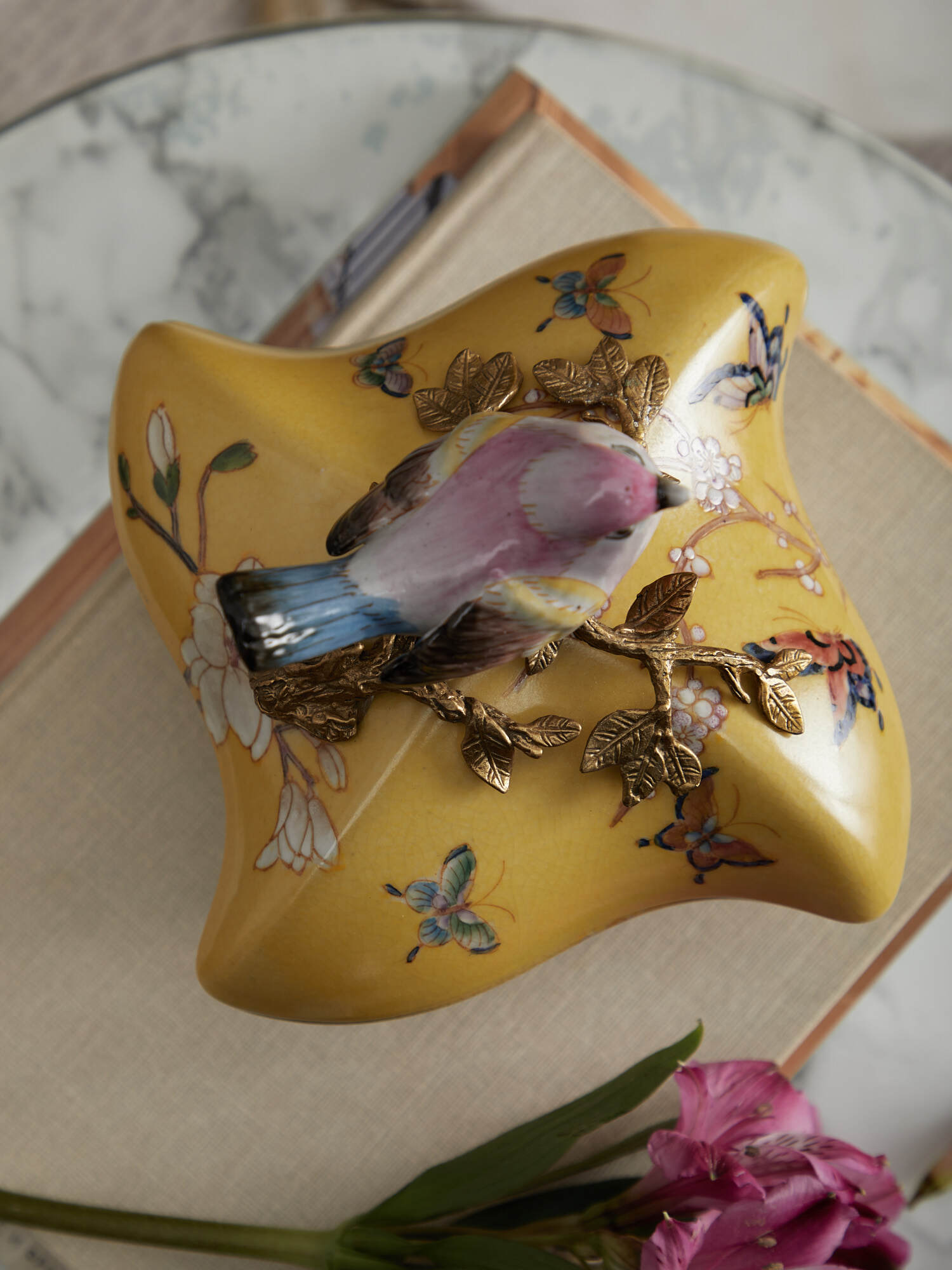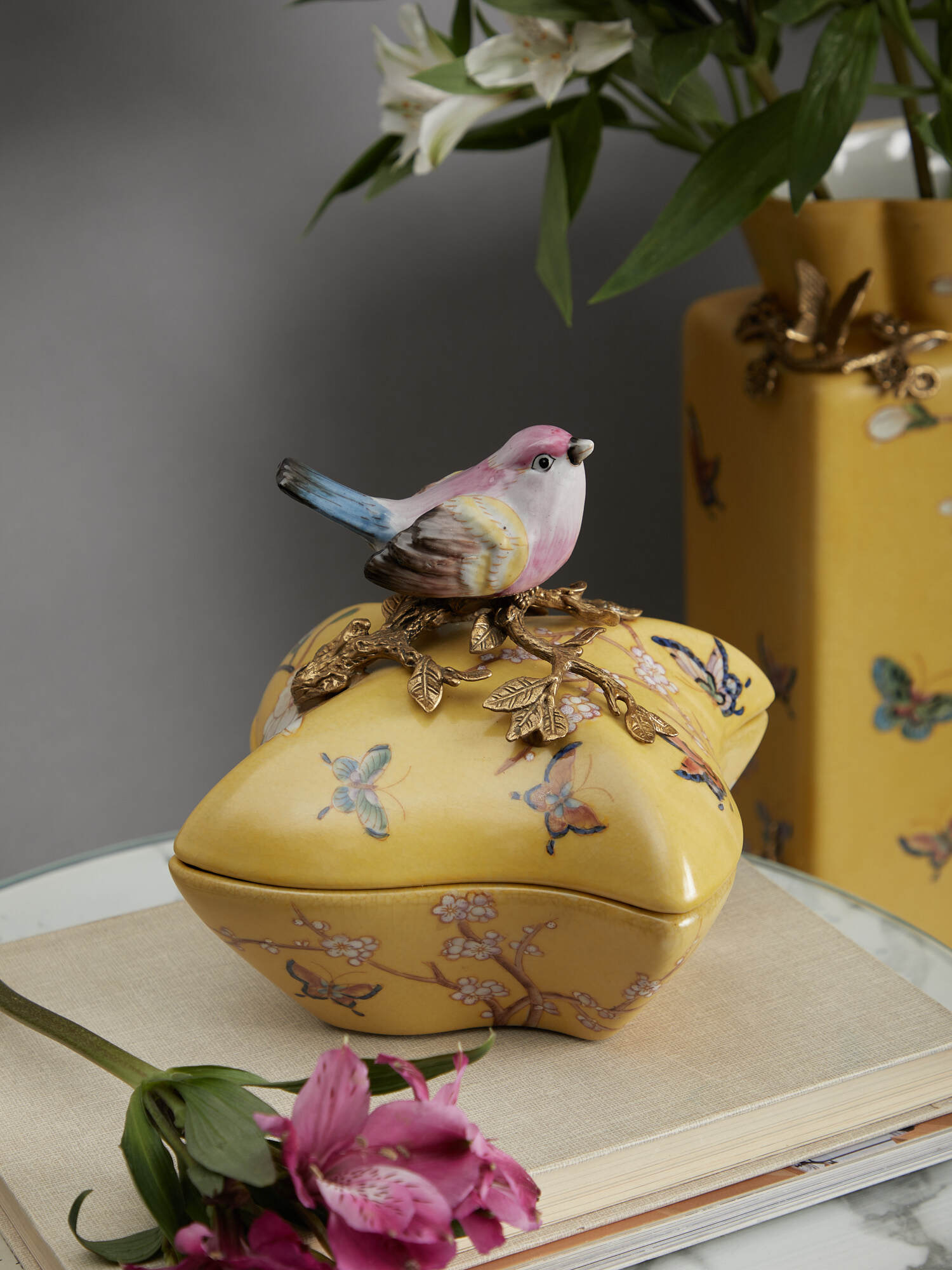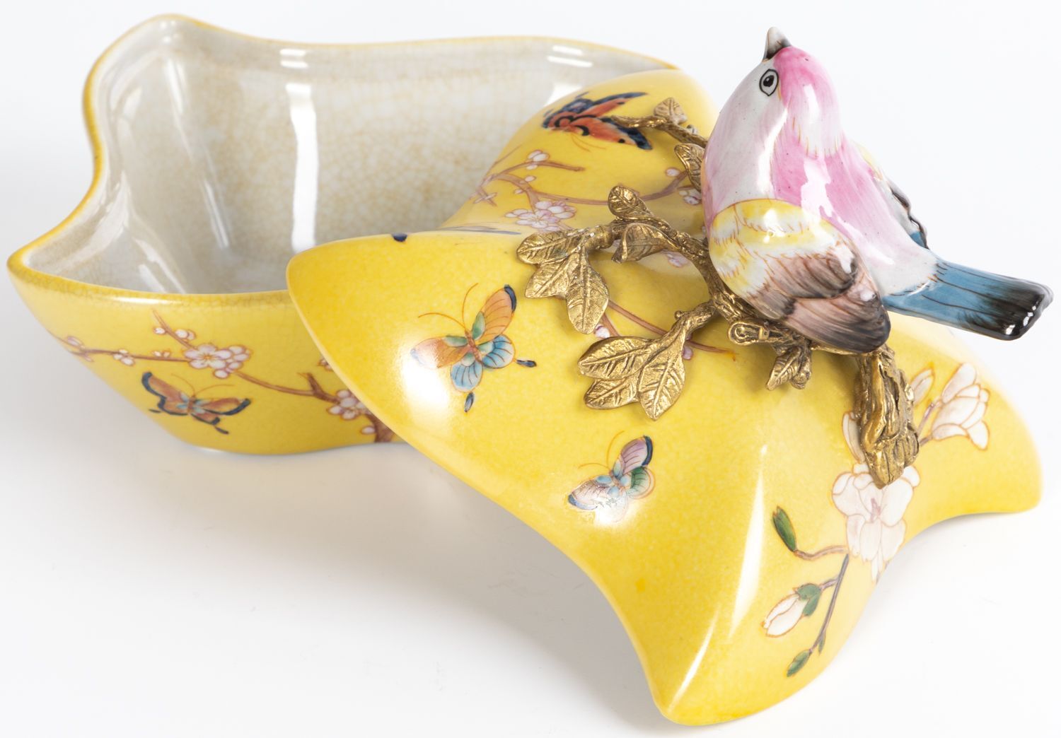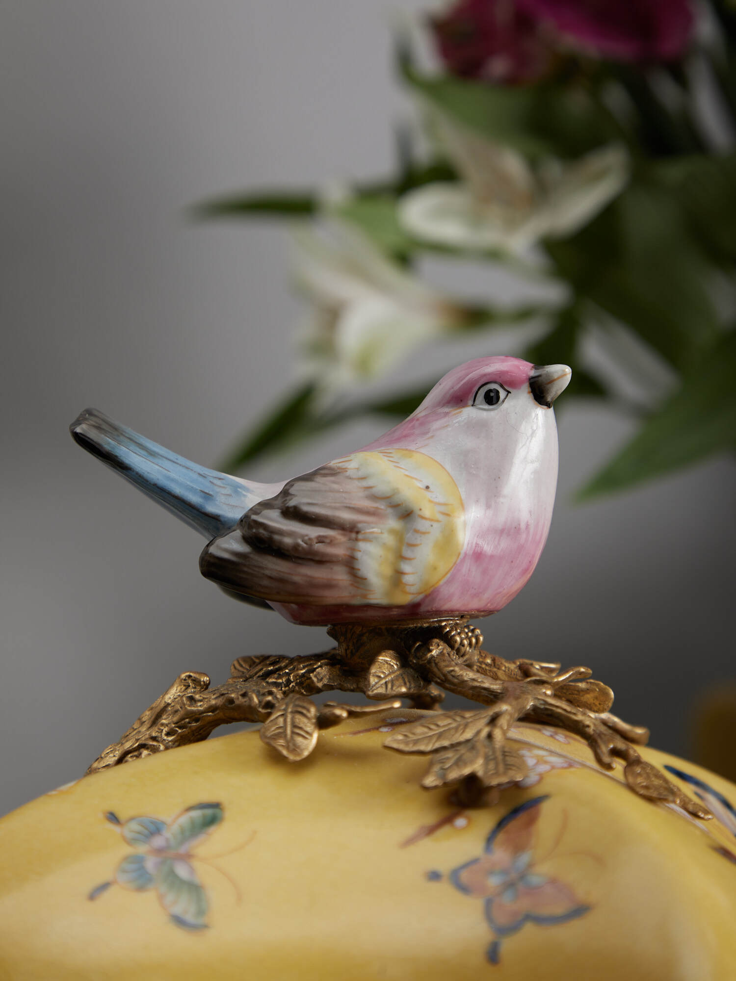 Шкатулка с птичкой, выполненная из фарфора с бронзовыми элементами. Уникальное изделие ручной работы. При производстве этих художественных изделий из фарфора с бронзой используются вековые традиции китайских мастеров. Видимые трещинки (кракелюры) делаются по уникальной технологии, что придает более благородный вид старинного изделия.