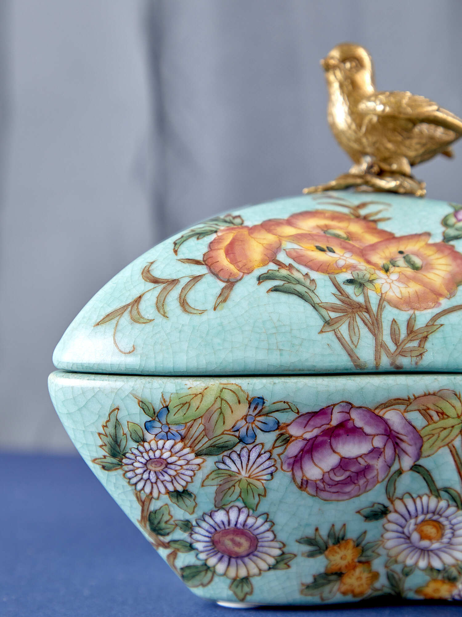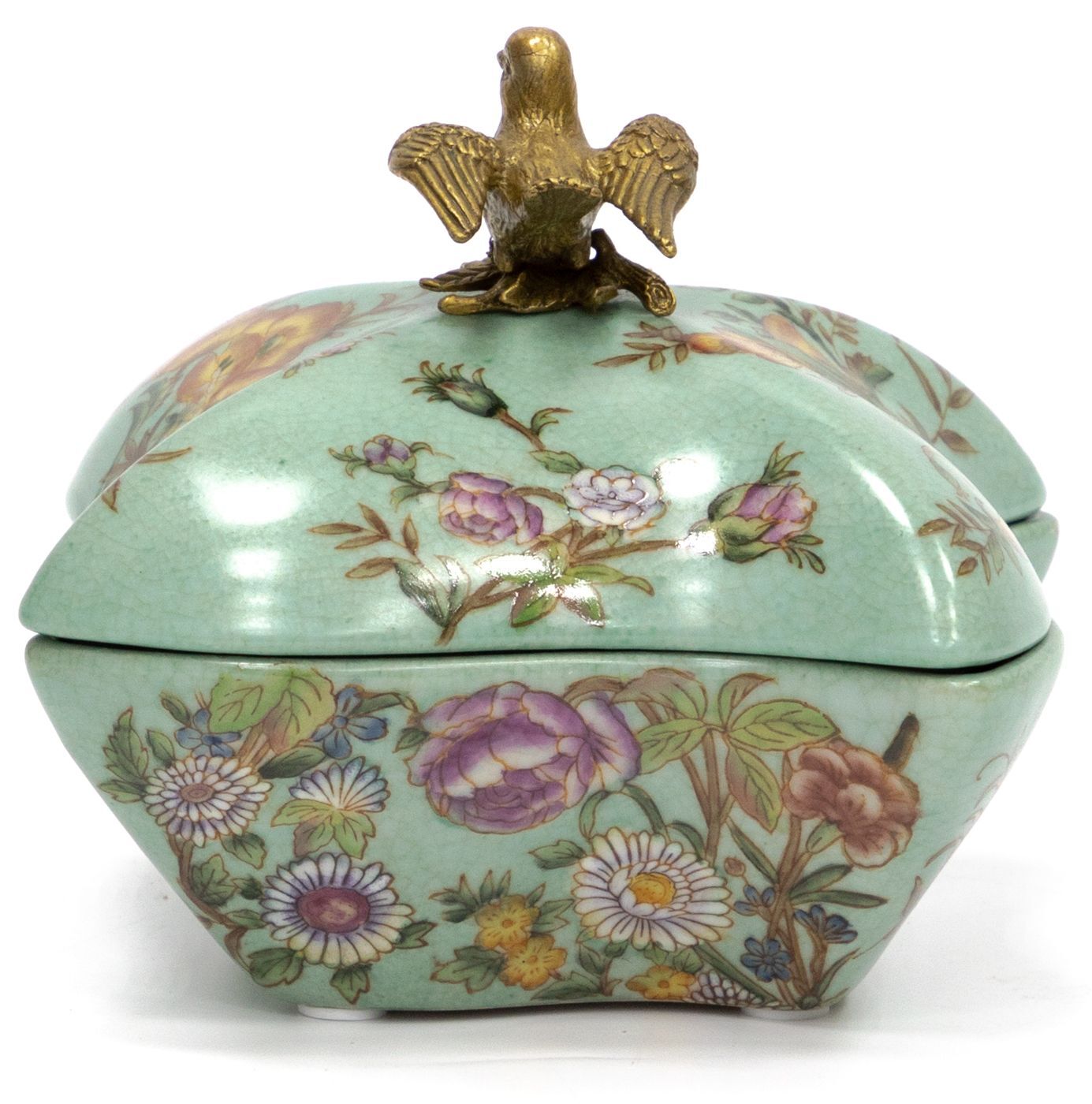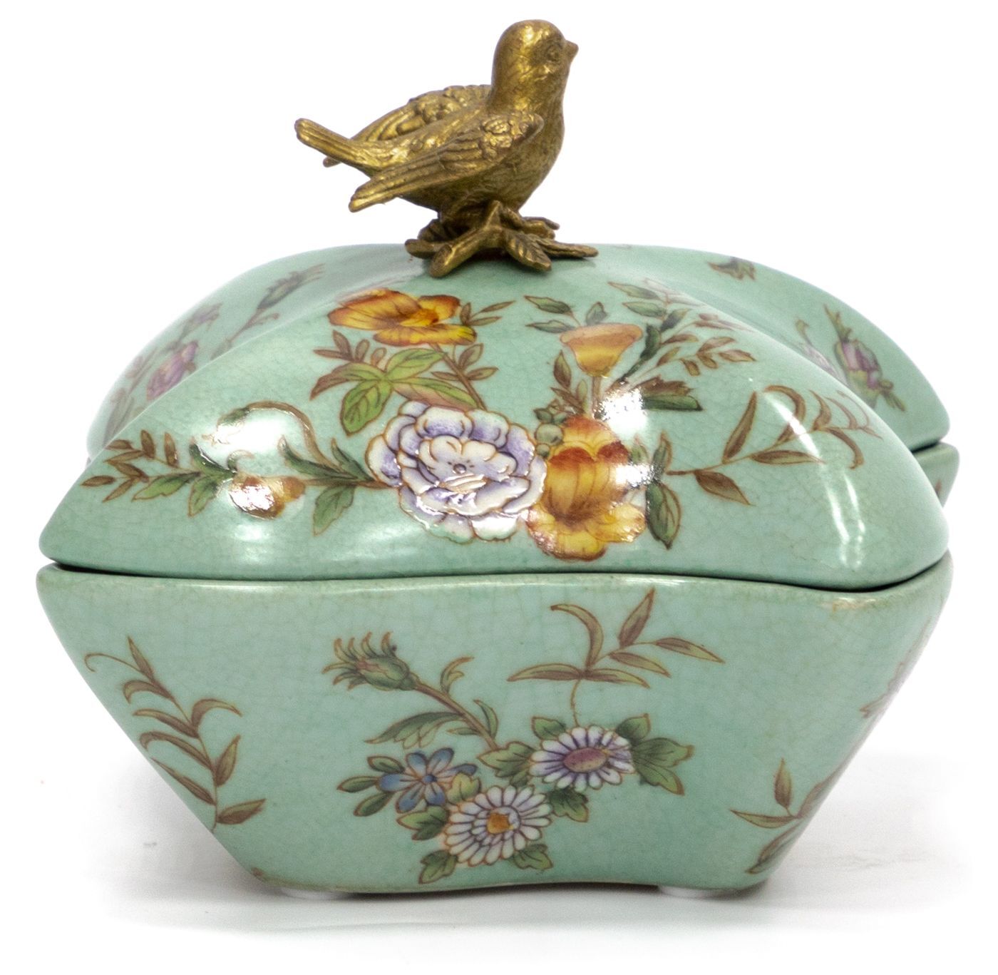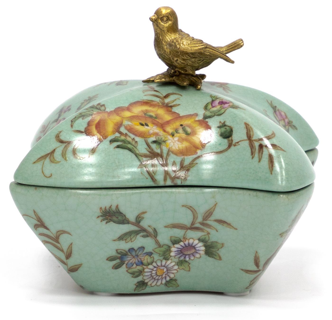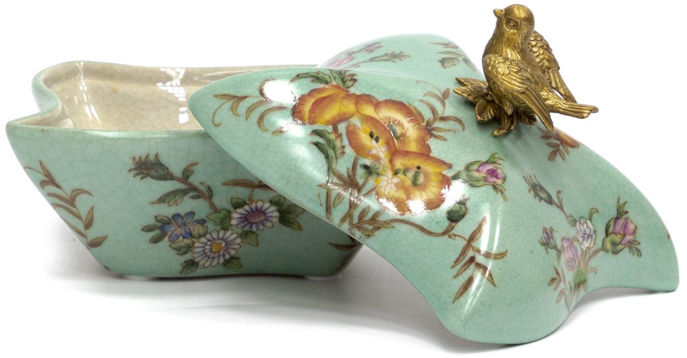 Шкатулка с птичкой, выполненная из фарфора с бронзовыми элементами. Уникальное изделие ручной работы. При производстве этих художественных изделий из фарфора с бронзой используются вековые традиции китайских мастеров. Видимые трещинки (кракелюры) делаются по уникальной технологии, что придает более благородный вид старинного изделия.