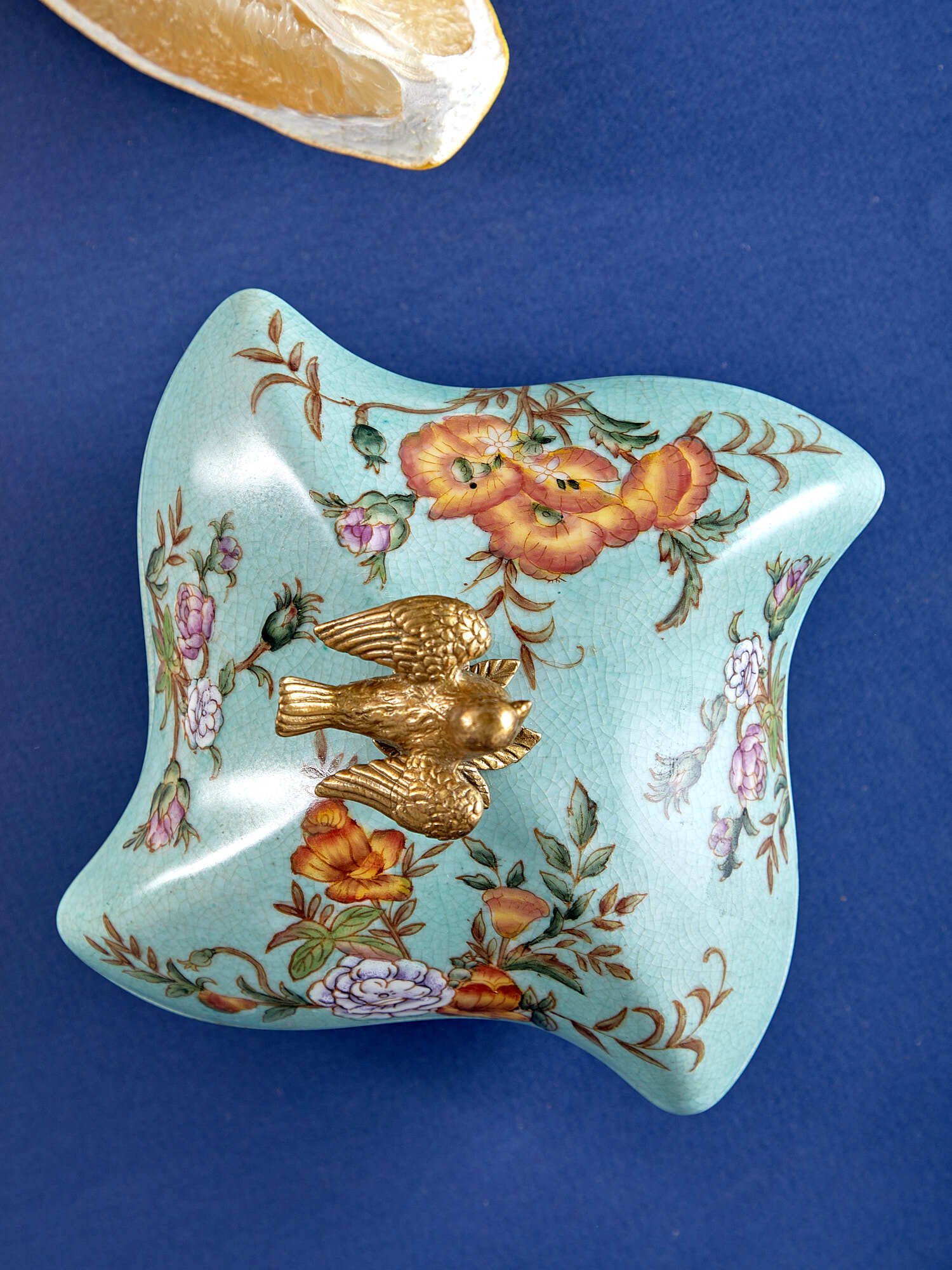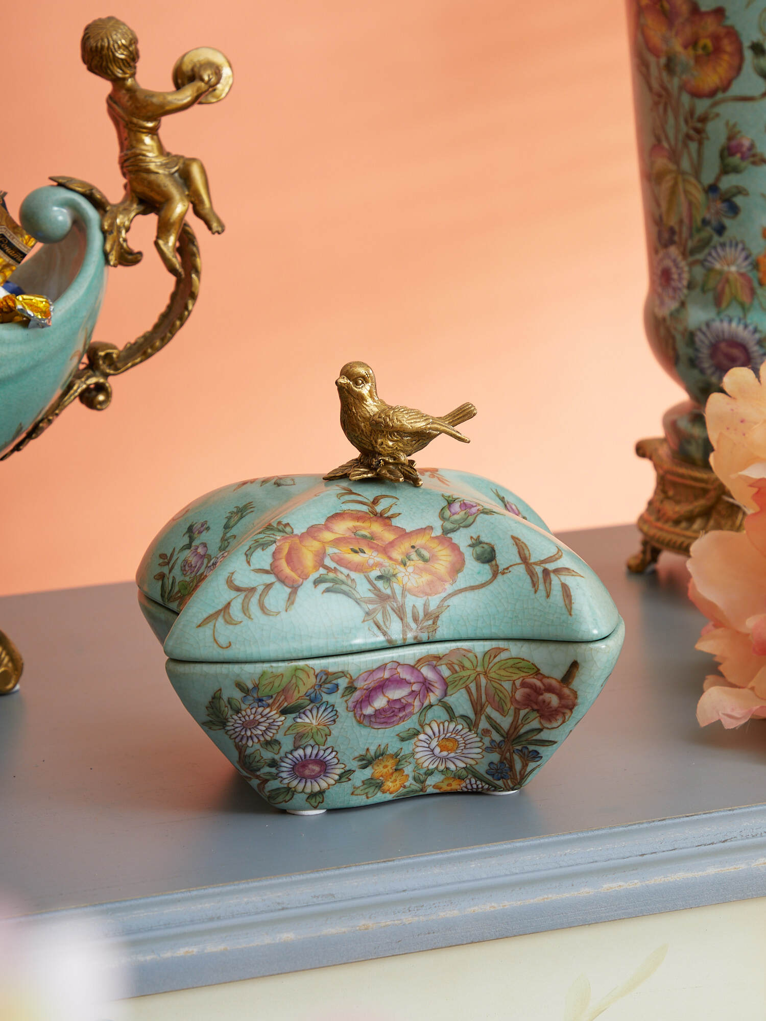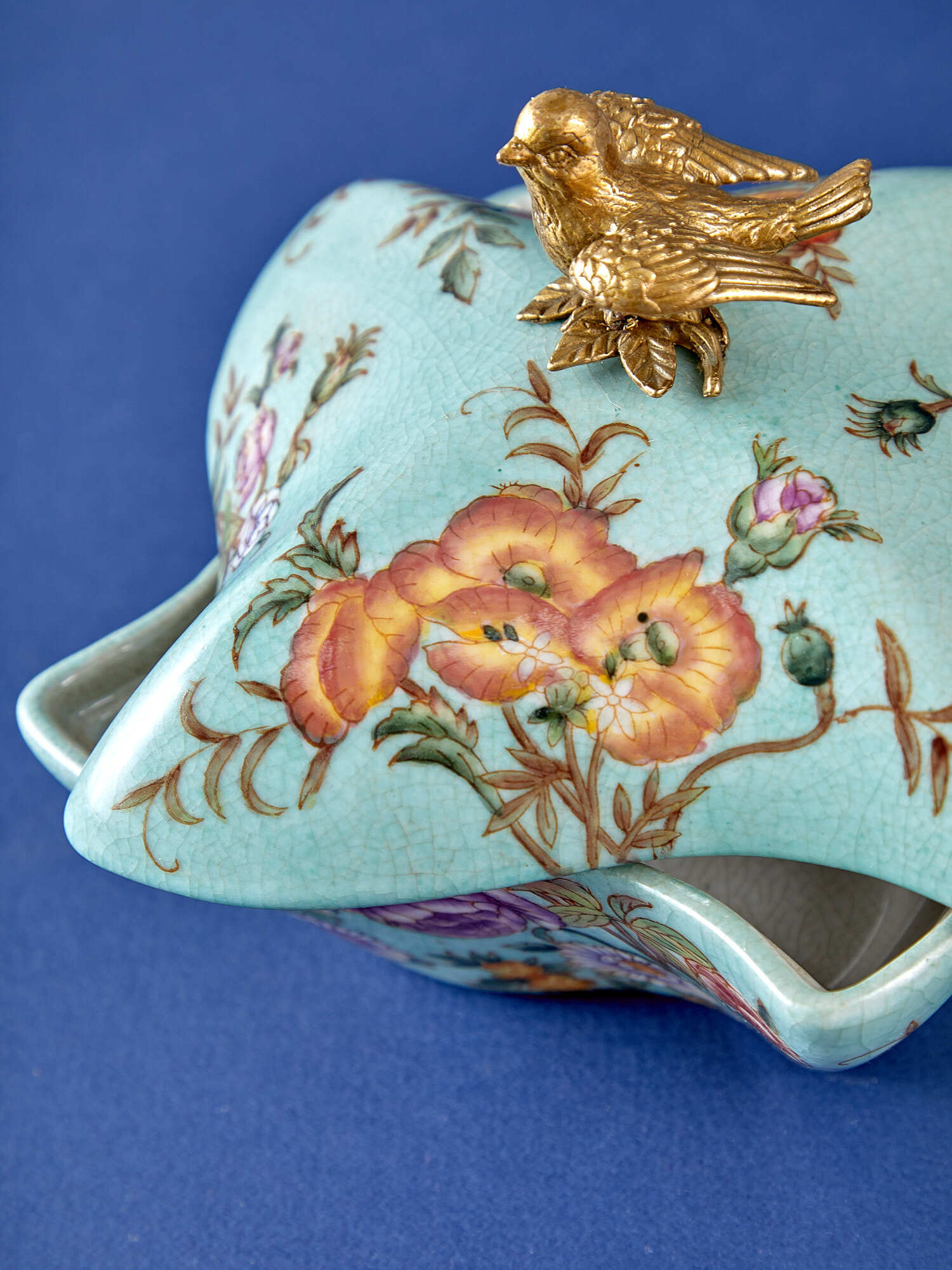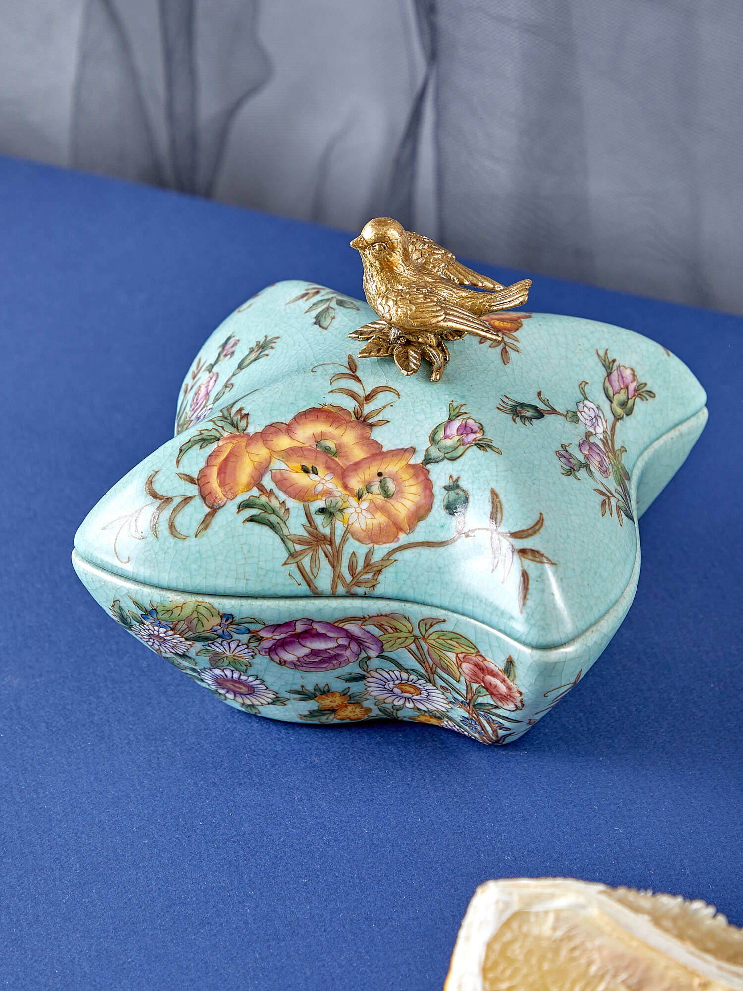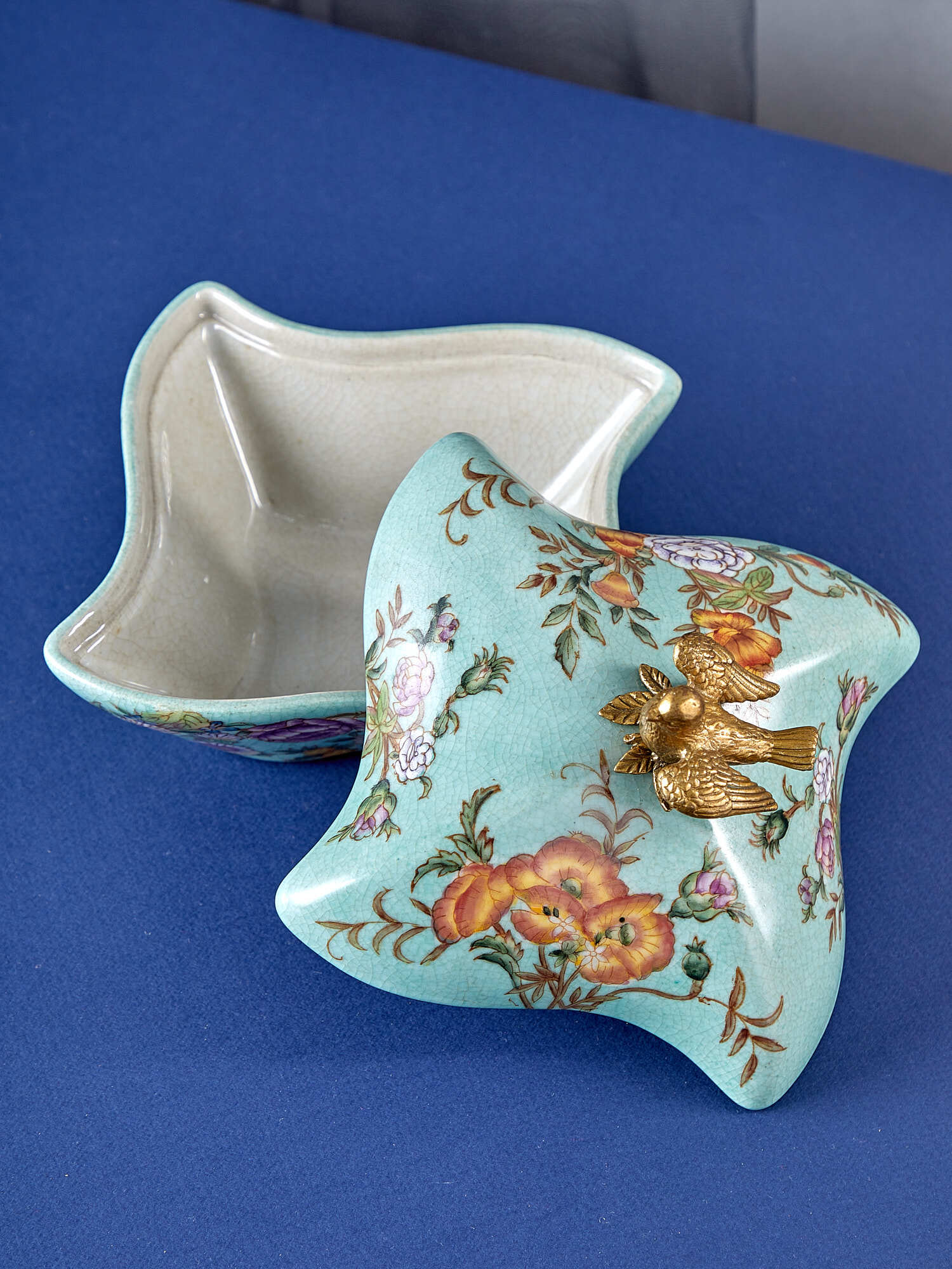 Шкатулка с птичкой, выполненная из фарфора с бронзовыми элементами. Уникальное изделие ручной работы. При производстве этих художественных изделий из фарфора с бронзой используются вековые традиции китайских мастеров. Видимые трещинки (кракелюры) делаются по уникальной технологии, что придает более благородный вид старинного изделия.