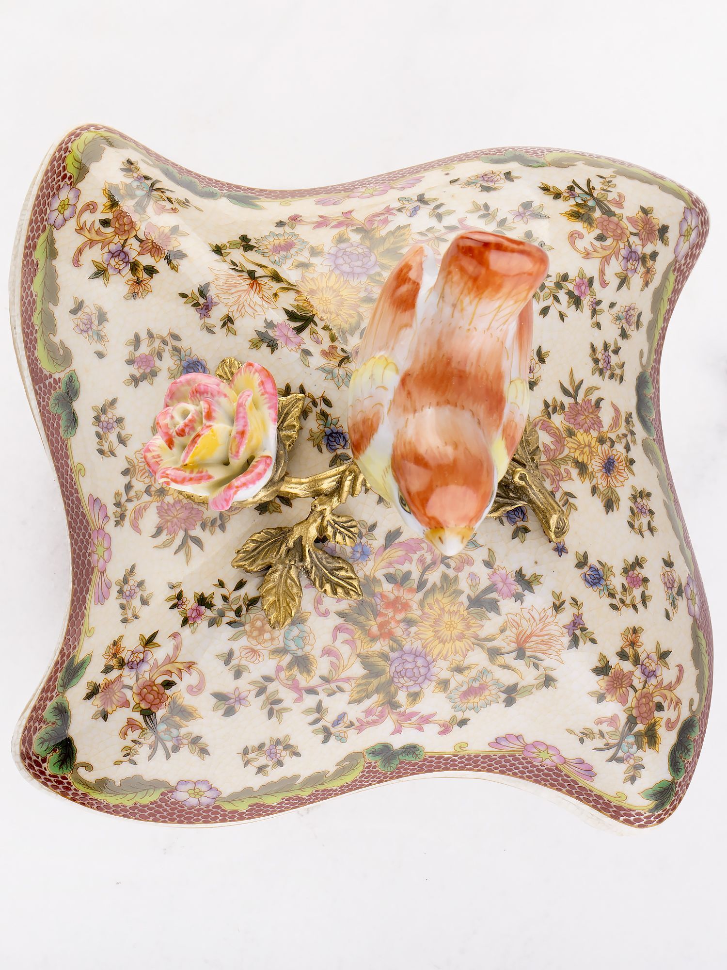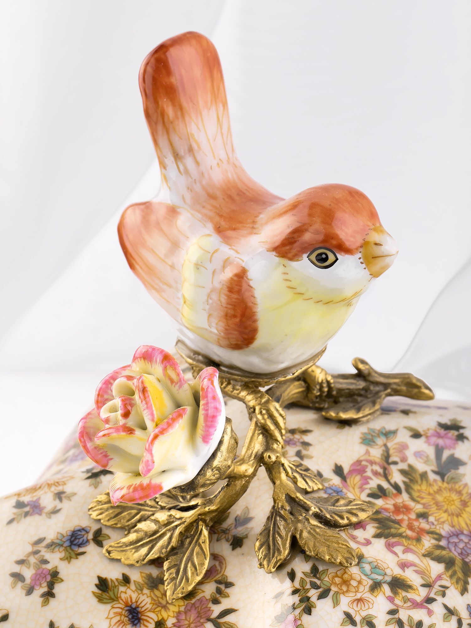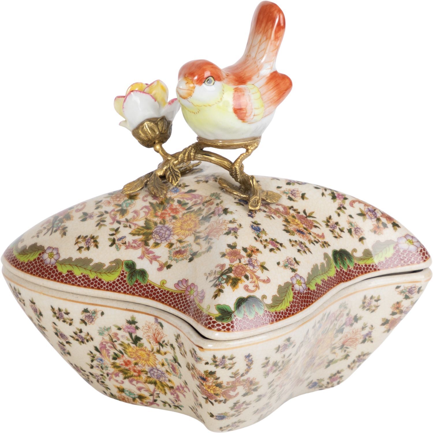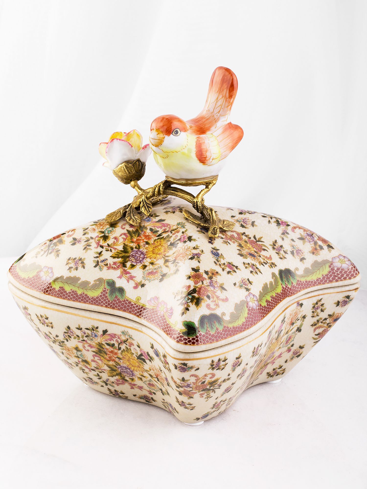 Шкатулка с птичкой, выполненная из фарфора с бронзовыми элементами. Уникальное изделие ручной работы. При производстве этих художественных изделий из фарфора с бронзой используются вековые традиции китайских мастеров. Видимые трещинки (кракелюры) делаются по уникальной технологии, что придает более благородный вид старинного изделия.