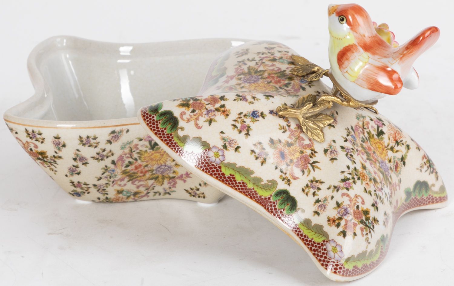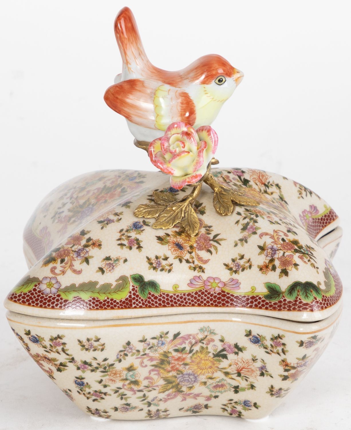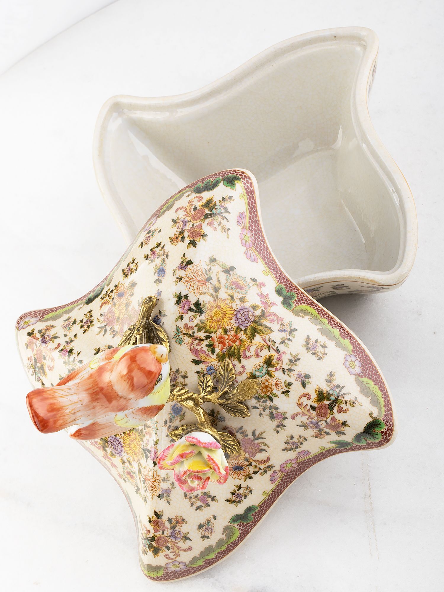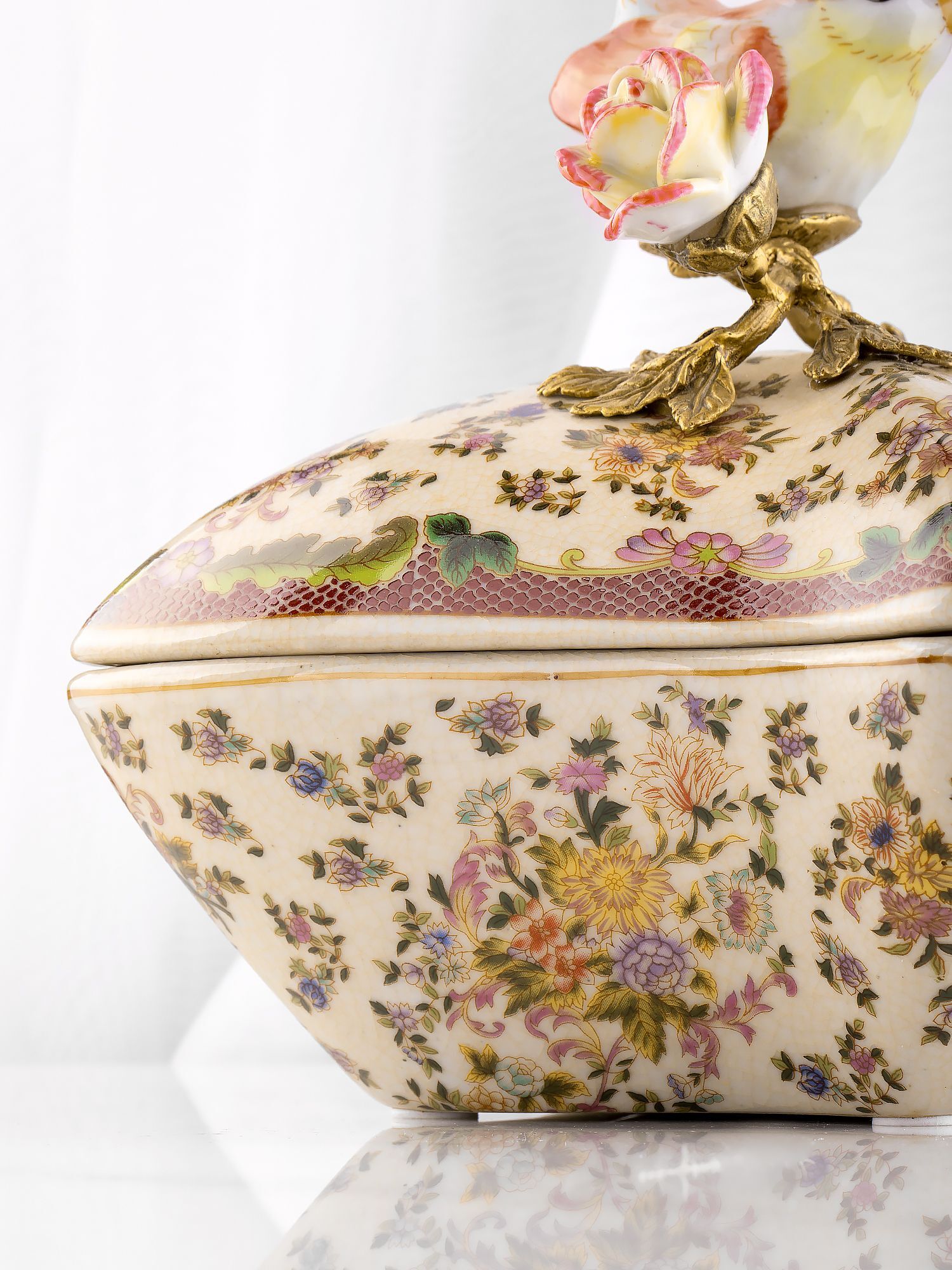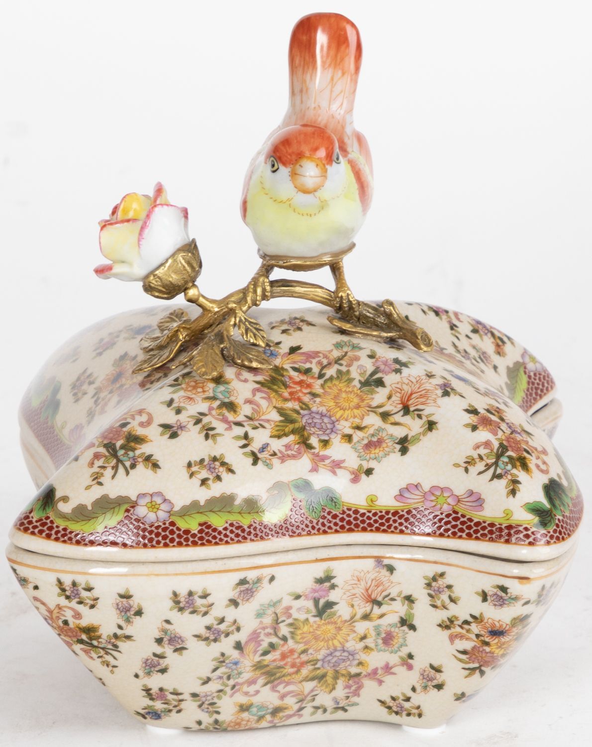 Шкатулка с птичкой, выполненная из фарфора с бронзовыми элементами. Уникальное изделие ручной работы. При производстве этих художественных изделий из фарфора с бронзой используются вековые традиции китайских мастеров. Видимые трещинки (кракелюры) делаются по уникальной технологии, что придает более благородный вид старинного изделия.