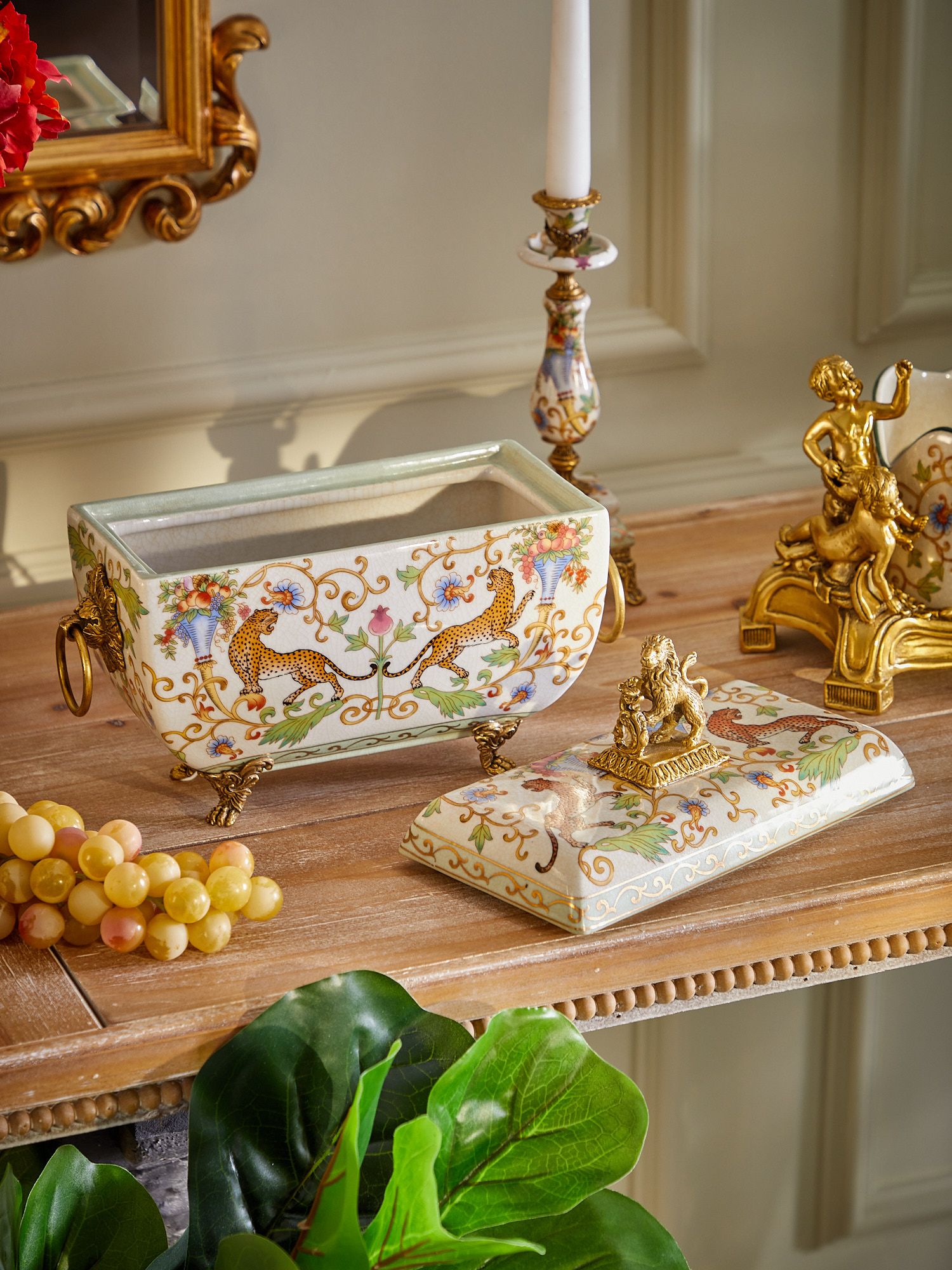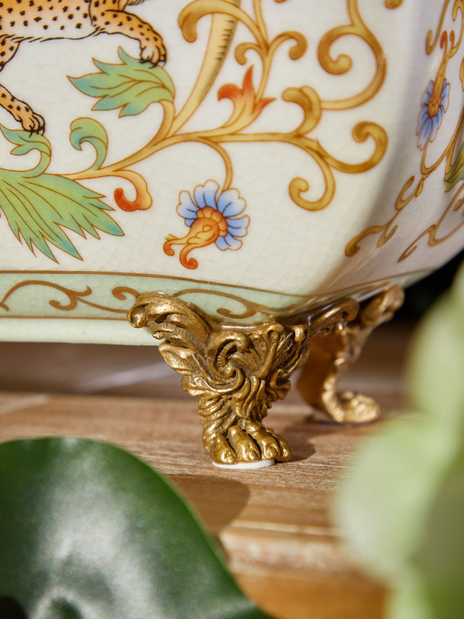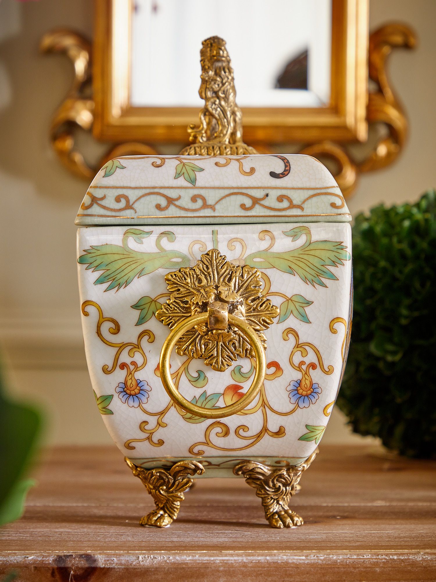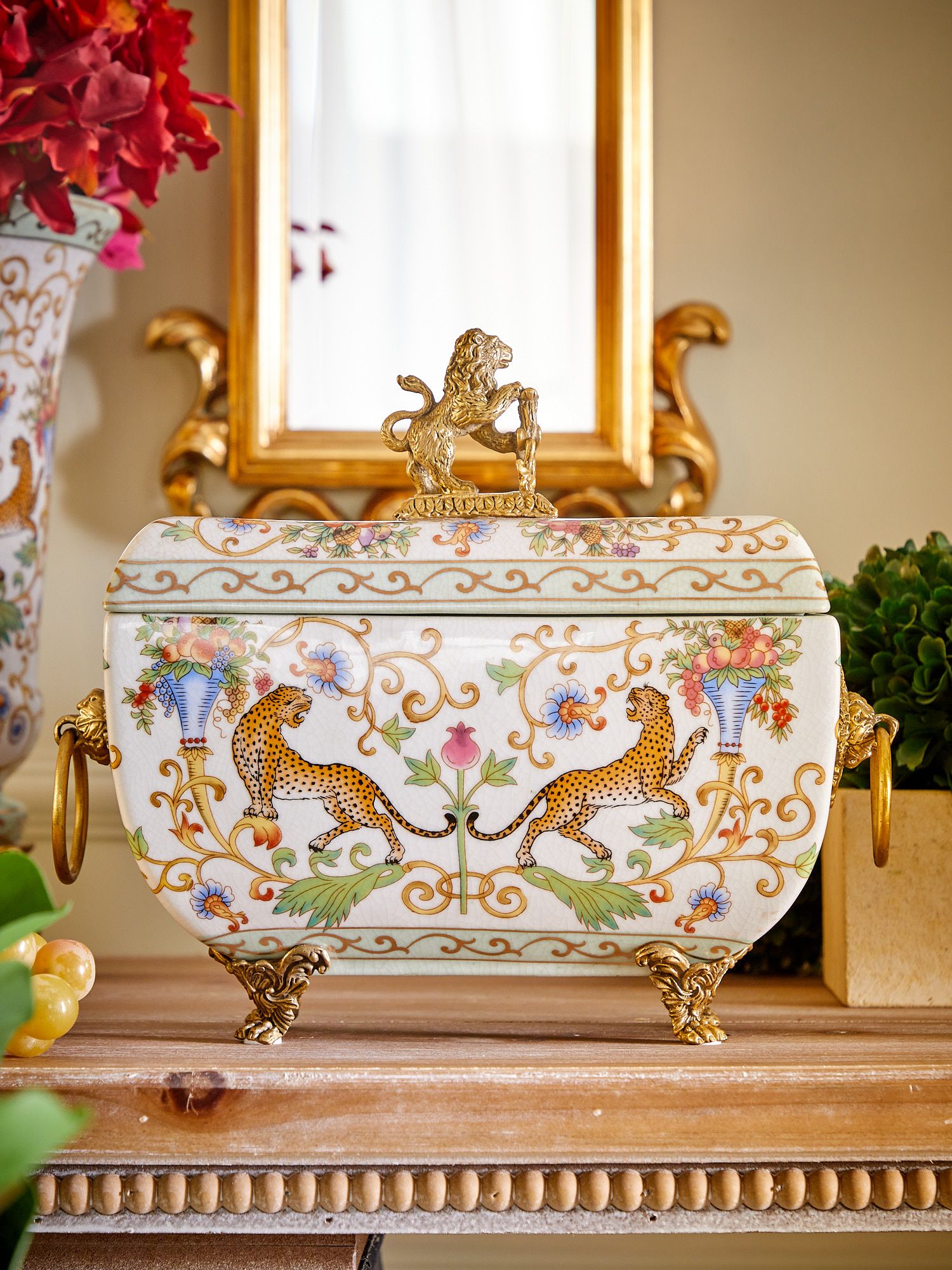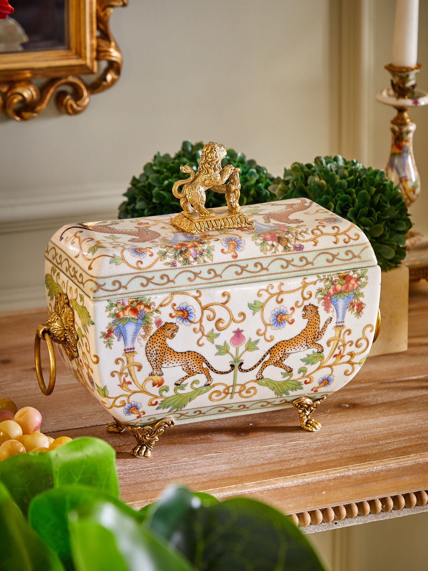 Шкатулка со львом, выполненная из фарфора с бронзовыми элементами. Уникальное изделие ручной работы. При производстве этих художественных изделий из фарфора с бронзой используются вековые традиции китайских мастеров. Видимые трещинки (кракелюры) делаются по уникальной технологии, что придает более благородный вид старинного изделия.