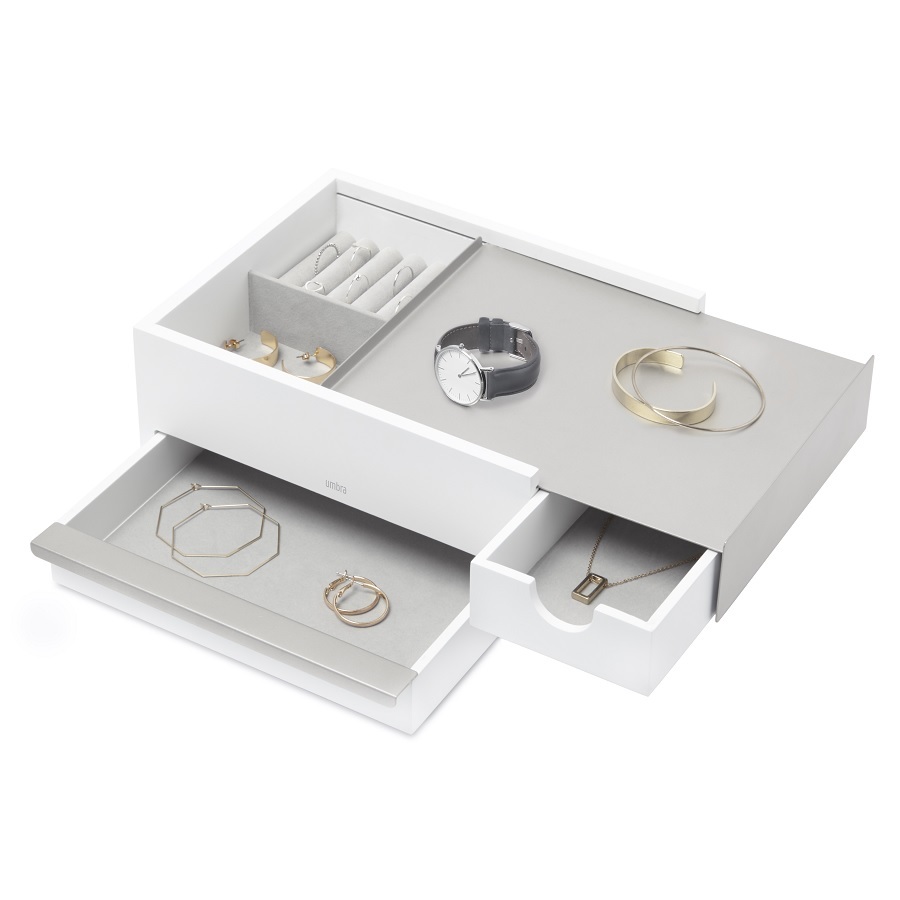 Верхнее отделение оснащено кармашками для колец или запонок и небольшими ящичками для прочих мелочей. Нижняя часть предназначена для хранения более крупных аксессуаров: часов или браслетов."