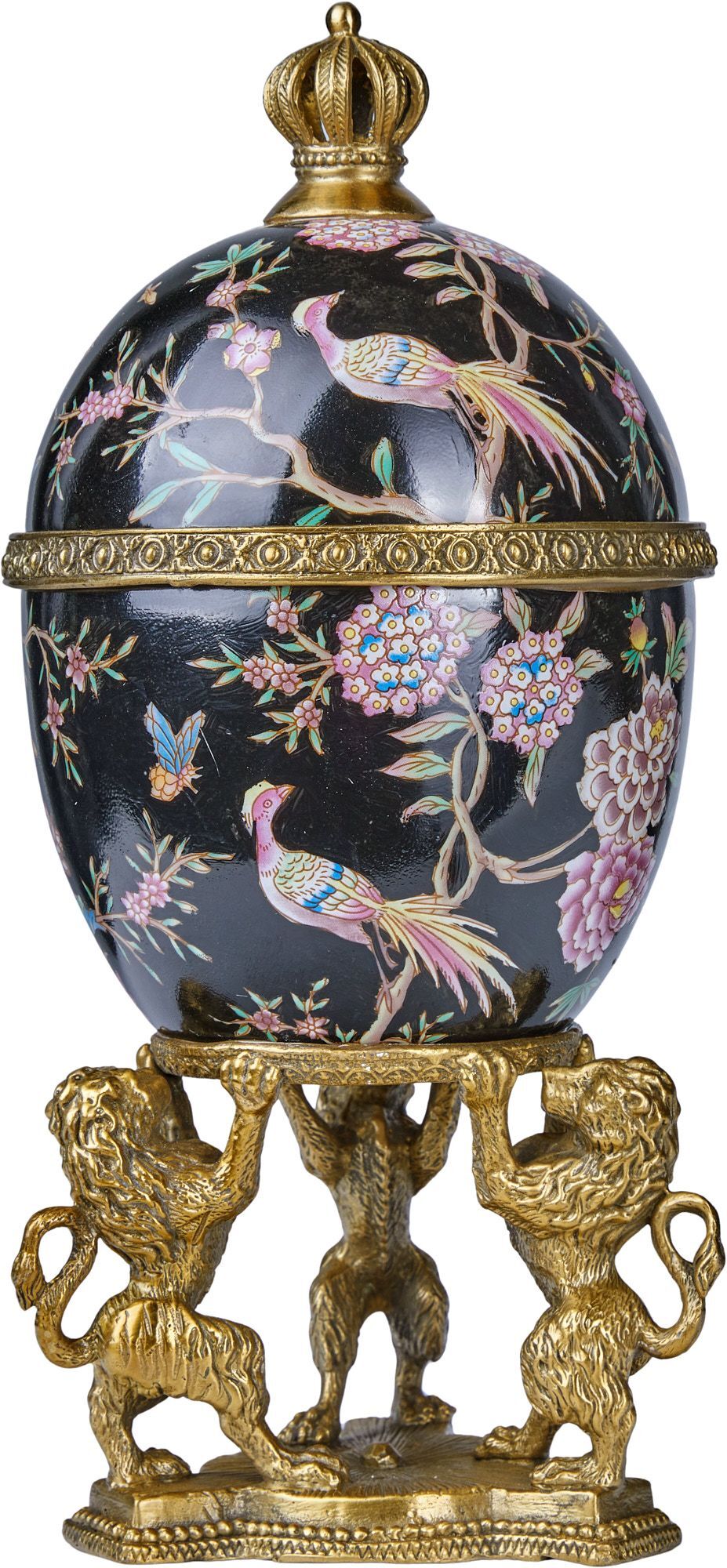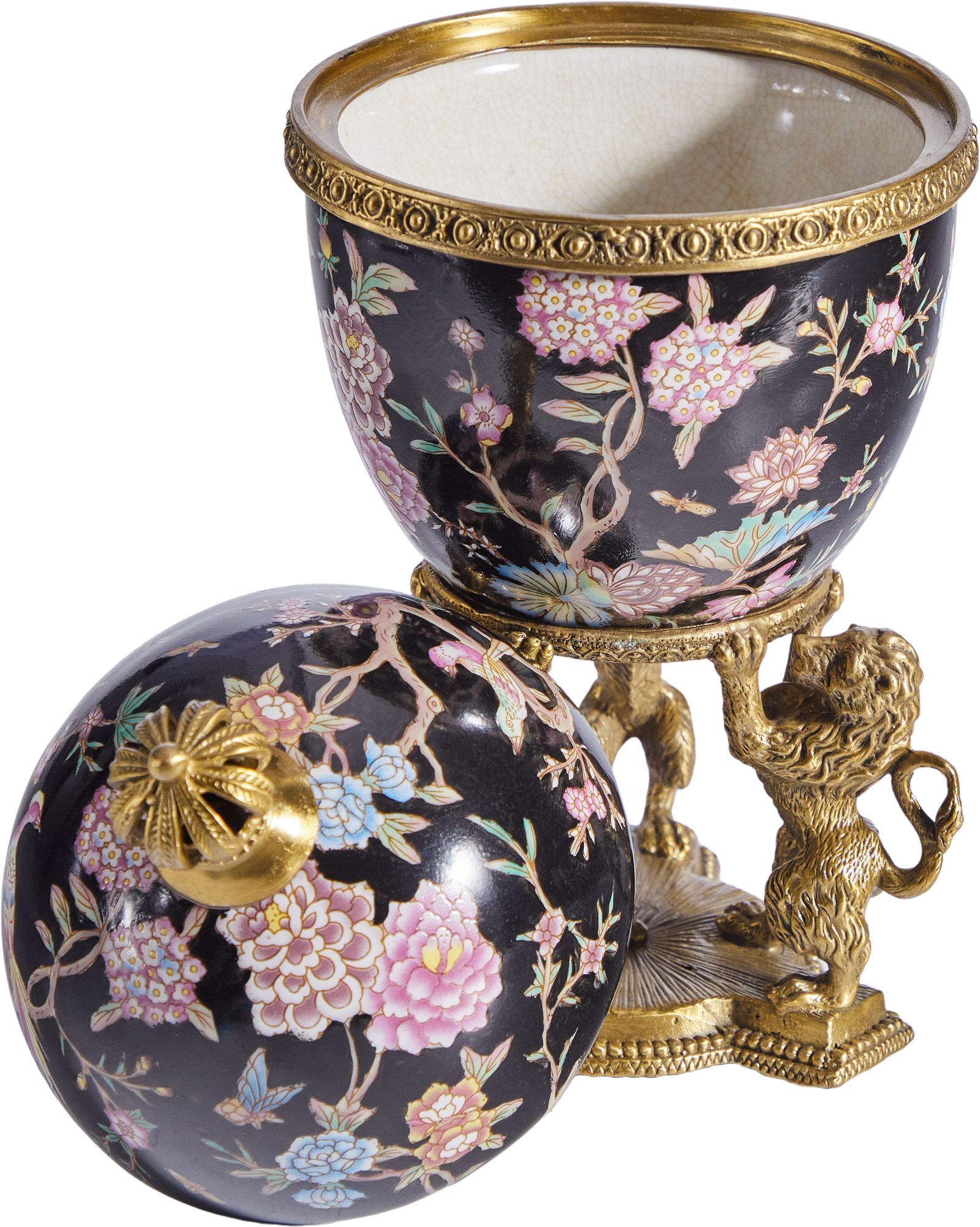 Шкатулка на величественных львах, выполненная из фарфора с бронзовыми элементами. Уникальное изделие ручной работы. При производстве этих художественных изделий из фарфора с бронзой используются вековые традиции китайских мастеров. Видимые трещинки (кракелюры) делаются по уникальной технологии, что придает более благородный вид старинного изделия.