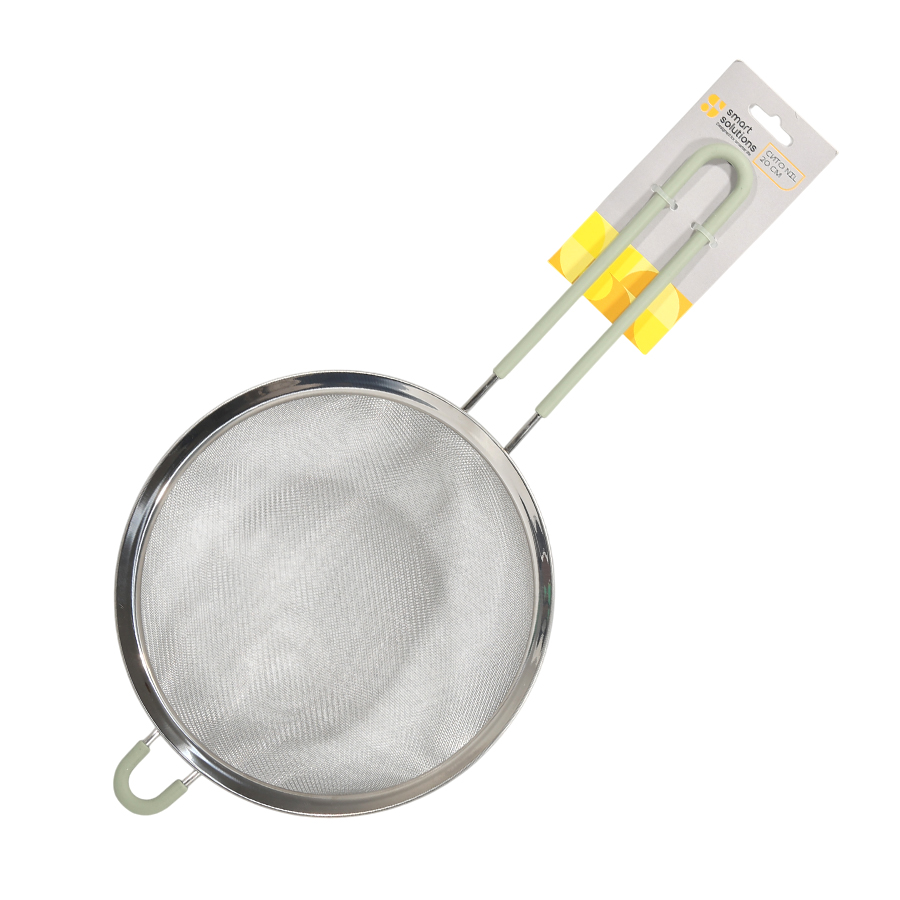 "Сито из нержавеющей стали диаметром 20 см с ручкой и широким ободком подойдет для просеивания пудры, муки, какао, кофе и других мелких сыпучих продуктов. Его можно использовать, чтобы украсить сахарной пудрой выпечку, промыть и протереть ягоды, профильтровать жидкость от мякоти и ненужных остатков. Прибор также подойдет для сливания макарон, риса и других круп. Удобная стальная петля с силиконовой насадкой надежно удерживает сито на кастрюле или другой посуде, не давая соскользнуть, а также может использоваться для навески.
