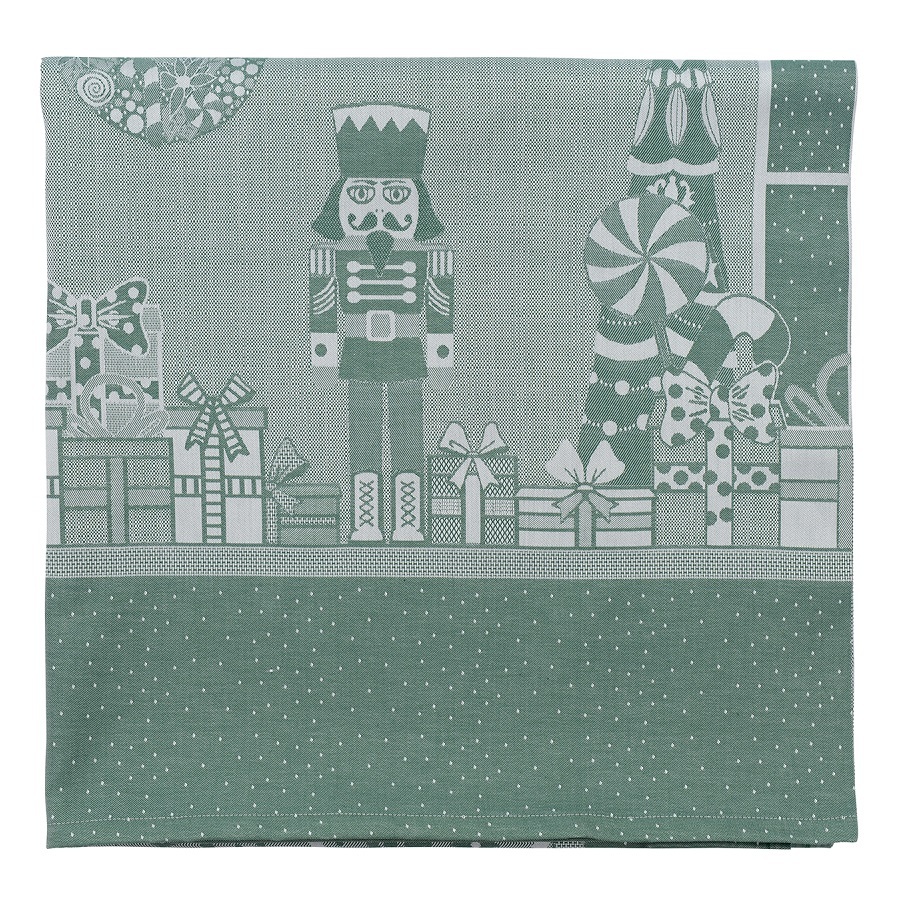 "Скатерть из хлопка зеленого цвета с жаккардовым , ,рисунком Щелкунчик из коллекции New Year Essential украсит праздничный новогодний стол и внесет разнообразие в повседневную зимнюю сервировку. Новогодняя сказка, любимая всеми с детства, стилизованная в оригинальном дизайне скатерти, органично впишется в любой современный интерьер. Модель выполнена из плотного хлопка - прочного материала, который хорошо впитывает влагу и не деформируется после множества стирок.