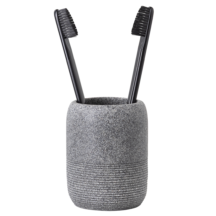 "Стакан для зубных щеток Loup имеет корпус из полирезина, стилизованного под натуральный камень графитового оттенка.
