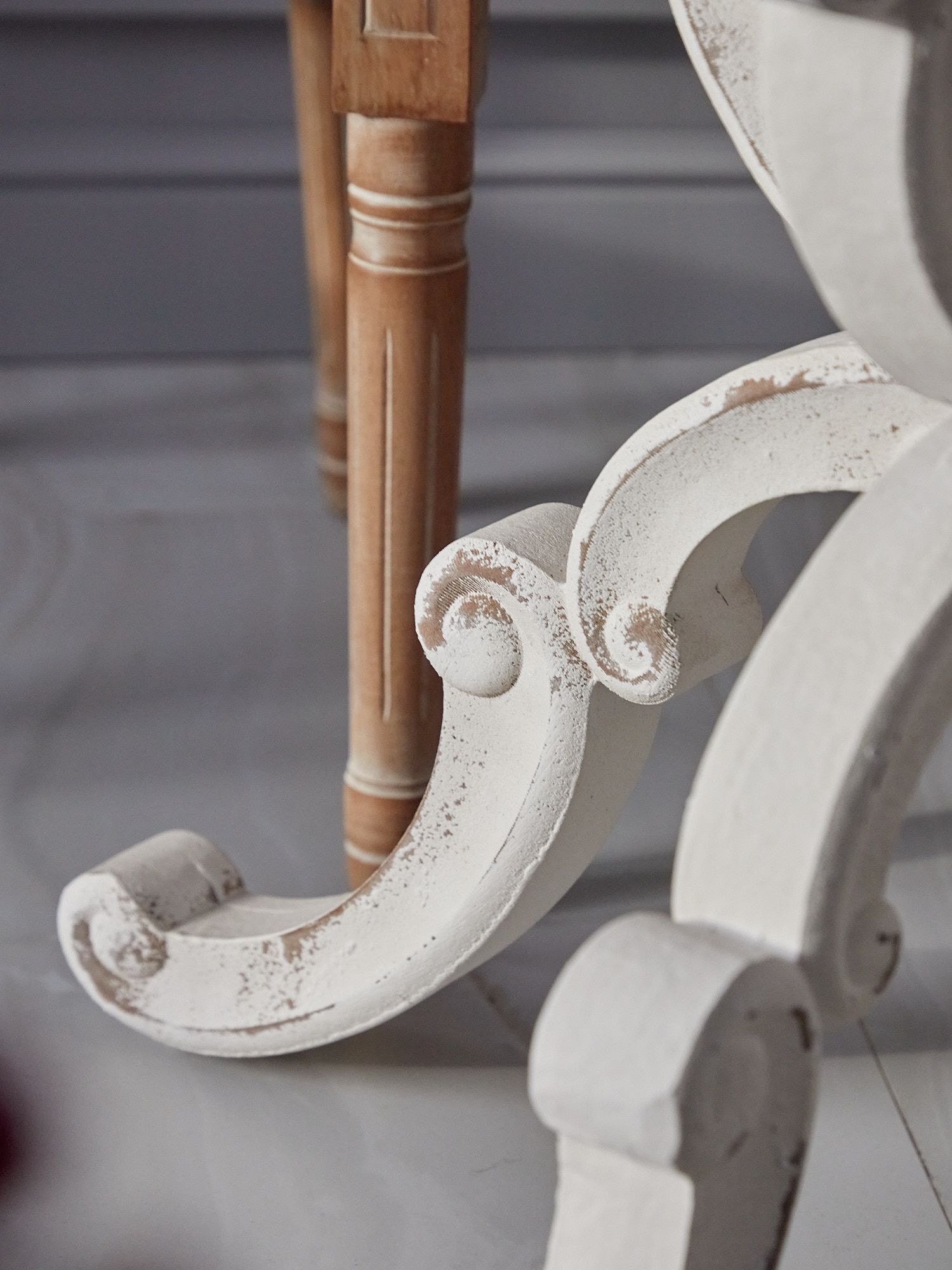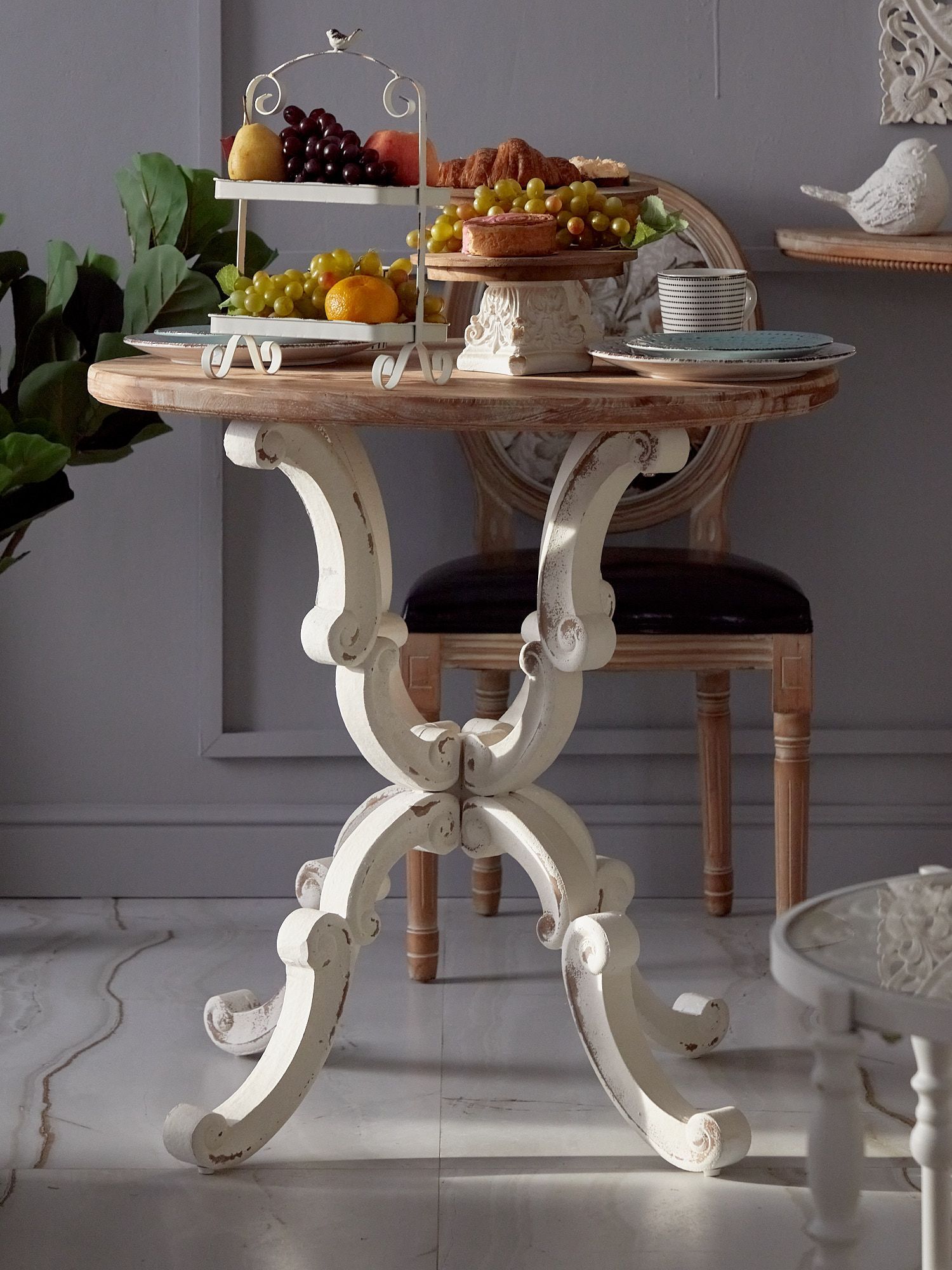 Обеденный стол с круглой деревянной столешницей, винтажной белой отделкой и искусно выполненным основанием в стиле прованс, создаст особенный образ в интерьере вашего дома. Независимо от того, используется ли он в качестве небольшого обеденного стола или декора в вашей гостиной, изделие обязательно привлечет внимание всех гостей. Поверхностные потертости и неровности с эффектом реставрации, трещины и сколы краски на изделии характеризуют индивидуальный подход к производству каждого предмета, создавая задуманный дизайнером античный образ ушедших эпох.