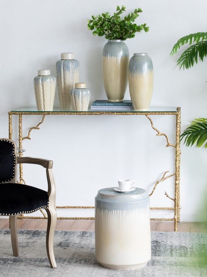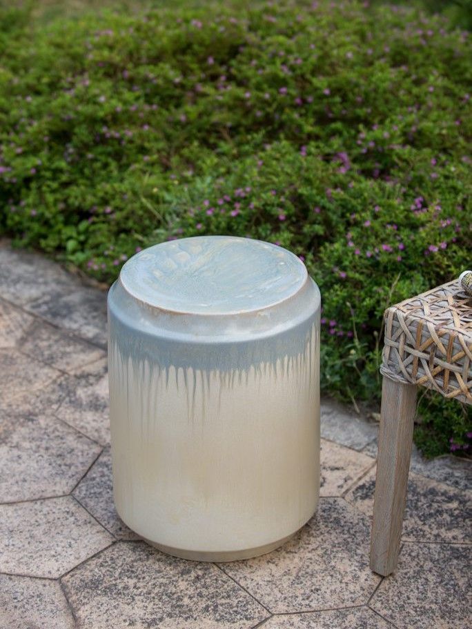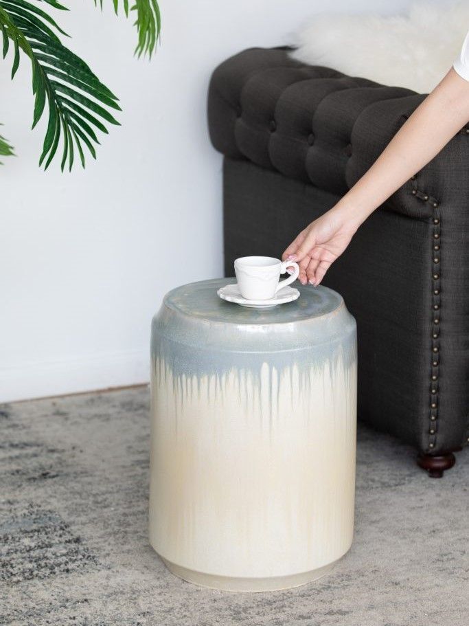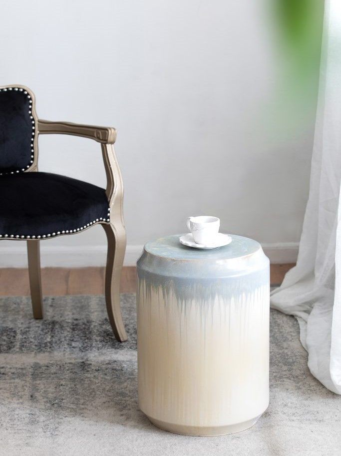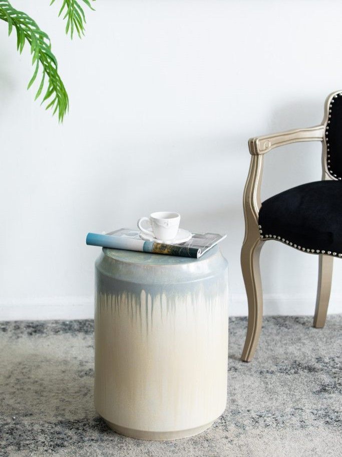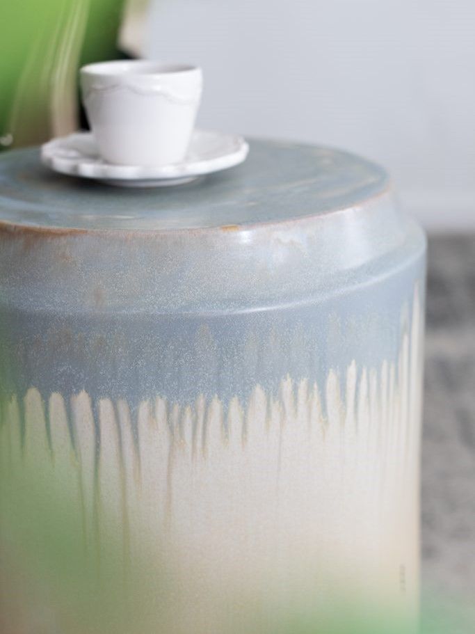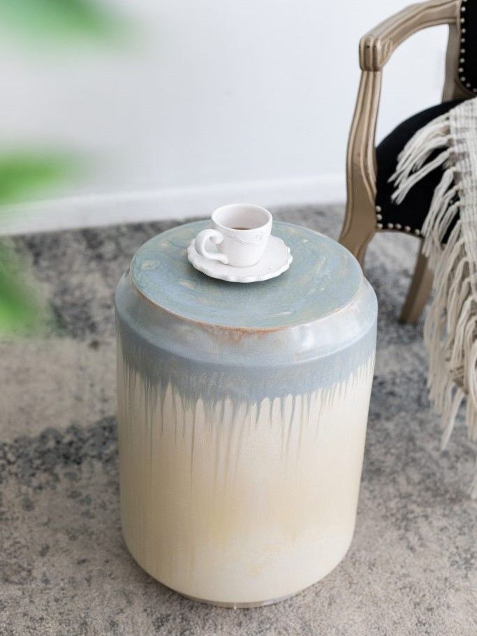 Изготовленный из керамики и покрытый многомерной глазурью в оттенках бежевого и голубого цветов, это изделие отлично подойдет в качестве акцентного столика или отдельного предмета декора.