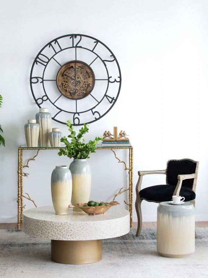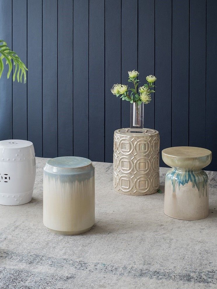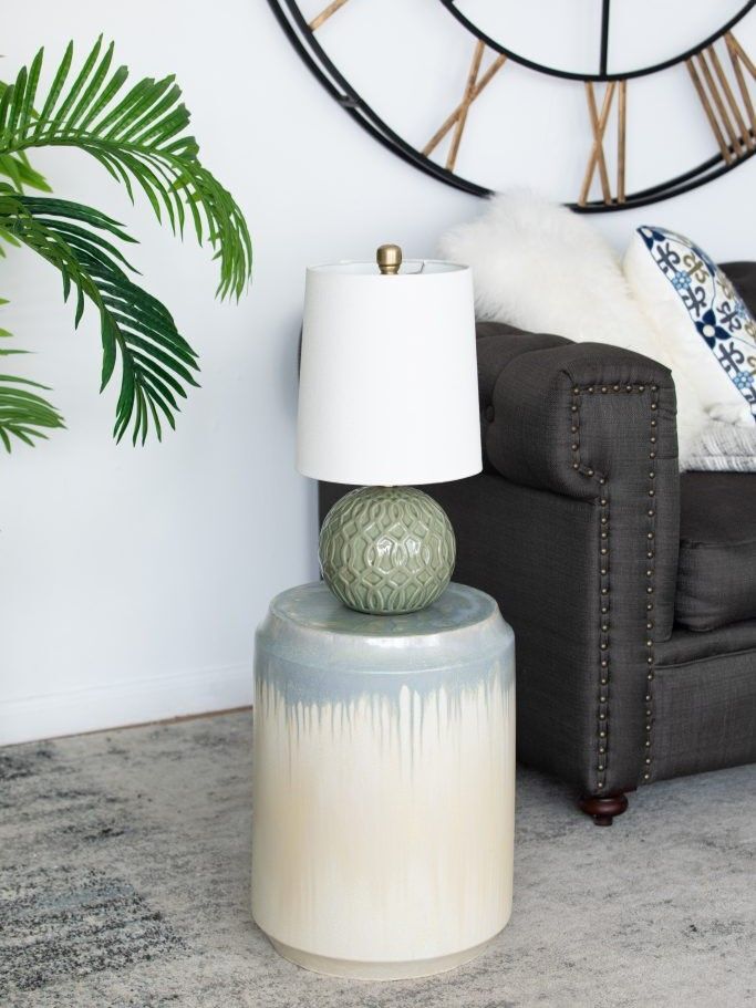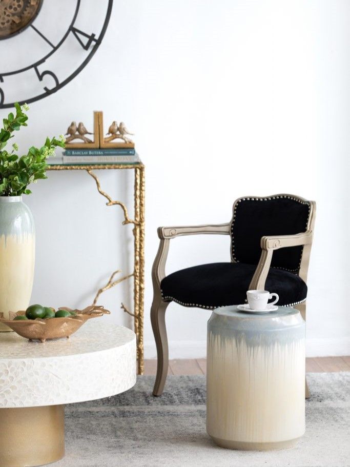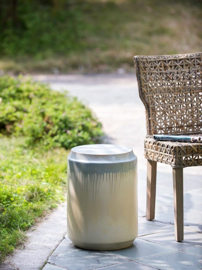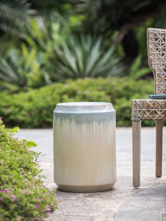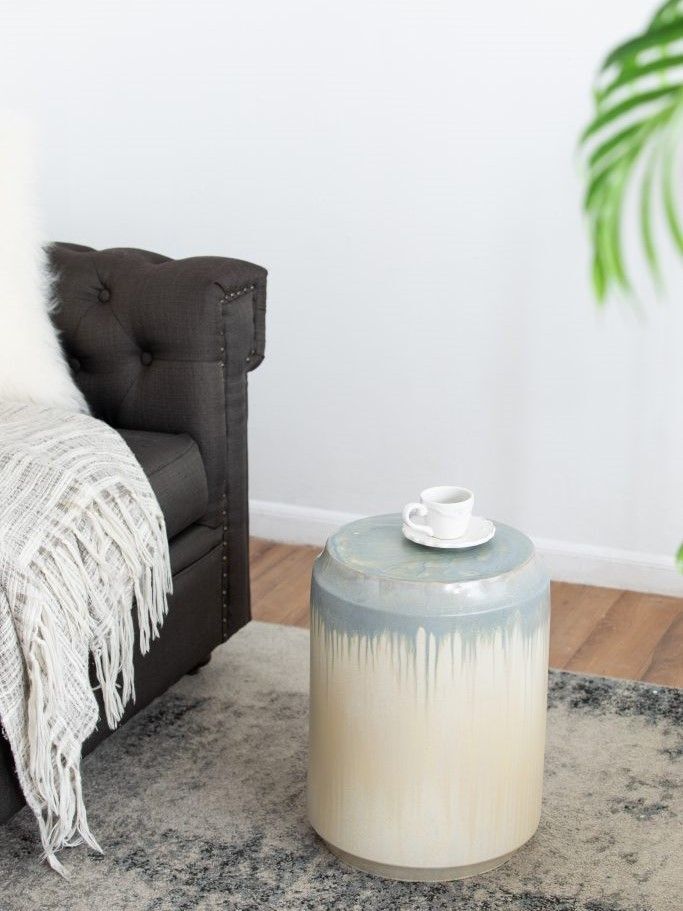 Изготовленный из керамики и покрытый многомерной глазурью в оттенках бежевого и голубого цветов, это изделие отлично подойдет в качестве акцентного столика или отдельного предмета декора.