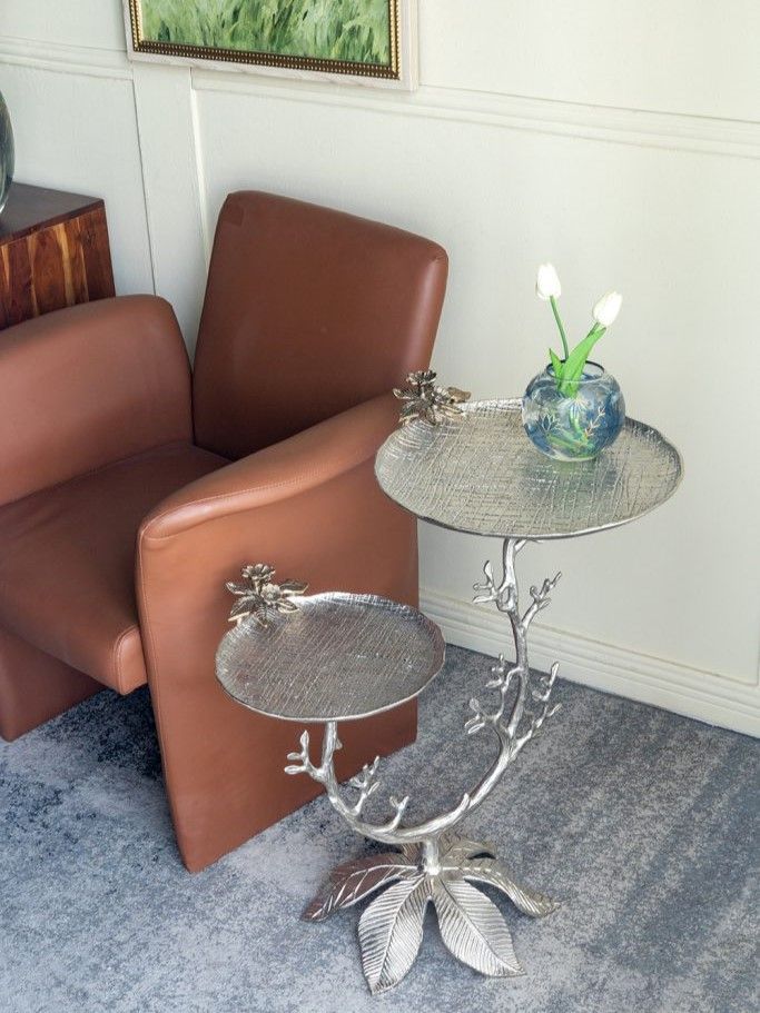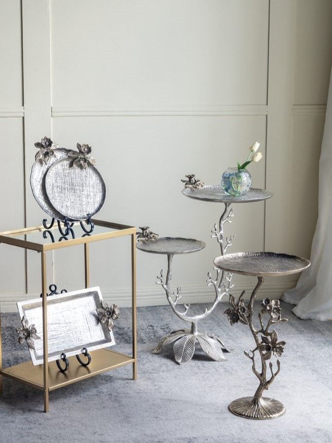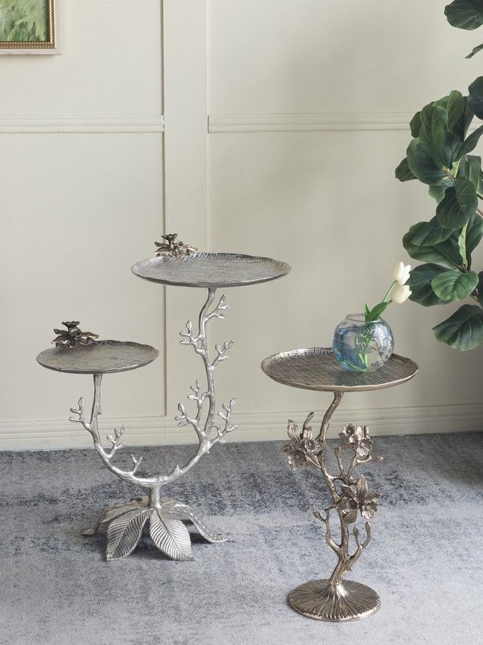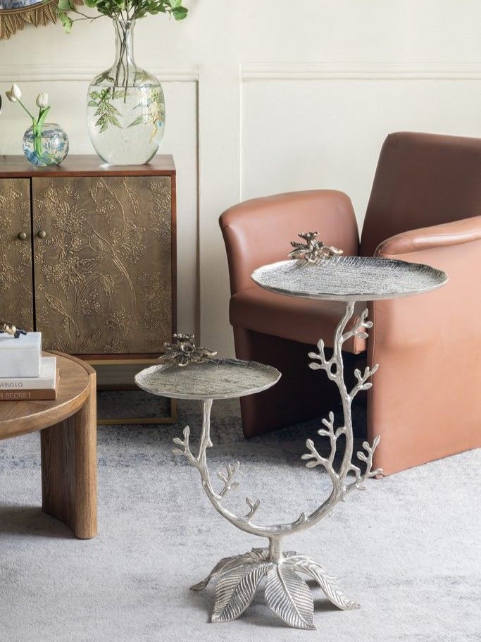 Утонченный акцентный столик имеет основание в виде изогнутых ветвей, изысканное подножие, два текстурированных подноса разных размеров и фрагментную отделку. Поставьте изделие в любом месте гостиной, в прихожей или рядом с кроватью, оно придаст вашему интерьеру нотку роскоши.