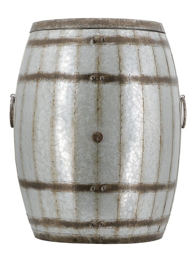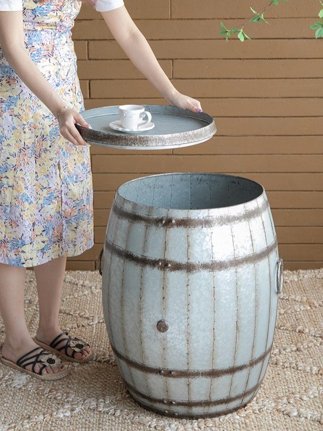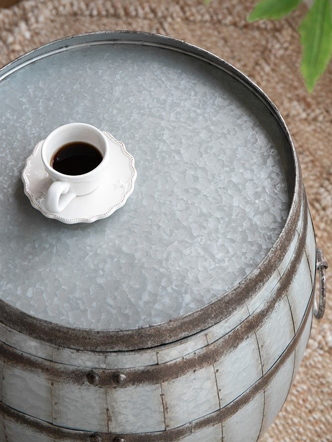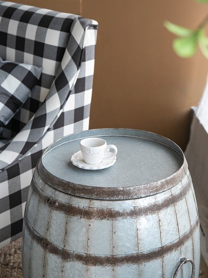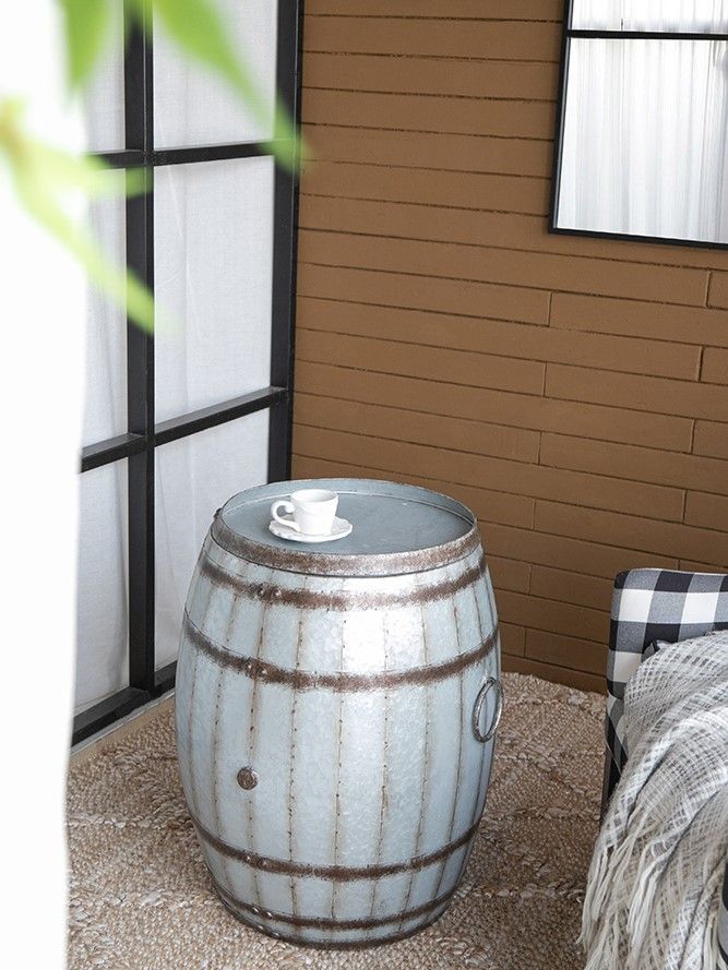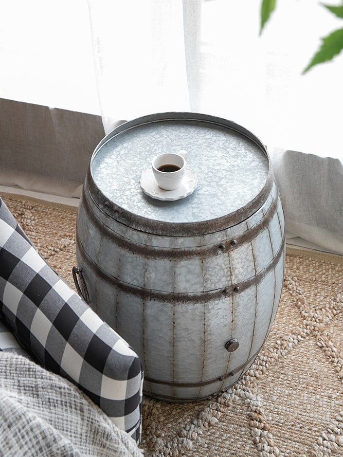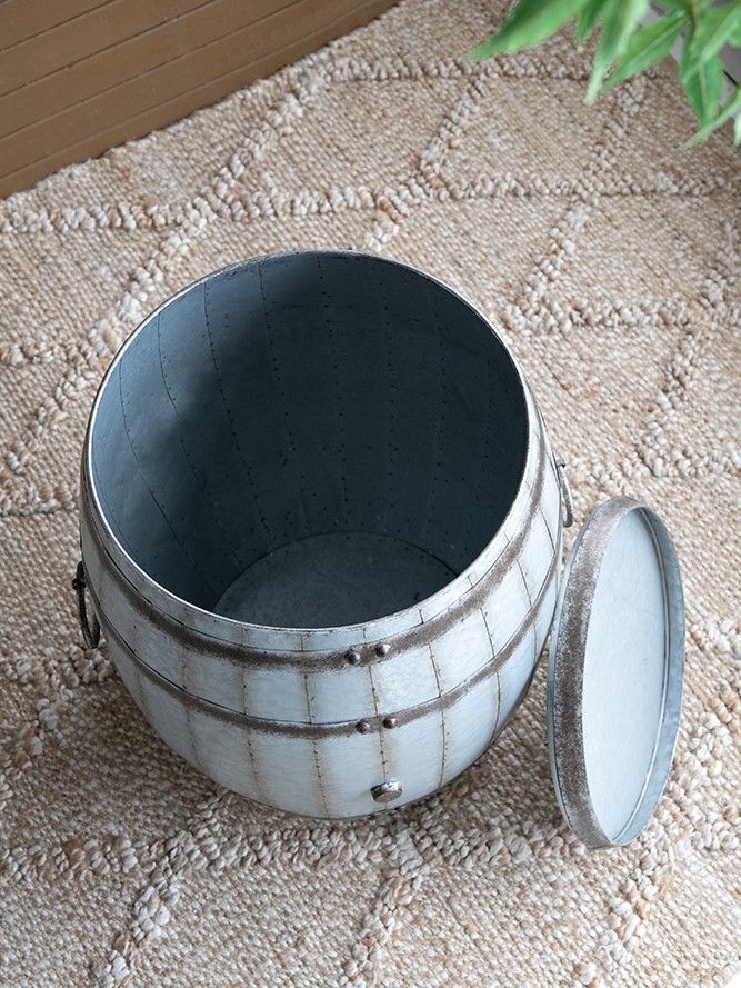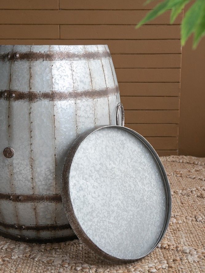 Стильный и функциональный интерьерный столик создан как компактное место для размещения в доме и хранения любимых вещей. Форма бочки с оцинкованной серой отделкой, подчеркнутая коричневыми полосами и заклепками в винтажном стиле, обеспечит яркий акцент в пространстве, а съемная крышка при необходимости может использоваться как лоток.