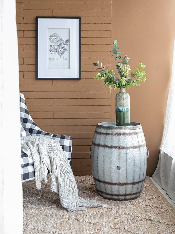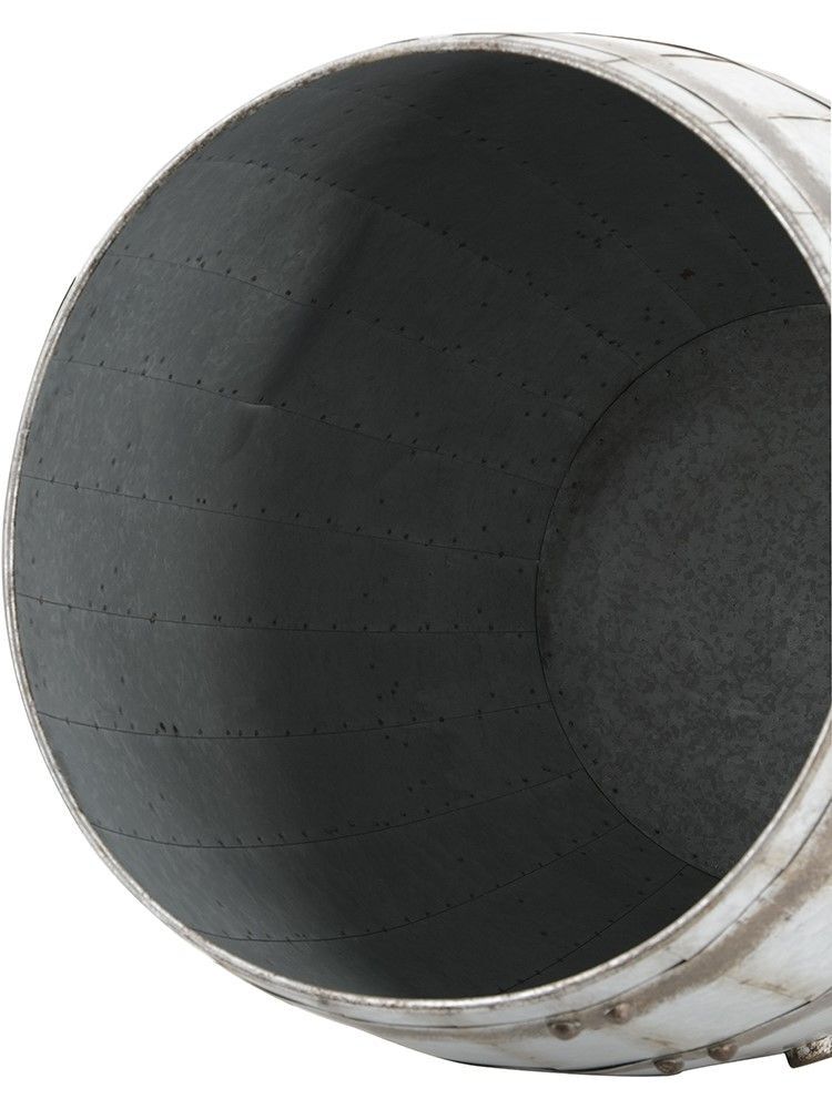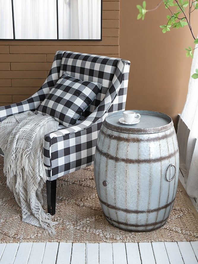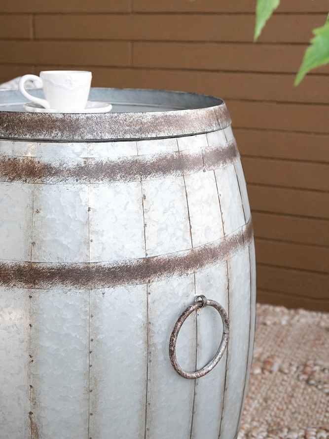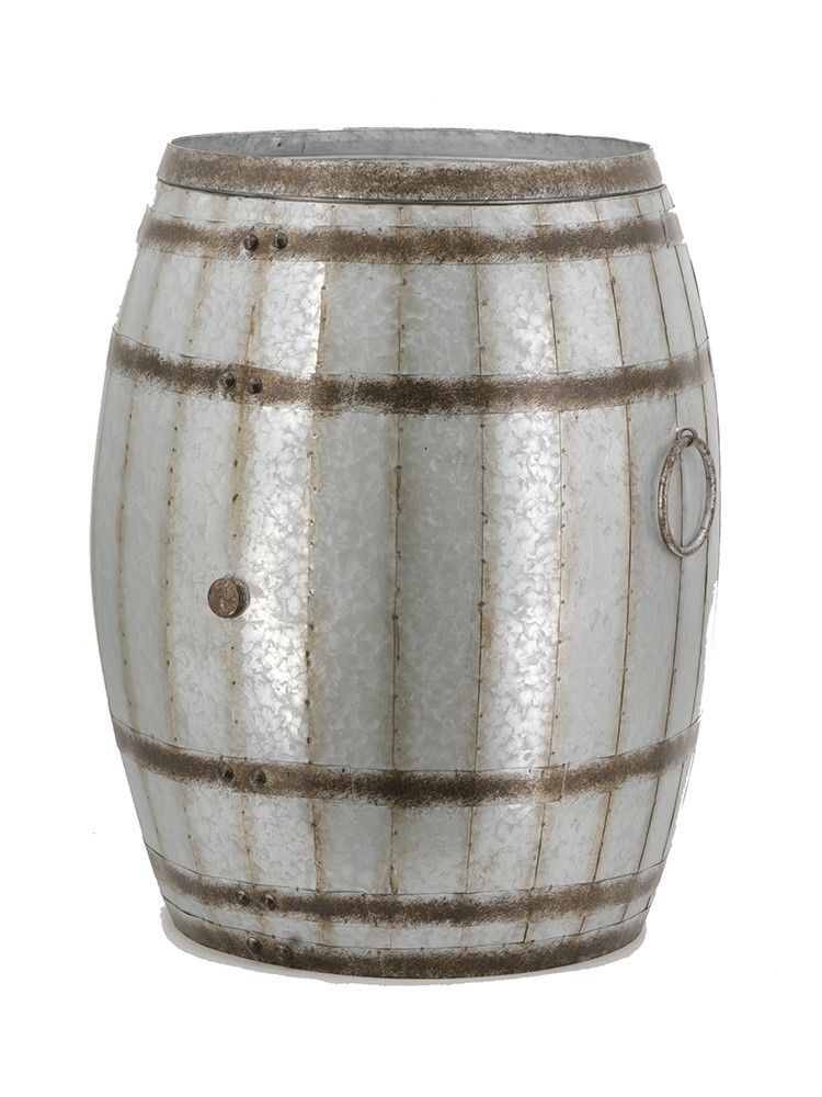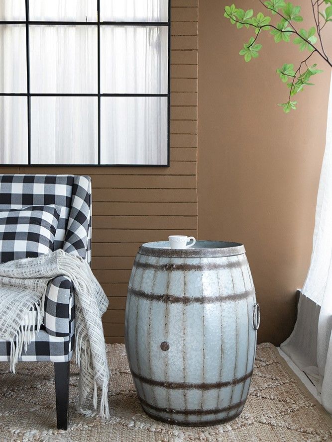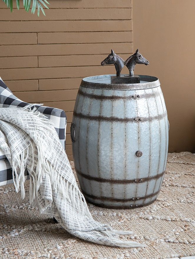 Стильный и функциональный интерьерный столик создан как компактное место для размещения в доме и хранения любимых вещей. Форма бочки с оцинкованной серой отделкой, подчеркнутая коричневыми полосами и заклепками в винтажном стиле, обеспечит яркий акцент в пространстве, а съемная крышка при необходимости может использоваться как лоток.