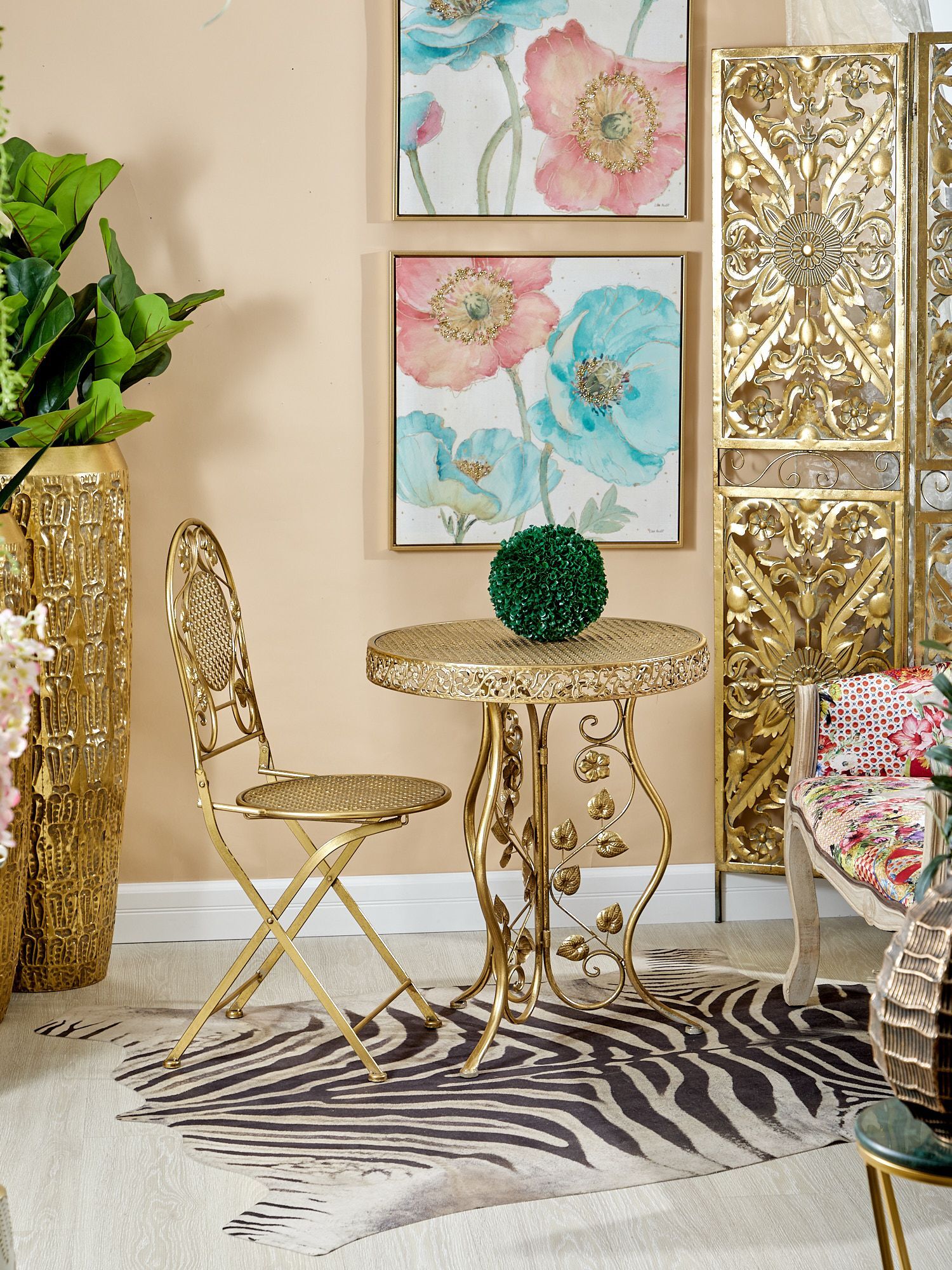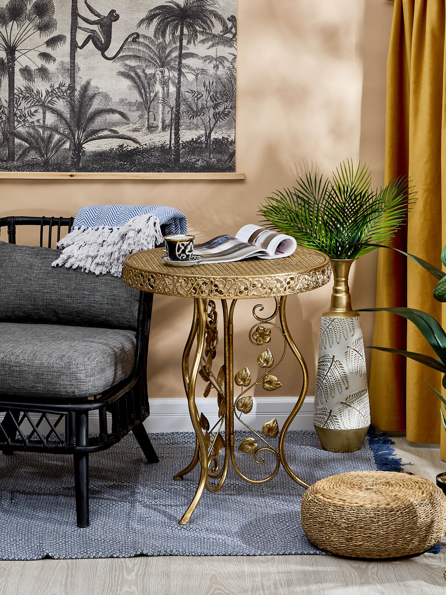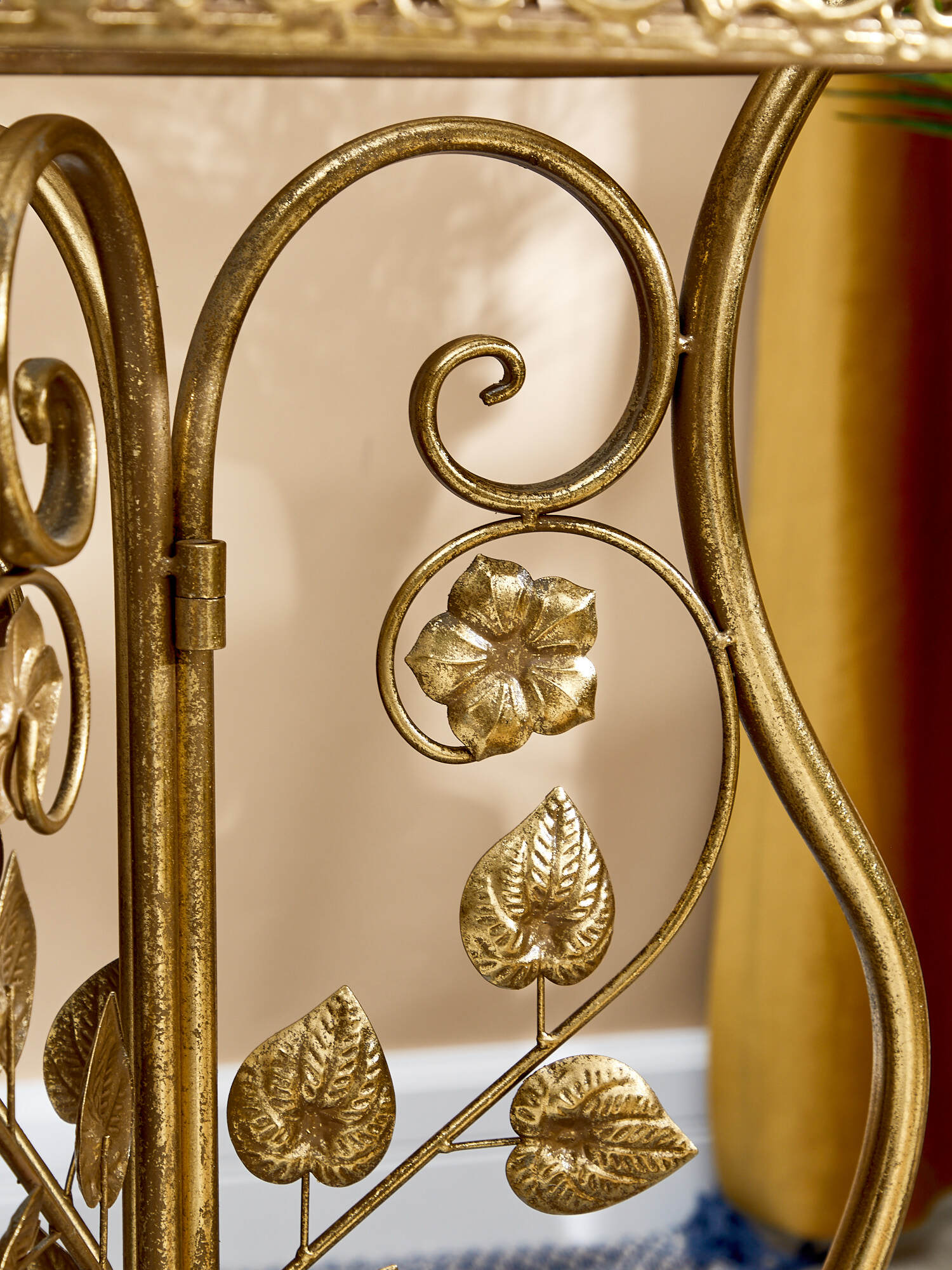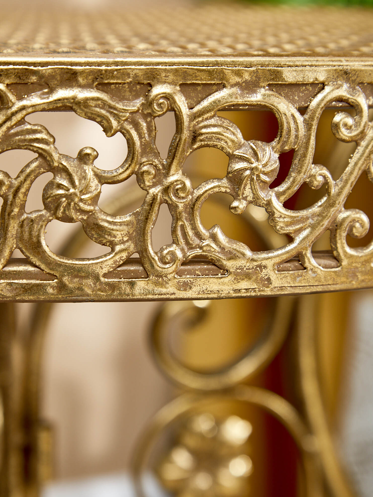 Изысканный складной столик Эфиопия, выполненный из металла в африканском стиле с напылением золотистого цвета, и украшенный орнаментом на столешнице. Изделие имеет признаки искусственного состаривания, поверхность декорирована с эффектом патинирования, а наличие сварочных фрагментов подчеркивают принадлежность к ручной работе. Оригинальная форма столика подчеркнет ваш изысканный интерьер своей неповторимостью. Эксклюзивные формы и фактуры навеяло богатство культуры Африки, множество художественных традиций и таинственная атмосфера, окутывающая неподражаемостью.
