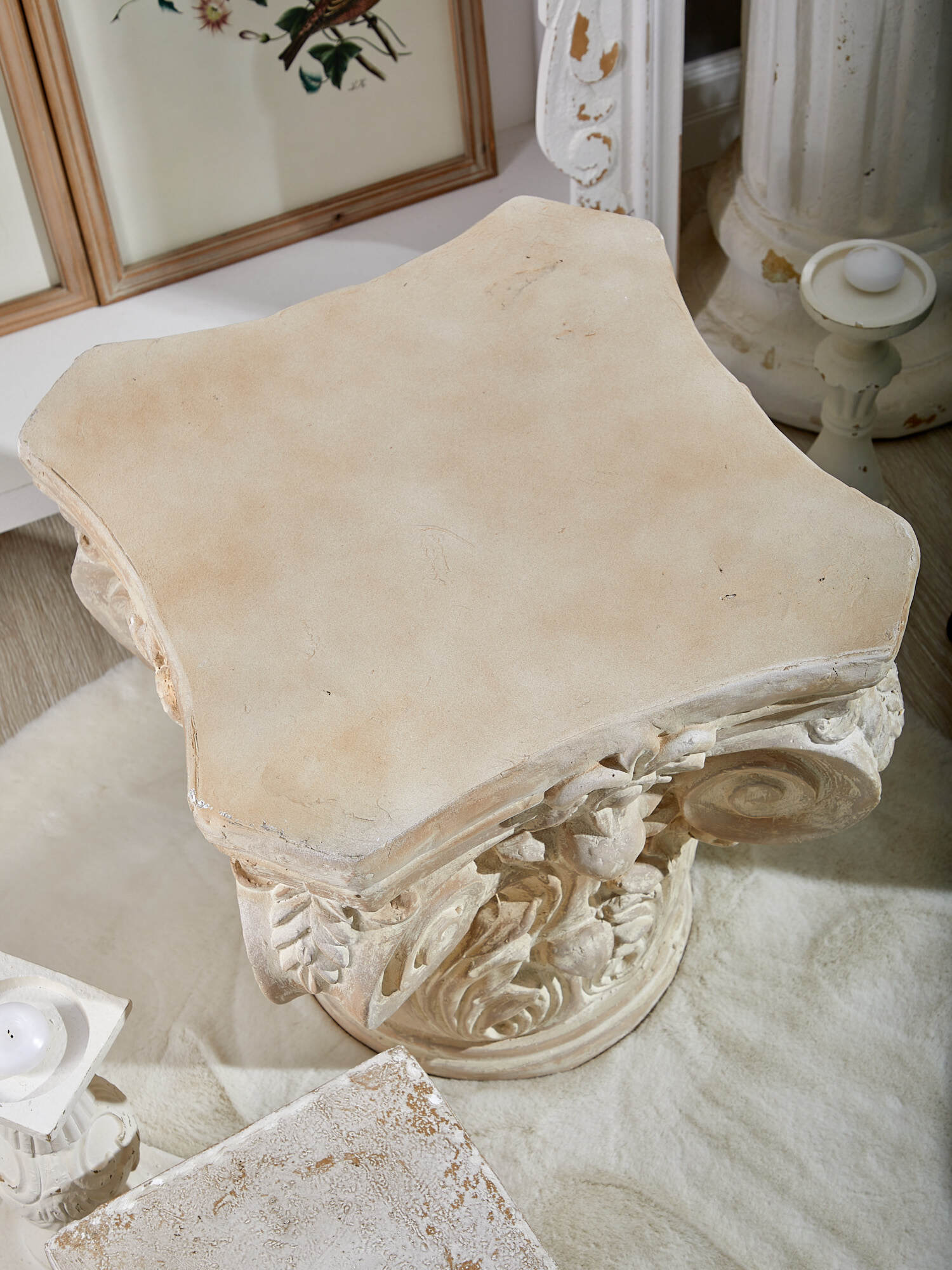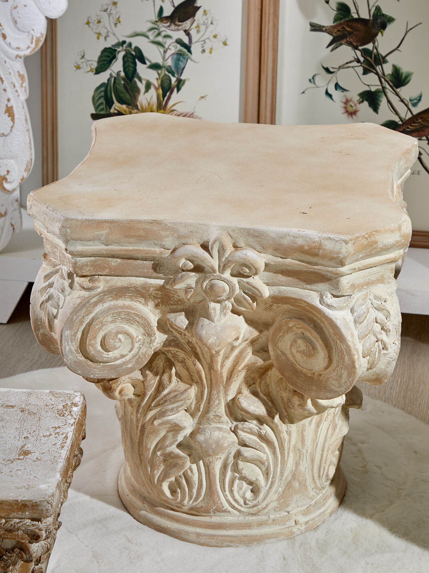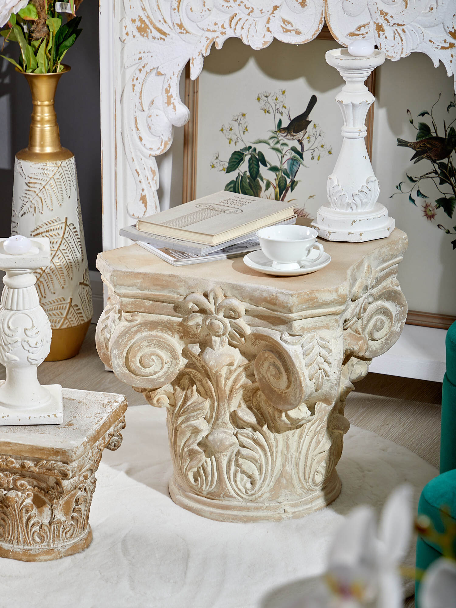 Интерьерный столик в виде капители создаст новую атмосферу в вашем доме, привнося величественный античный стиль греческих и римских эпох. Уникальная эстетика и гармония этого изделия никогда не потеряют свою актуальность, демонстрируя на своей поверхности элементы декора, цветочные композиции и другие предметы. Поверхностные потертости и неровности с эффектом реставрации, трещины и сколы краски на изделии характеризуют индивидуальный подход к производству каждого предмета, создавая задуманный дизайнером античный образ ушедших эпох.