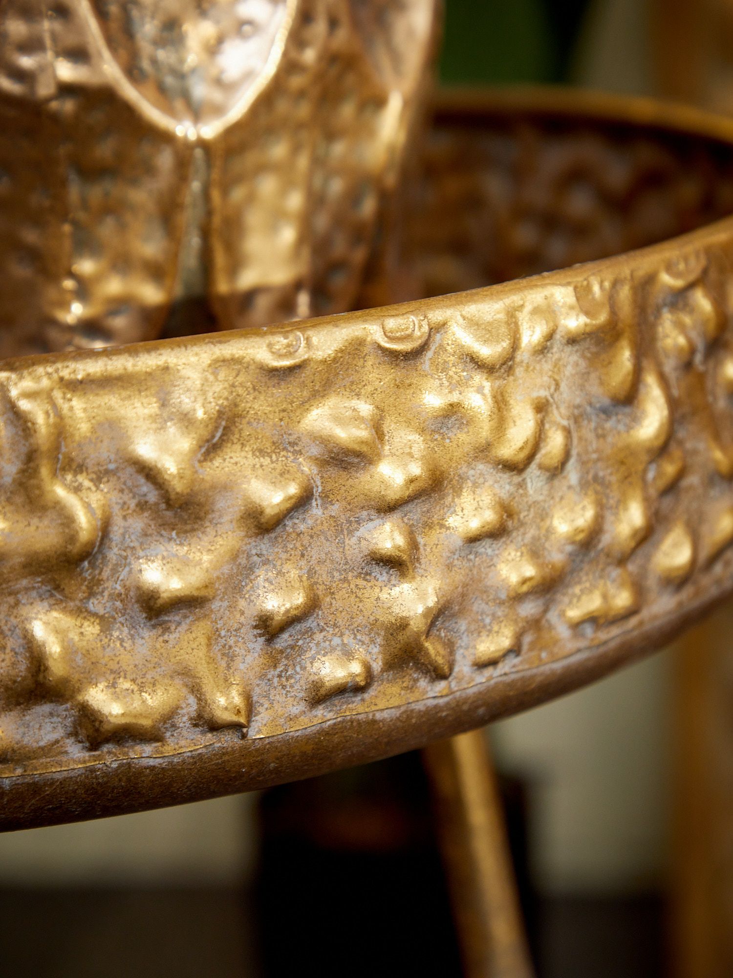 Интерьерный столик Либерия на трех ножках, выполненный из металла в африканском стиле, украшен столешницей с фактурой в виде древесной коры с эффектом под старину. Изделие имеет признаки искусственного состаривания, поверхность декорирована с эффектом патинирования, а наличие сварочных швов подчеркивают принадлежность к ручной работе. Оригинальная форма столика подчеркнет ваш изысканный интерьер своей неповторимостью. Эксклюзивные формы и фактуры навеяло богатство культуры Африки, множество художественных традиций и таинственная атмосфера, окутывающая неподражаемостью.