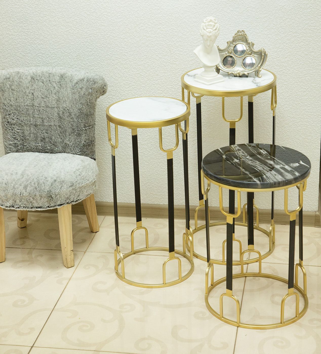 Столик, выполненный из натурального мрамора на металлическом основании, предназначен для тех, кто любит в интерьере элегантность и натуральные материалы. Круглая столешница изготовлена из мрамора белого цвета. Станет украшением интерьера в любом доме. Мрамор, как природный материал, может иметь различные рисунки прожилок, может быть шероховатым и иметь несквозные трещины и небольшие сколы по краю. Каждый предмет собирается и подгоняется вручную, по этому небольшое отклонение от края подстолья в горизонтальной или вертикальной плоскости не считается дефектом. На подстолье могут присутствовать незначительные потертости и царапины.