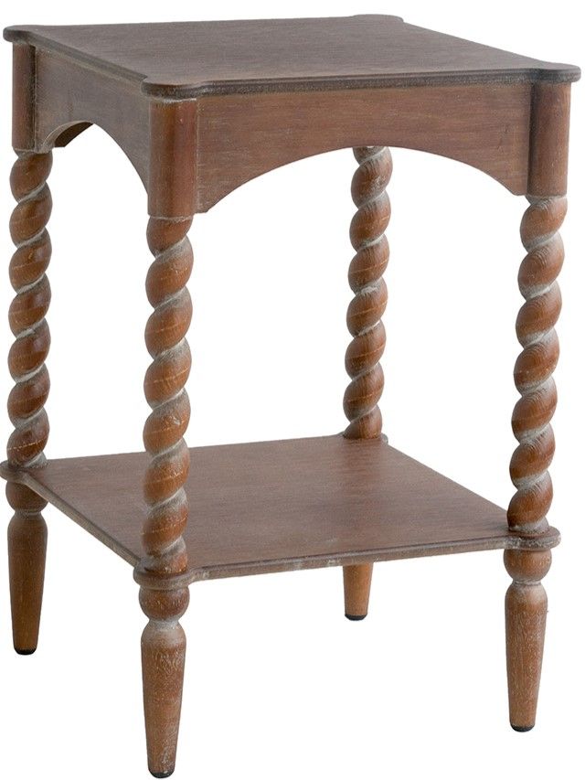 Интерьерный столик, вдохновленный винтажными техниками обработки натурального дерева, имеет текстуру коричневого цвета, четыре элегантные резные ножки и дополнительную нижнюю полку для хранения или демонстрации любимых предметов. Изготовленный из прочной древесины ели и сосны, отличается исключительной долговечностью и устойчивостью, что гарантирует долгое служение в любом доме. Чистые линии, натуральная текстура и прямоугольный силуэт позволяют использовать столик в качестве прикроватной тумбы, подставки для цветочных растений в красивых кашпо, идеально вписываясь в интерьеры в стиле кантри, традиционный, дворянский или переходный.