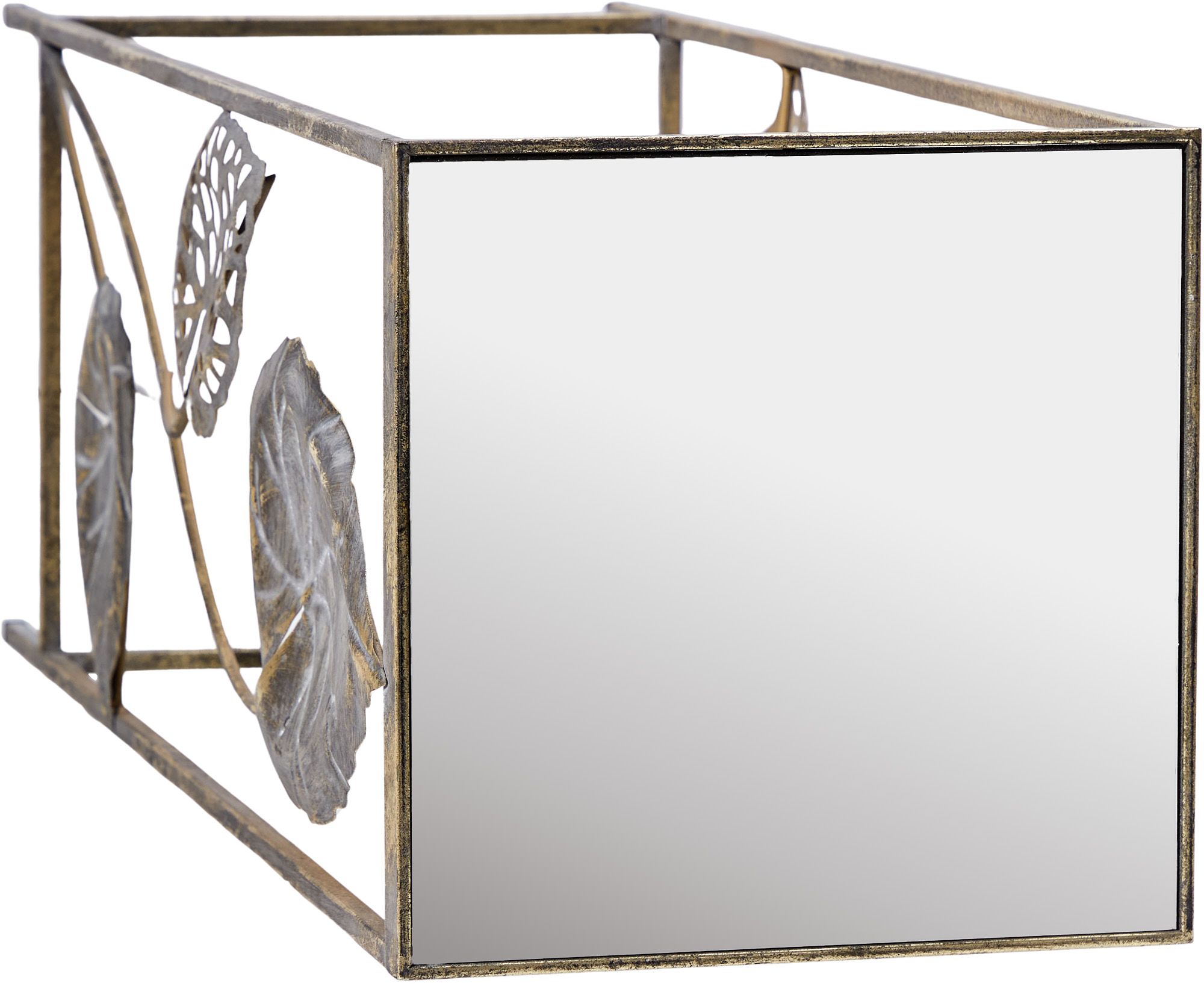 Столик с зеркальной поверхностью, выполненный из металла, увенчанный от подножия до столешницы композицией из листьев тропических растений. Изделие имеет признаки искусственного состаривания, поверхность декорирована с эффектом патинирования, а наличие сварочных швов подчеркивают принадлежность к ручной работе. Оригинальная форма столика подчеркнет ваш изысканный интерьер своей неповторимостью.