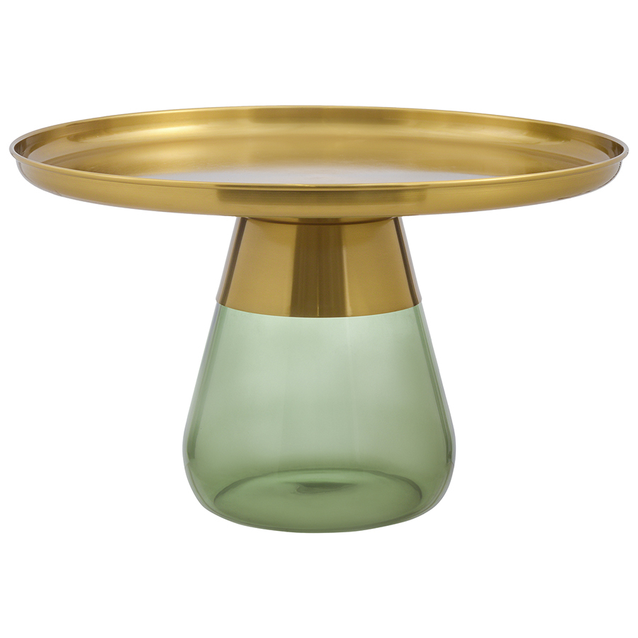 Материал: столешница – сталь, основание – закаленное стекло. Максимальная нагрузка - 10 кг. Диаметр: 70,5 см. Высота: 43 см. Цвет: латунь/зеленый.