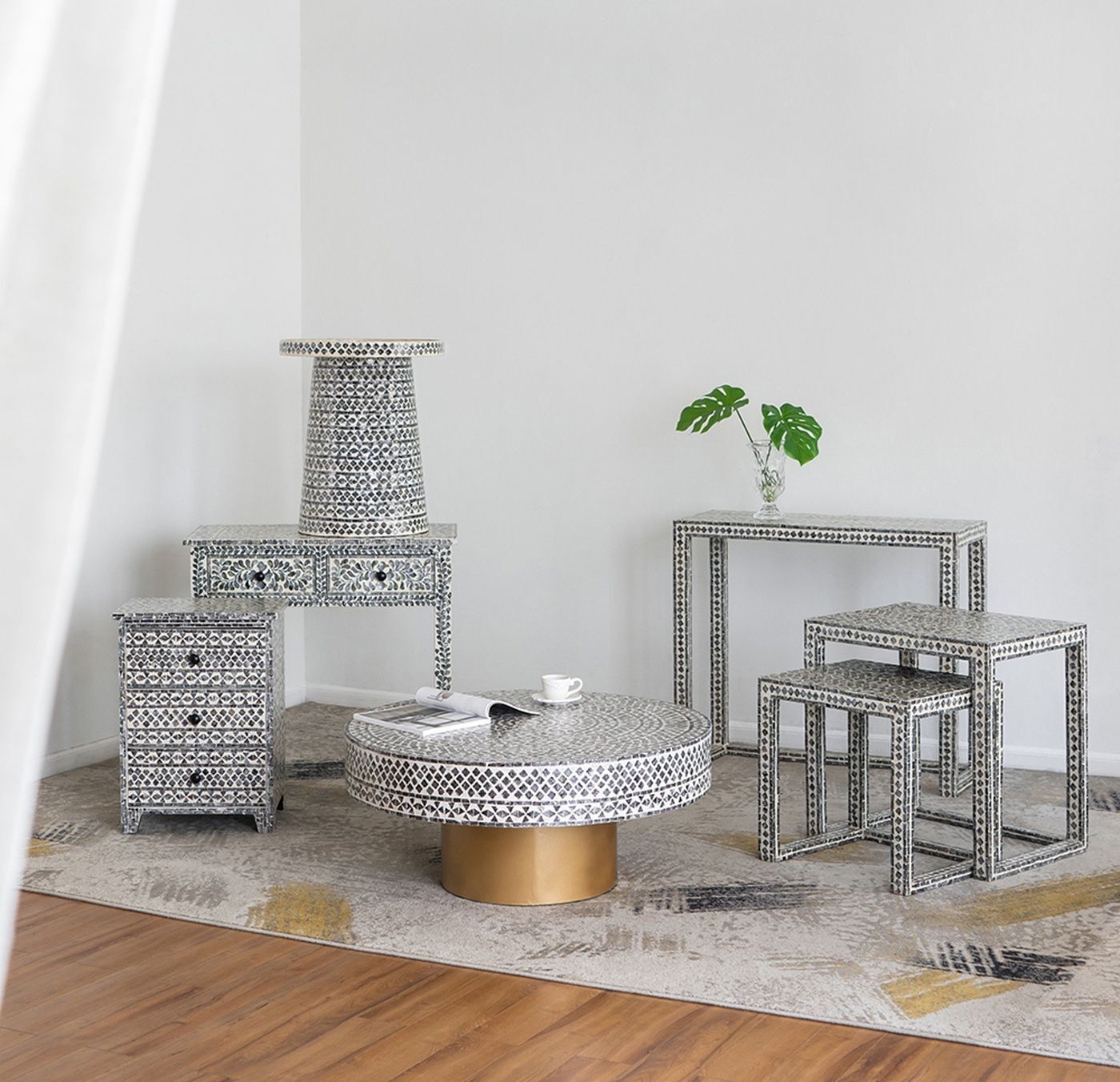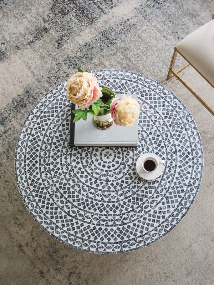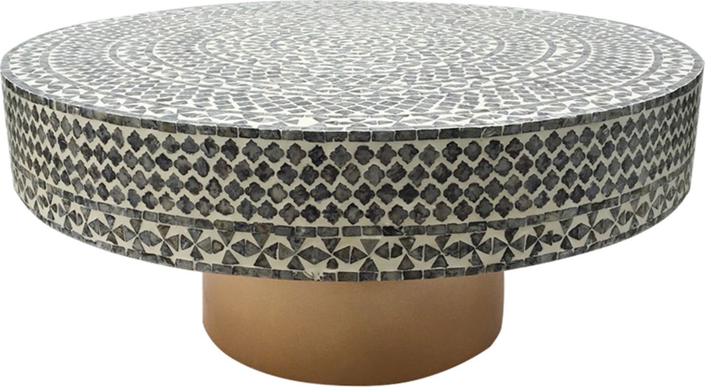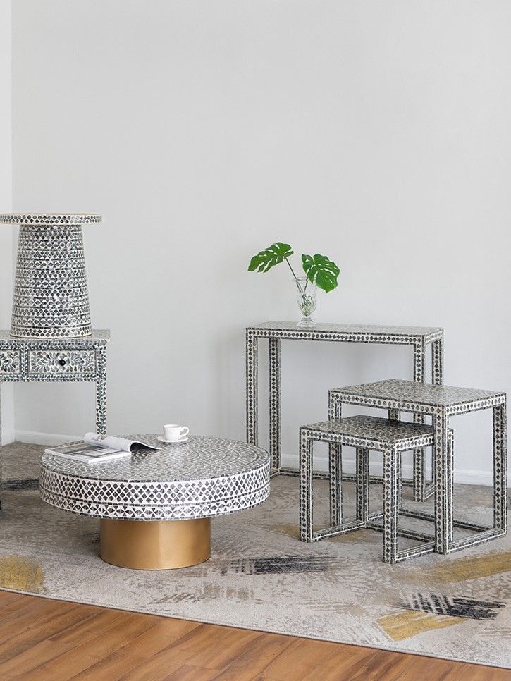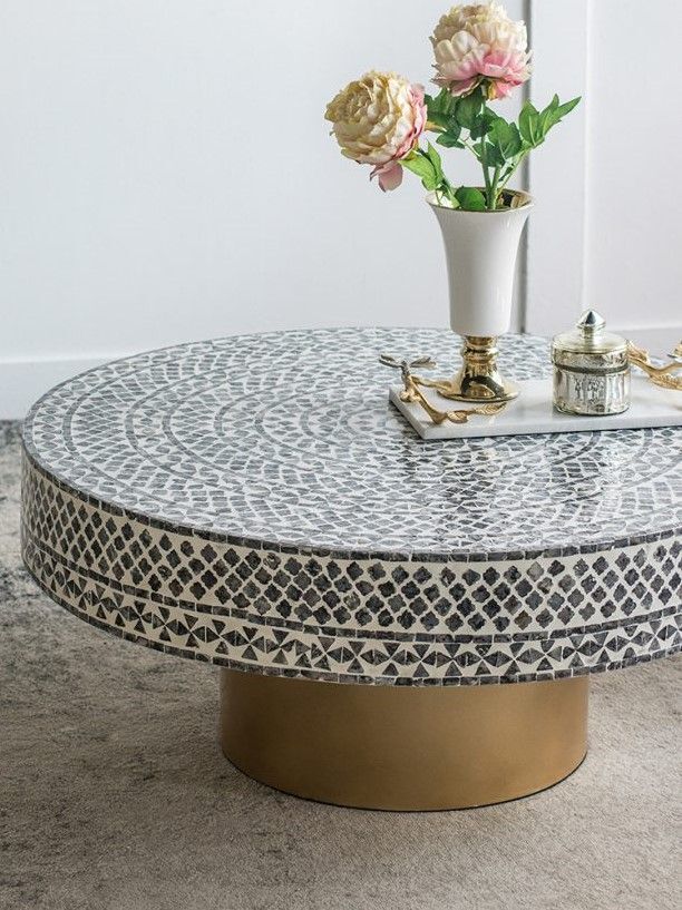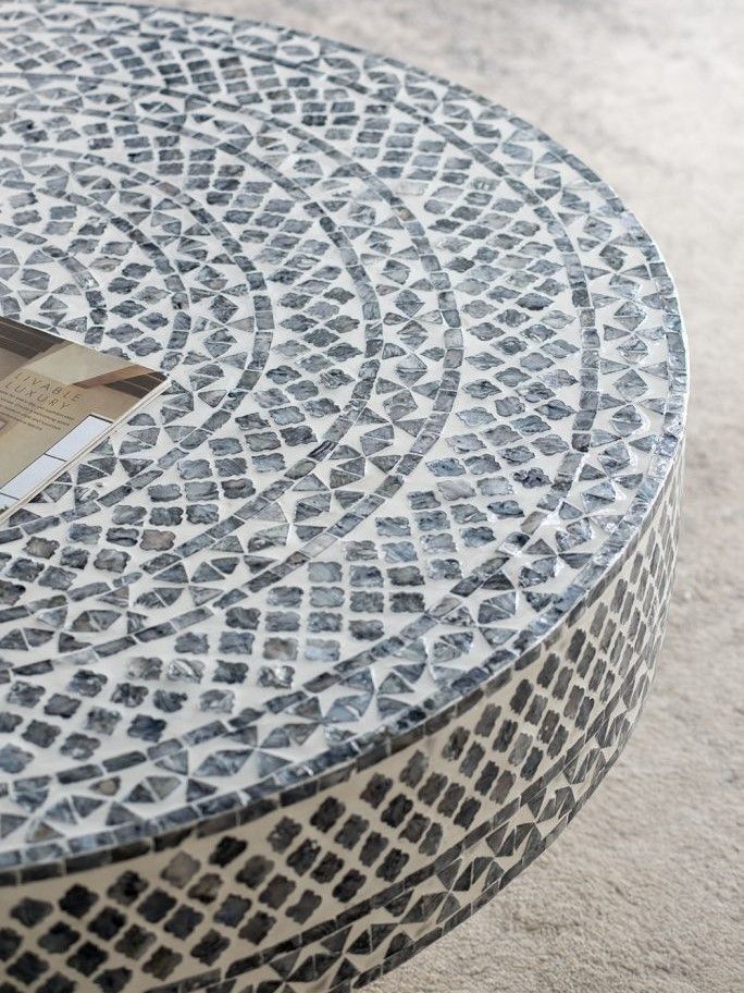 Столик с мозаичным рисунком из раковин устриц в черно-белых тонах, идеально подходит своим привлекательным стилем как дополнение к вашему интерьеру. Добавьте его в современную жилую комнату, просторный холл или офис, чтобы насладиться его перламутровым блеском и классической формой.