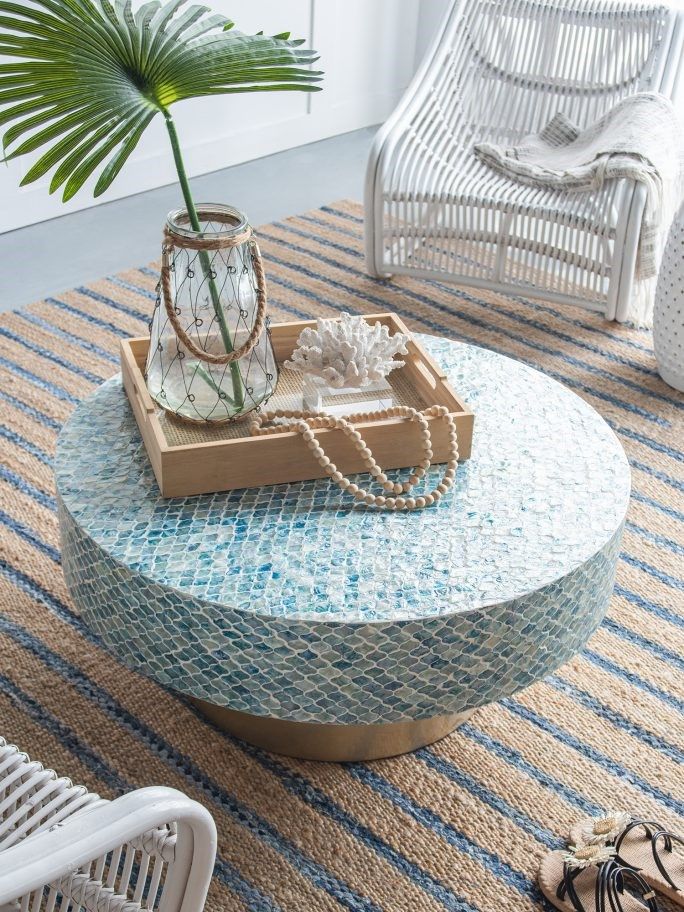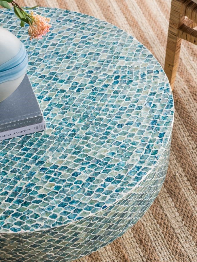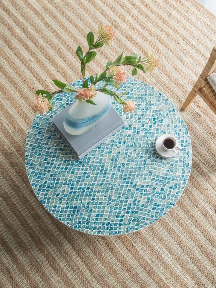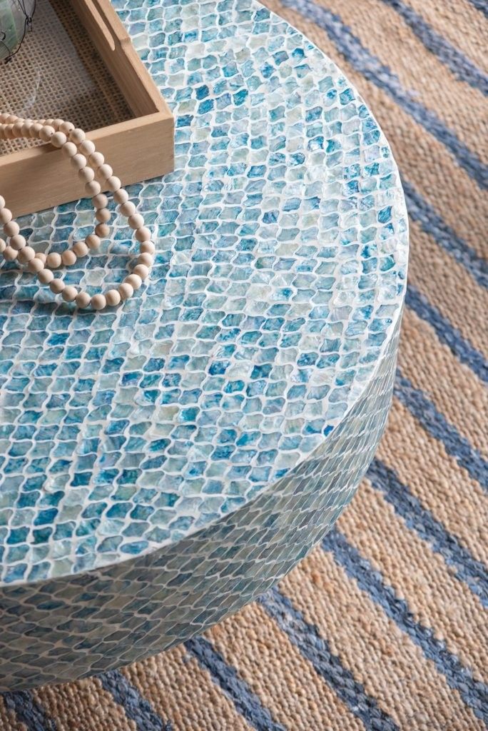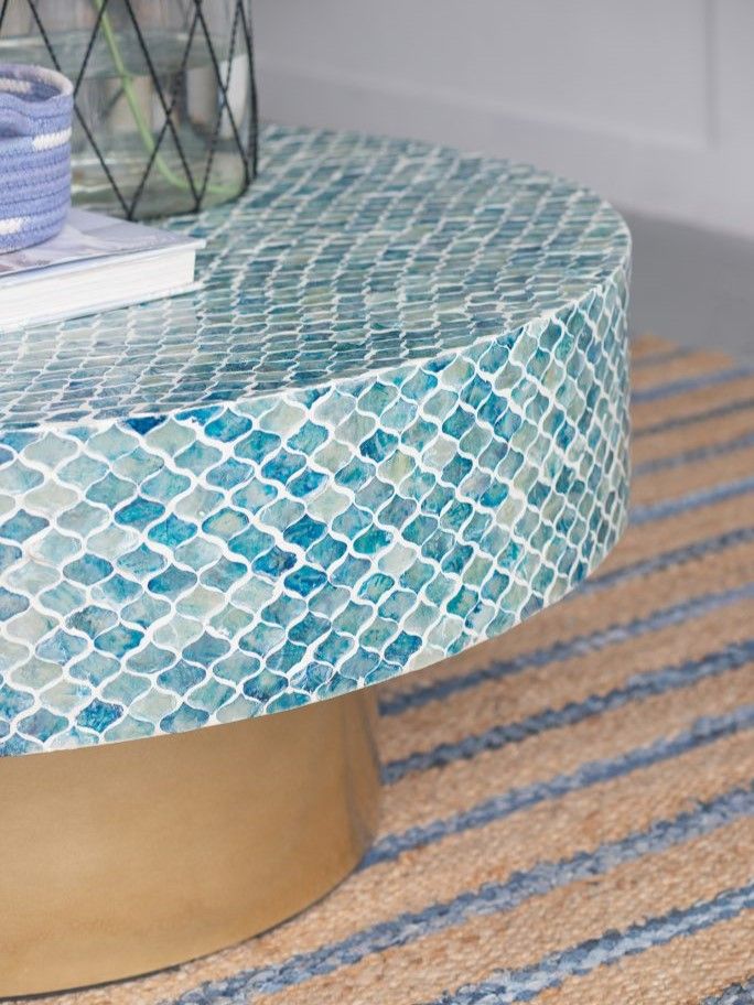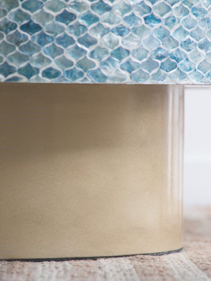 Изысканный столик с мозаичным рисунком из раковин устриц в голубых тонах, идеально подходит своим привлекательным стилем как дополнение к вашему интерьеру. Добавьте его в современную жилую комнату, просторный холл или офис, чтобы насладиться его перламутровым блеском и классической формой.
