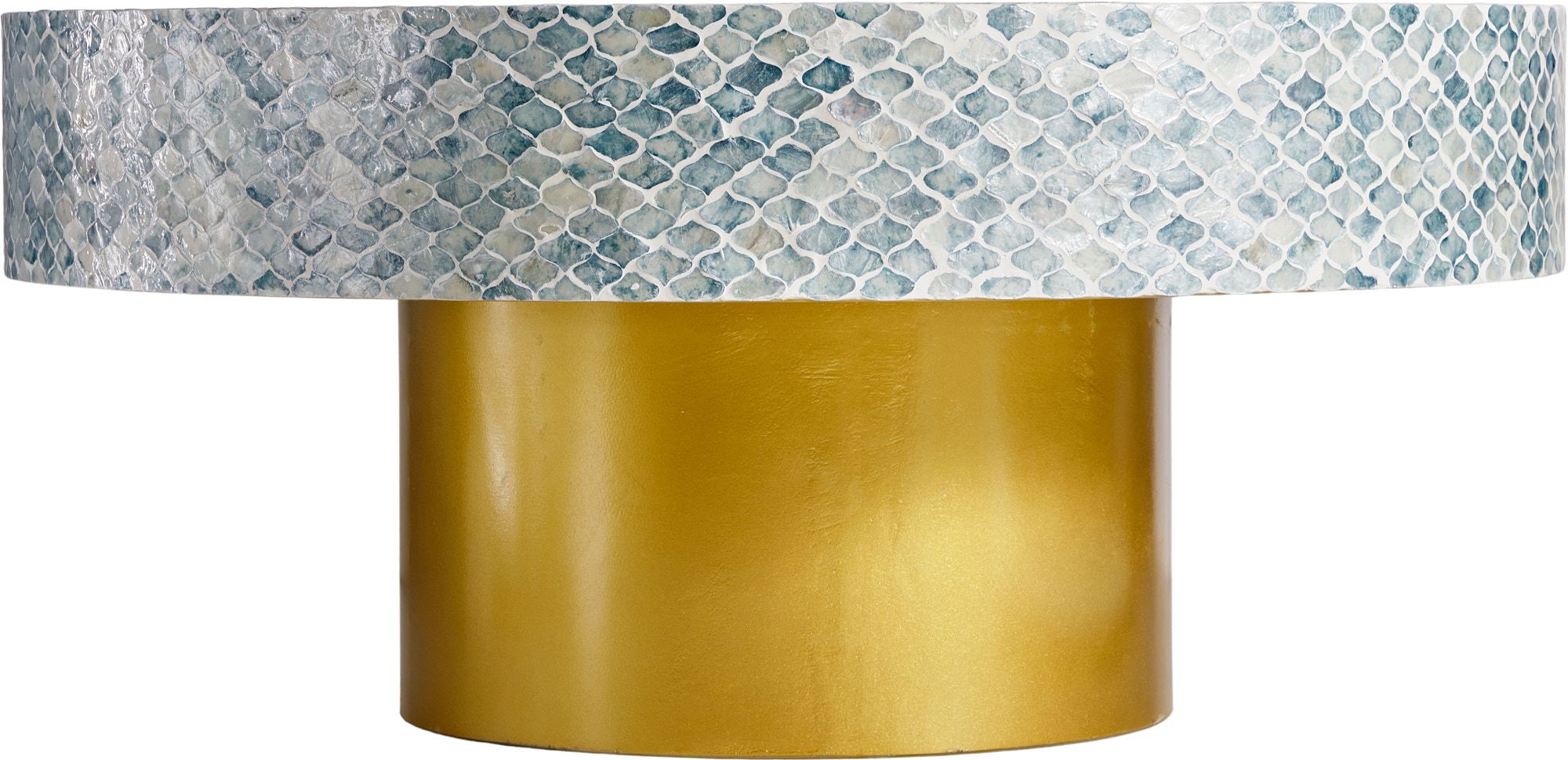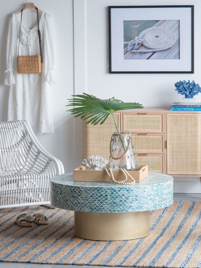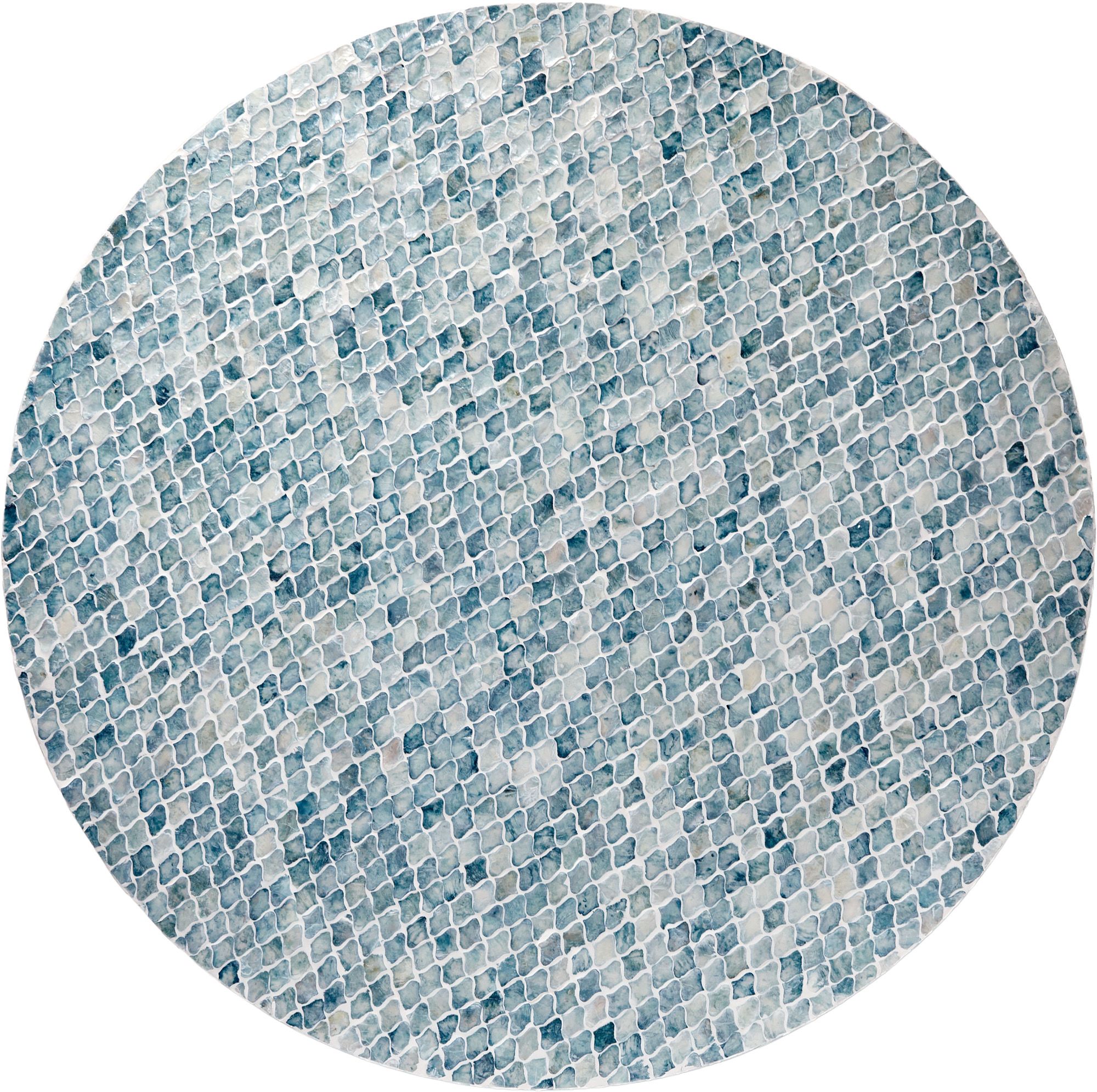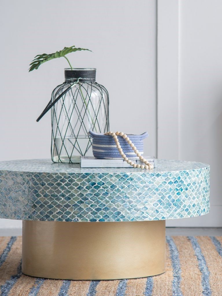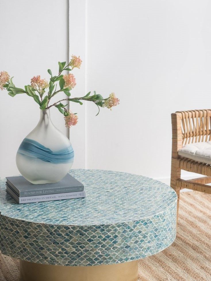 Изысканный столик с мозаичным рисунком из раковин устриц в голубых тонах, идеально подходит своим привлекательным стилем как дополнение к вашему интерьеру. Добавьте его в современную жилую комнату, просторный холл или офис, чтобы насладиться его перламутровым блеском и классической формой.