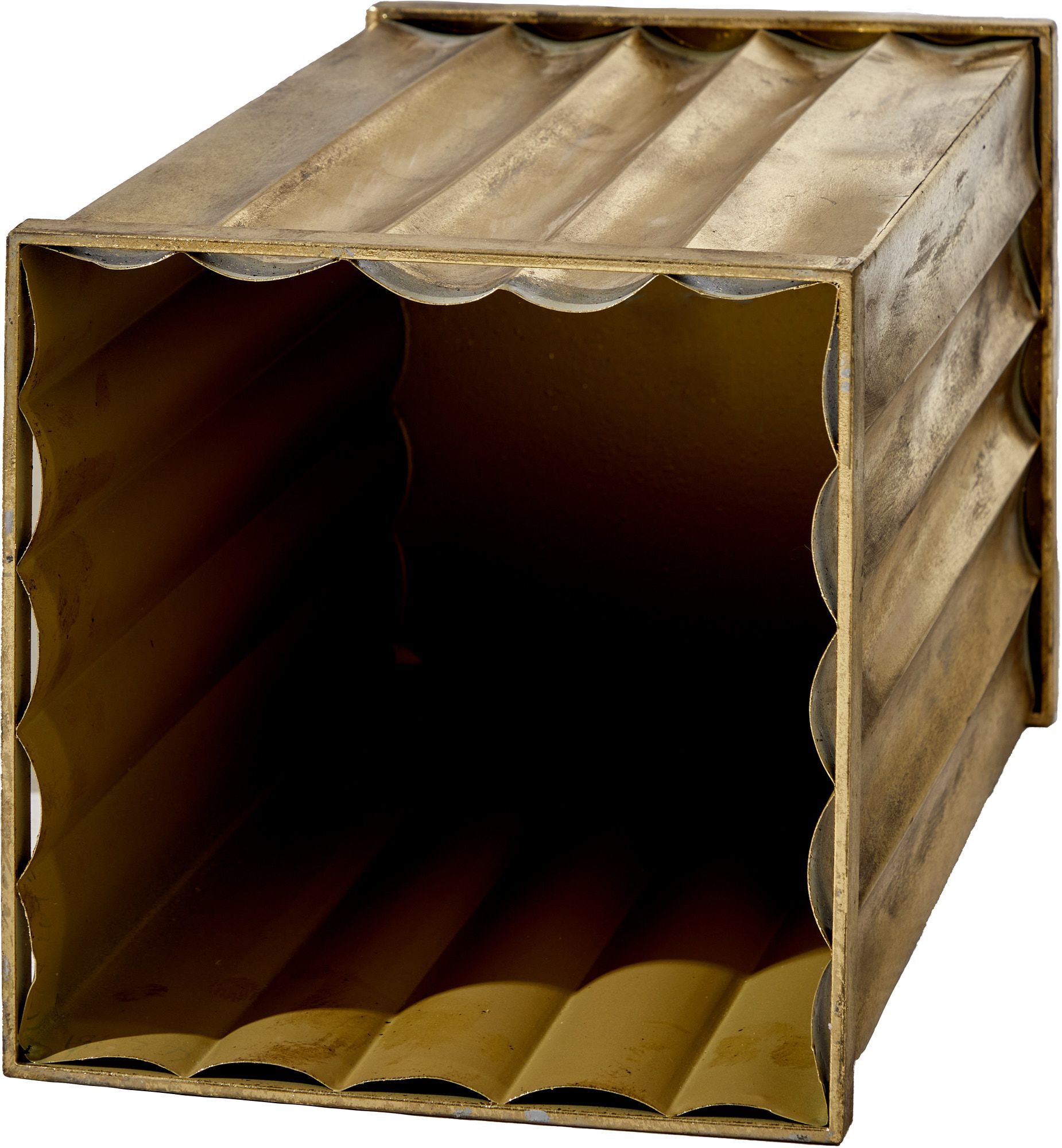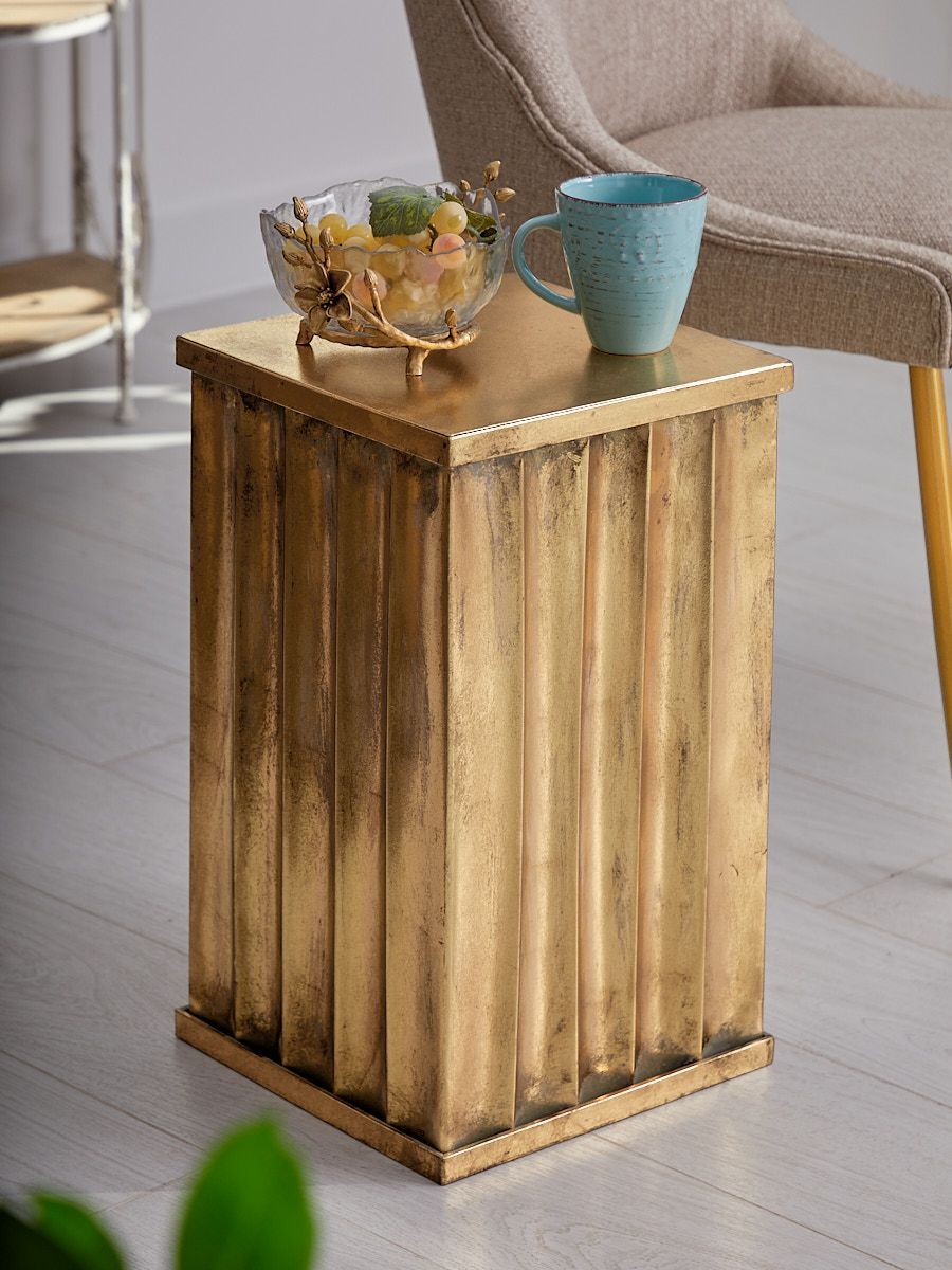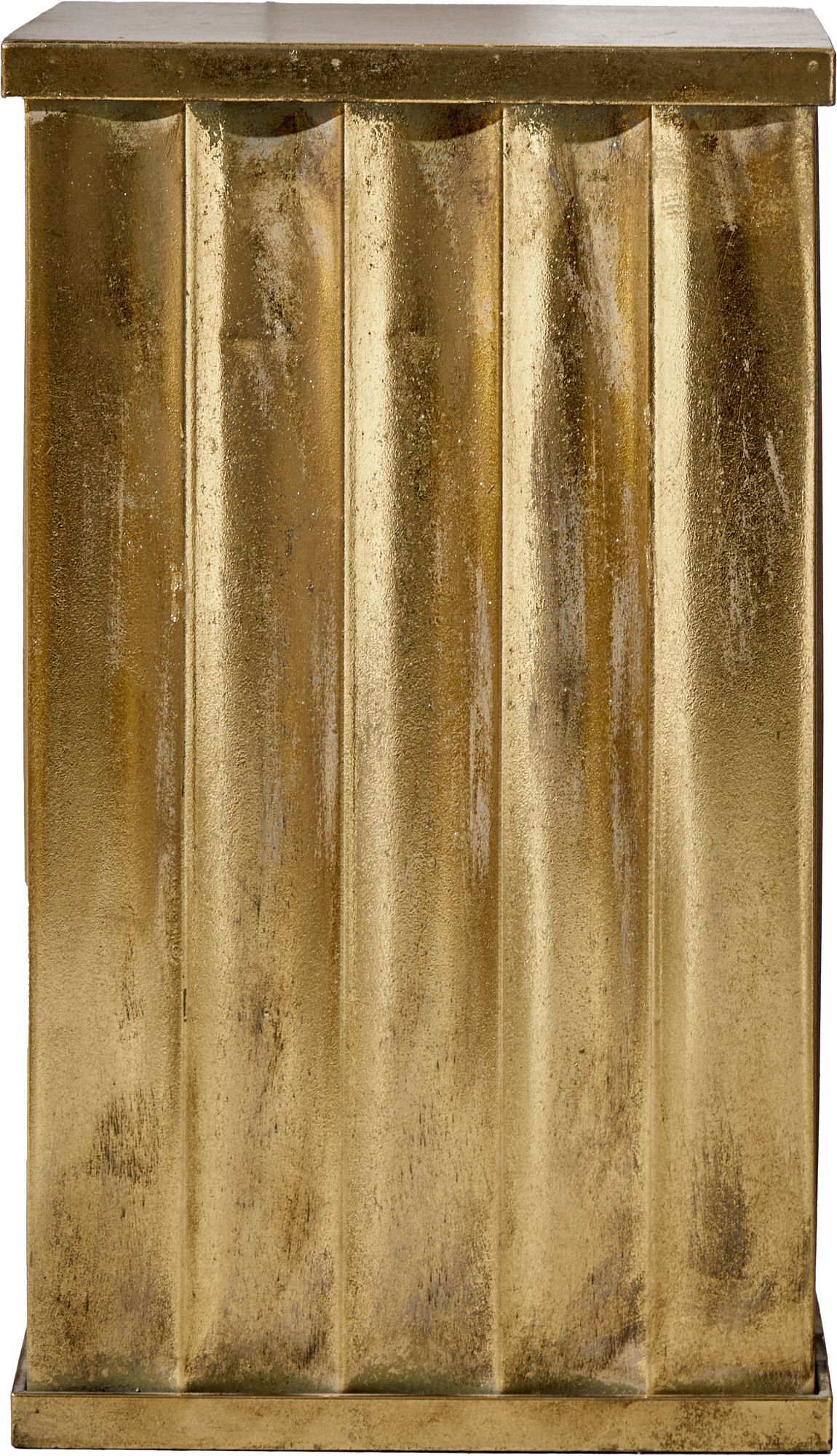 Интересный столик, выполненный из металла с напылением золотистого цвета и украшенный фактурной отделкой на корпусе, по форме напоминающей трибуну. Столик можно использовать в качестве подставки для кашпо с пышной цветочной композицией или других интерьерных предметов, подчеркивая ваш изысканный интерьер своей неповторимостью. Изделие имеет признаки искусственного состаривания, поверхность декорирована с эффектом патинирования, а наличие сварочных швов подчеркивают принадлежность к ручной работе.