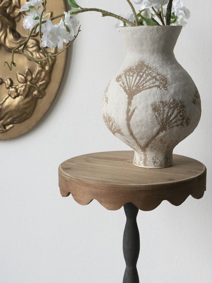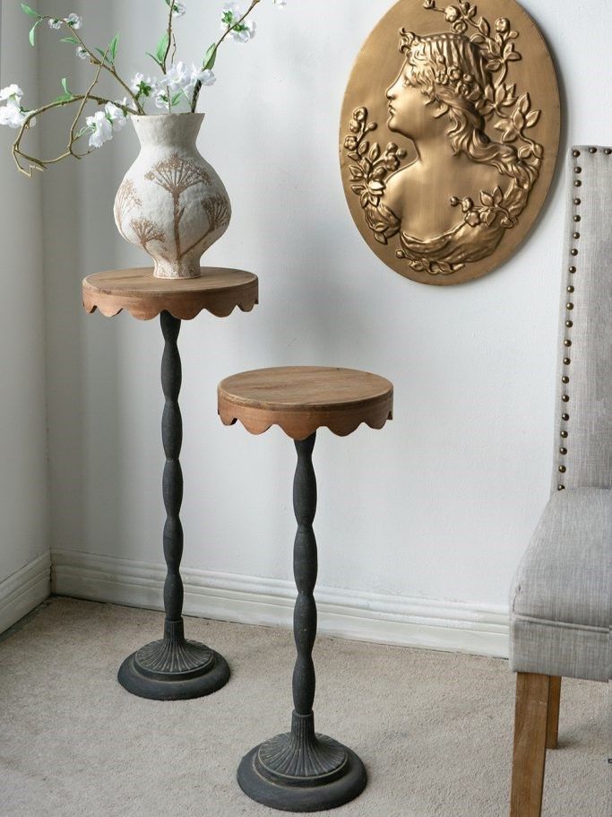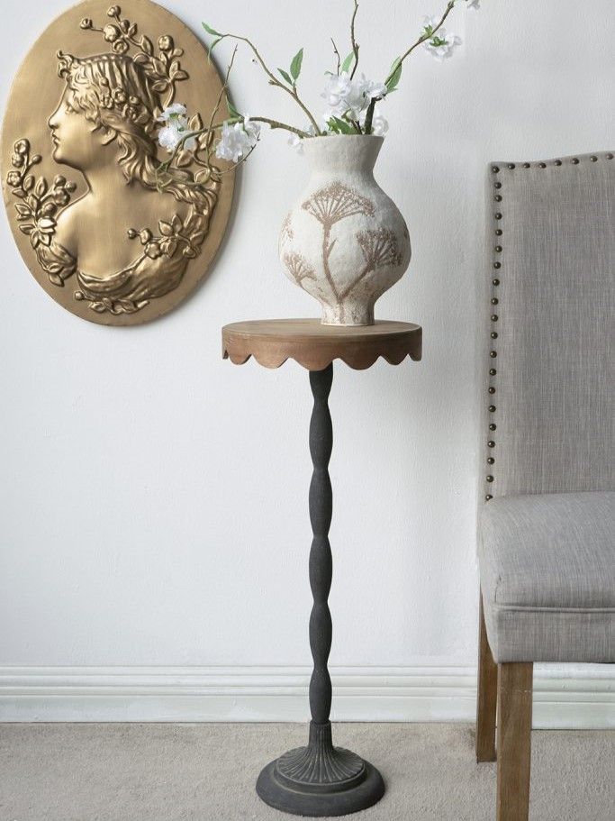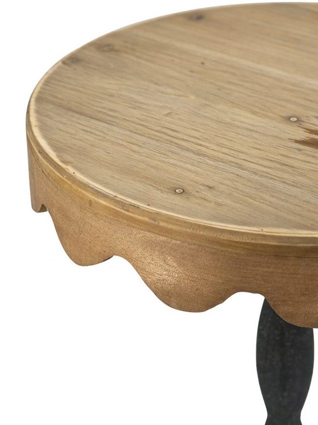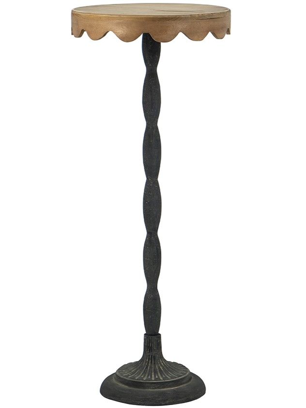 Обновленная версия классического приставного столика, с изящным основанием из черного металла и деревянной столешницей с фестонами. Благодаря своей универсальности изделие идеально подходит для использования в качестве приставного столика, подставки для цветов или кашпо, придавая любому помещению в вашем доме природного очарования. Натуральные материалы и силуэт в античном стиле позволяют столику гармонично сочетаться с традиционными, французскими, индустриальными и фермерскими стилями.