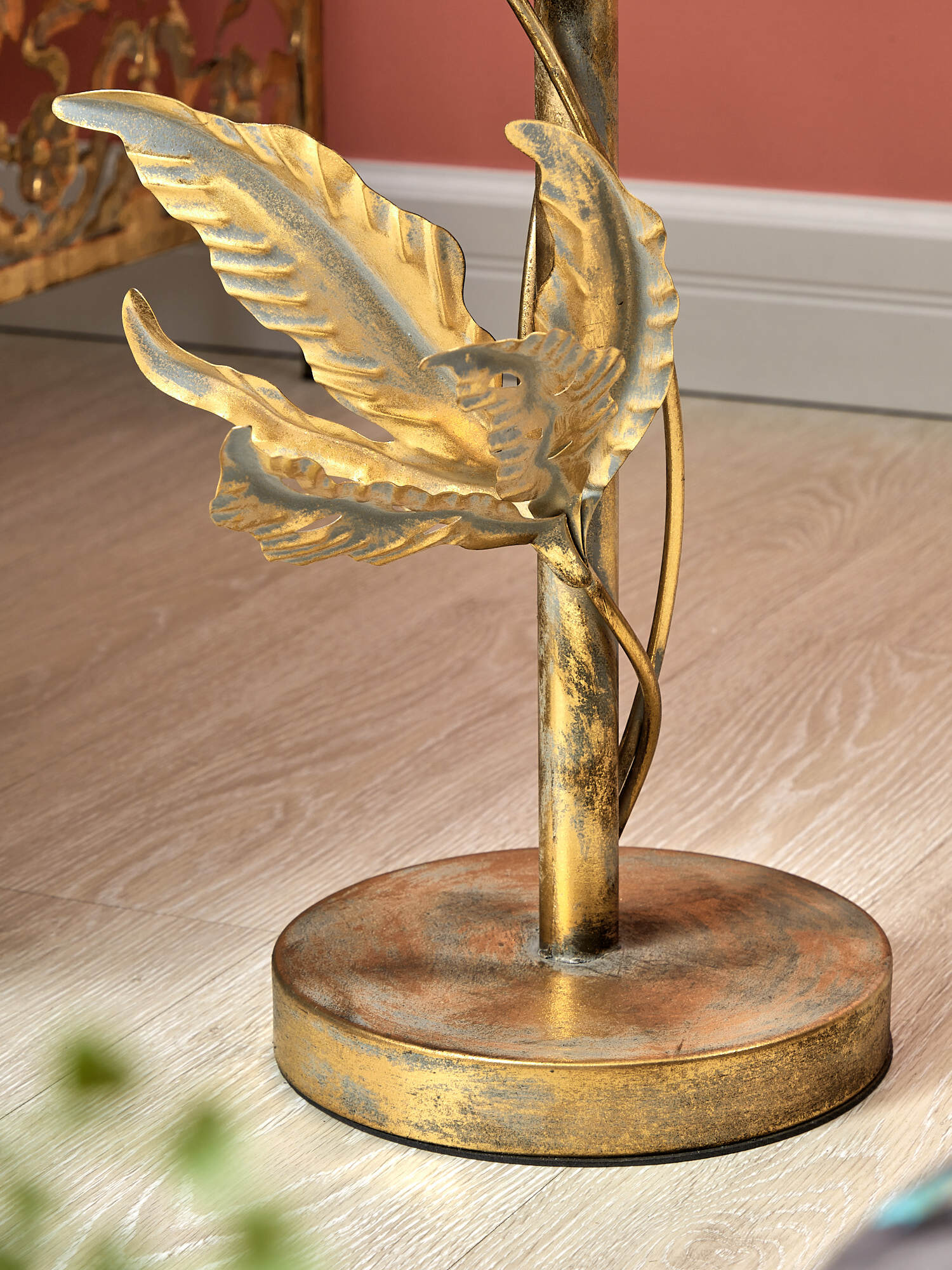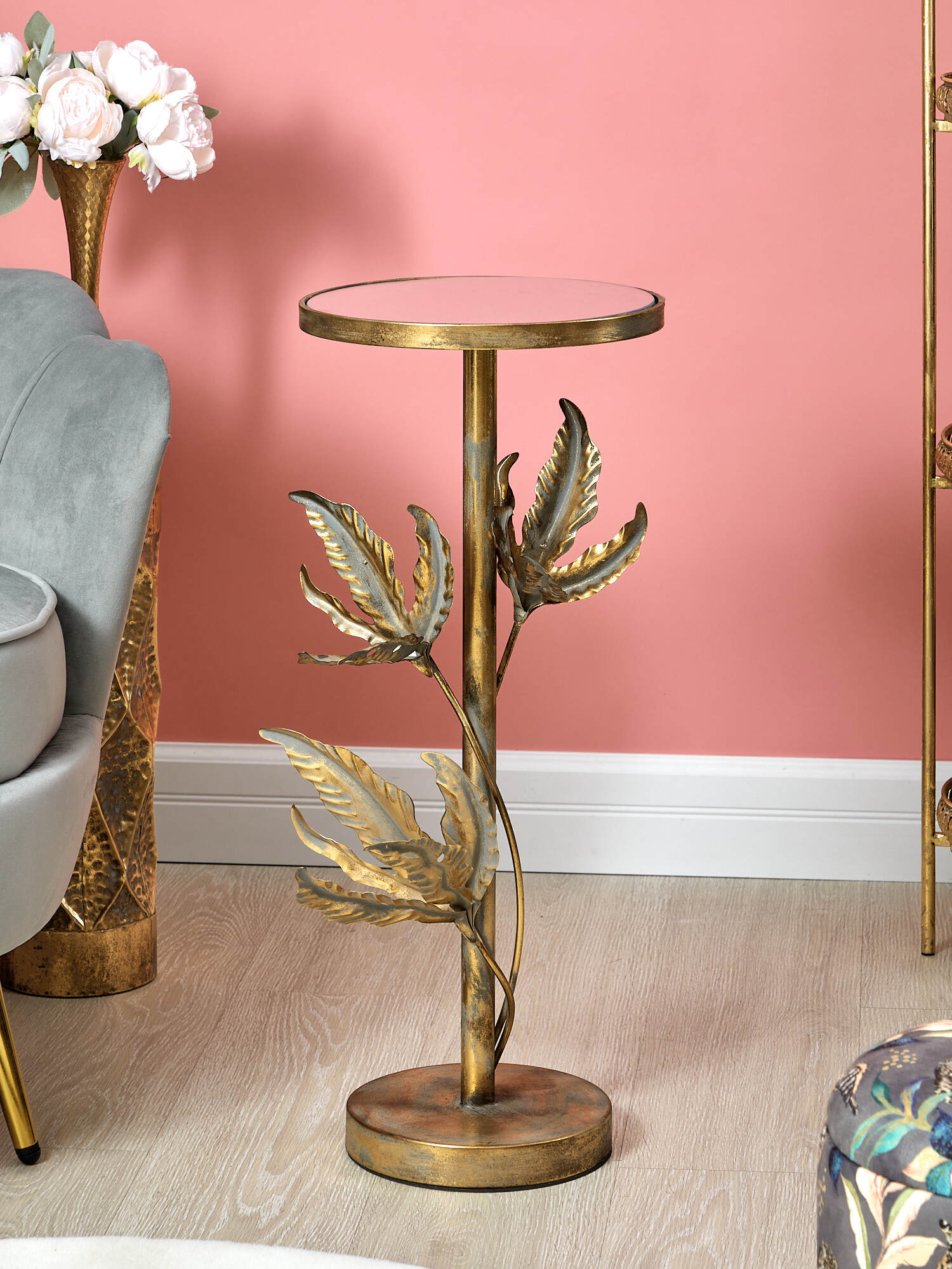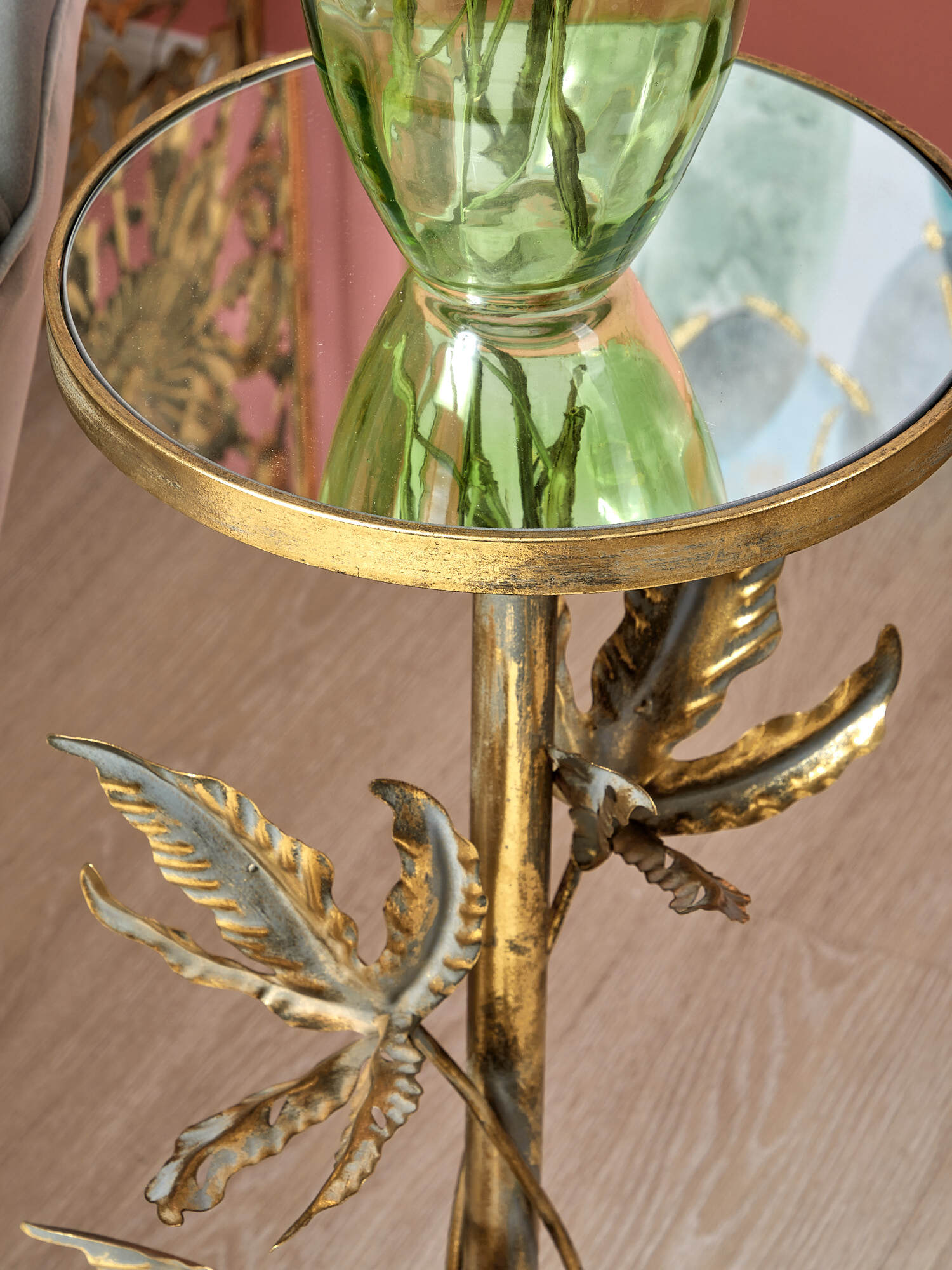 Металлический столик с зеркальной столешницей необычного дизайна, увенчанного вокруг основания листьями тропического растения, может использоваться и как кофейный столик, и как элемент современного дизайна. Изделие имеет признаки искусственного состаривания, поверхность декорирована с эффектом патинирования, а наличие сварочных фрагментов подчеркивают принадлежность к ручной работе. Украсит собой любое пространство и прекрасно дополнит интерьер.