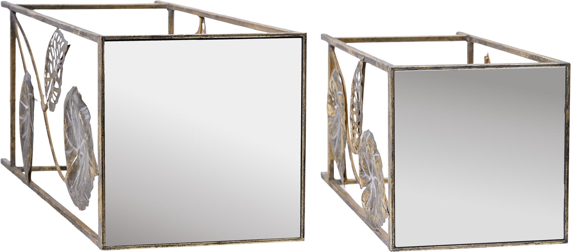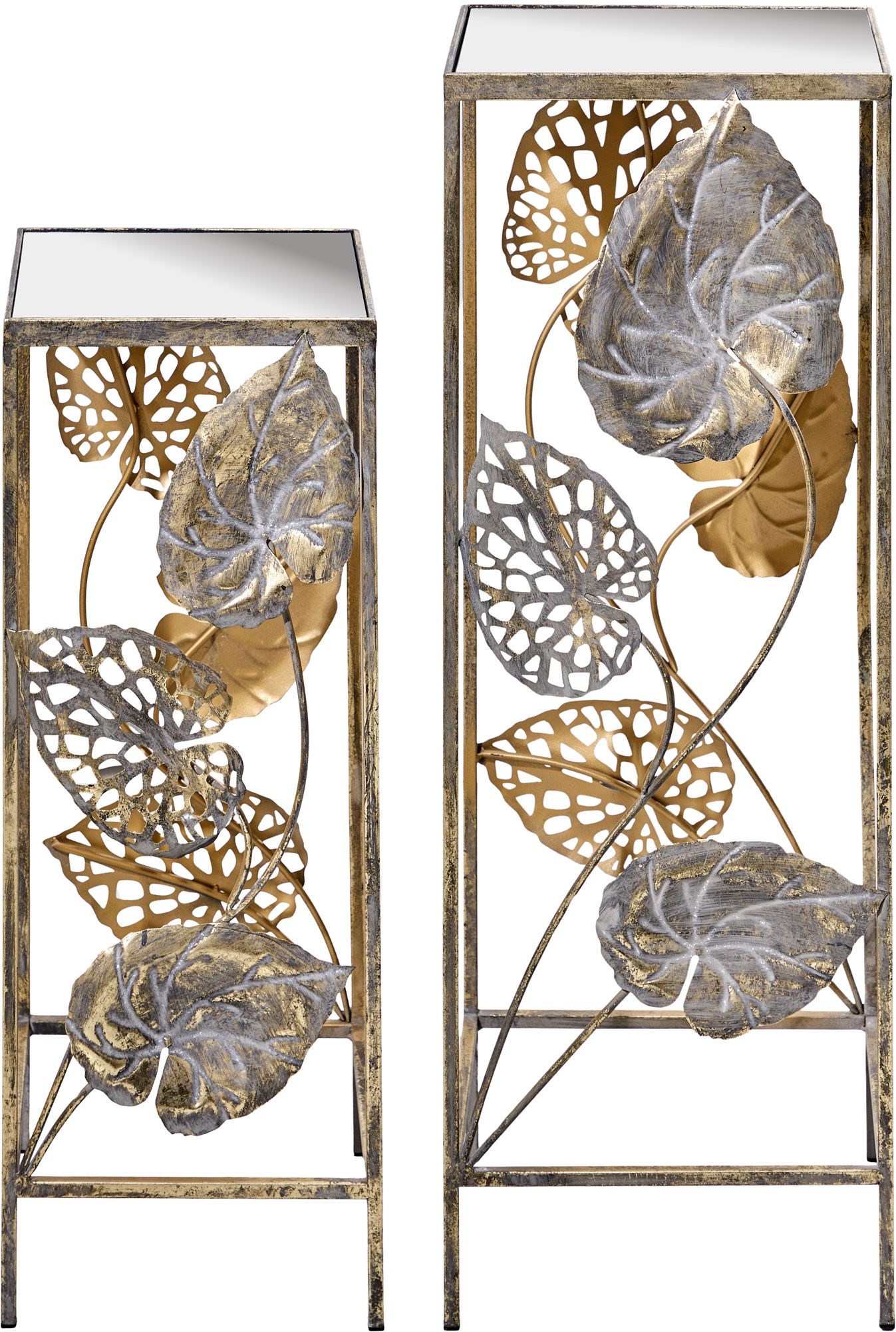 Набор из двух столиков с зеркальной поверхностью, выполненный из металла, увенчанный от подножия до столешницы композицией из листьев тропических растений. Изделия имеют признаки искусственного состаривания, поверхности декорированы с эффектом патинирования, а наличие сварочных швов подчеркивают принадлежность к ручной работе. Оригинальная форма столиков подчеркнет ваш изысканный интерьер своей неповторимостью.