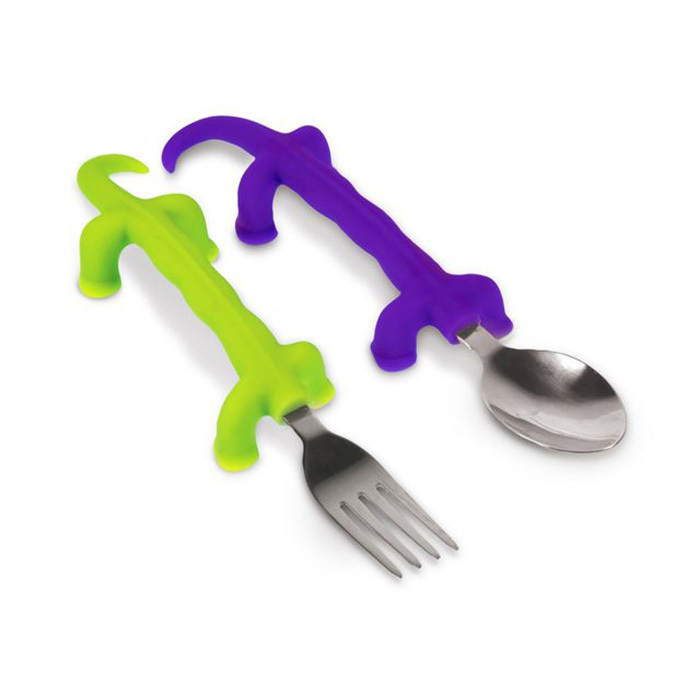 "Столовый набор Dinnersaurs - это настоящие первобытные ящеры Вилкодактикль и Ложказавр с вилкой и ложкой вместо головы! Увлечённый ребенок не заметит, как проглотил вторую порцию полезных овощей, ведь с такими приборами любой прием пищи превратится в забавную игру."