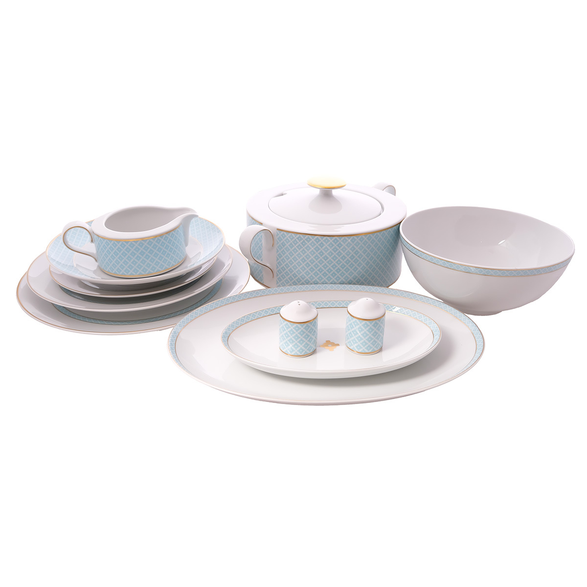 Состав столового сервиза: Набор тарелок 27 см -6шт Набор тарелок 21 см -6шт Набор глубоких тарелок 22 см -6шт Блюдо круглое 32см -1шт Супница 3,0 л. - 1 шт Блюдо овальное 36 см- 1шт Блюдо овальное 24 см -1шт Соусник 400мл -1шт Салатник 24 см -1шт Солонка - 1 шт Перечница- 1 шт