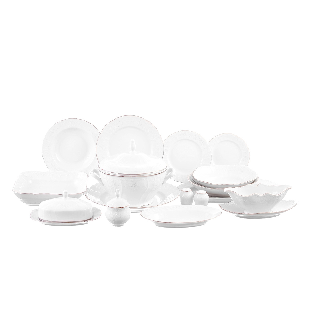 Представленный сервиз популярен и известен своими резными формами, сдержанным и аристократичным рисунком и сверкающей белизной фарфора. Такой набор может достойно украсить не только стол в вашем доме, но и элитный ресторан. Сервиз покоряет сердца ценителей качественной посуды неувядающей классикой дизайна, нежностью и воздушностью. Прочный и долговечный, сервиз станет не только гордостью обладателя, но также будет передаваться от поколения к поколению как реликвия. Комплектность сервиза: супник, 2 овальных блюда, 1 круглое блюдо, два круглых салатника, 1 квадратный салатник, 12 десертных тарелок по 17 см и 12 десертных тарелок по 12 см, 12 мелких тарелок по 25 см в диаметре, 12 глубоких тарелок по 23 см, 1 соусник на 0,5 л, солонка, перечница, масленка (250 г), 2 горчичницы по 150 мл каждая.