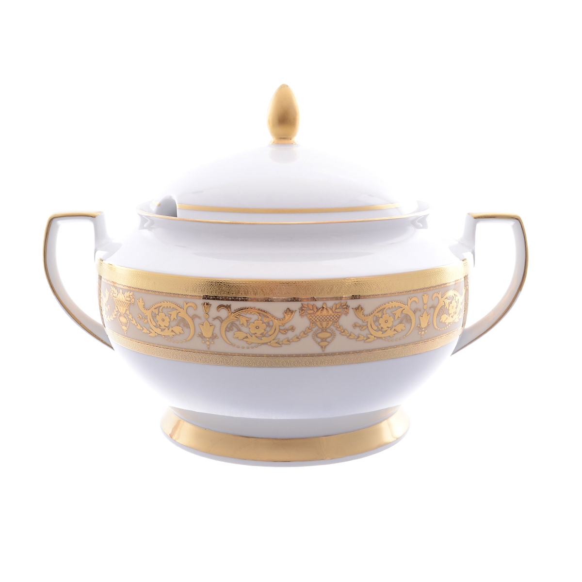 Состав набора: 1) Овальное блюдо 36 см - 1 шт. 2) Круглое глубокое блюдо 31 см - 1 шт. 3)Салатник 23 см круглый - 1 шт. 4) Тарелка десертная 19 см - 6 шт 5) Тарелка суповая 23 см - 6 шт, 6) Тарелка подстановочная 25 см - 6 шт, 7) Соусник +подставка 0,5 л - 1 шт. 9) Прибор для специй - 2 шт, 10) Супница+крышка- 1 шт ,объем 3 л.