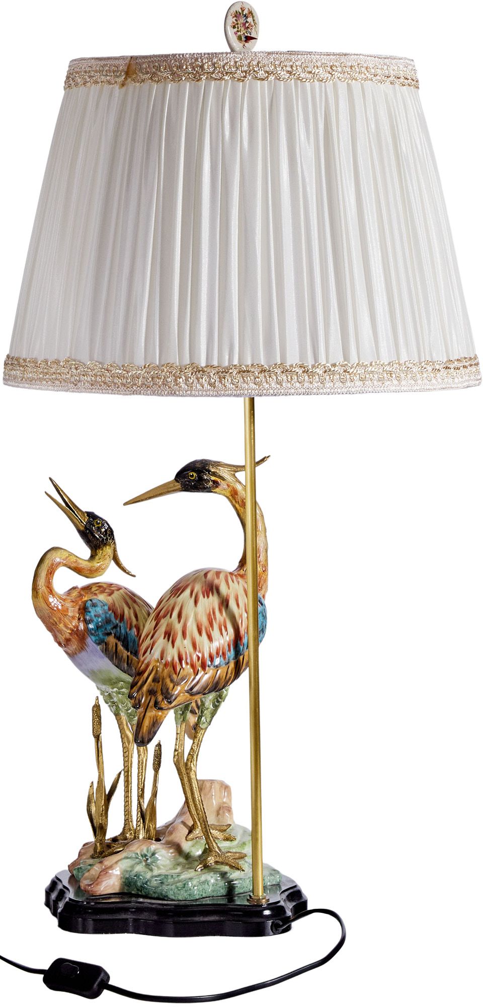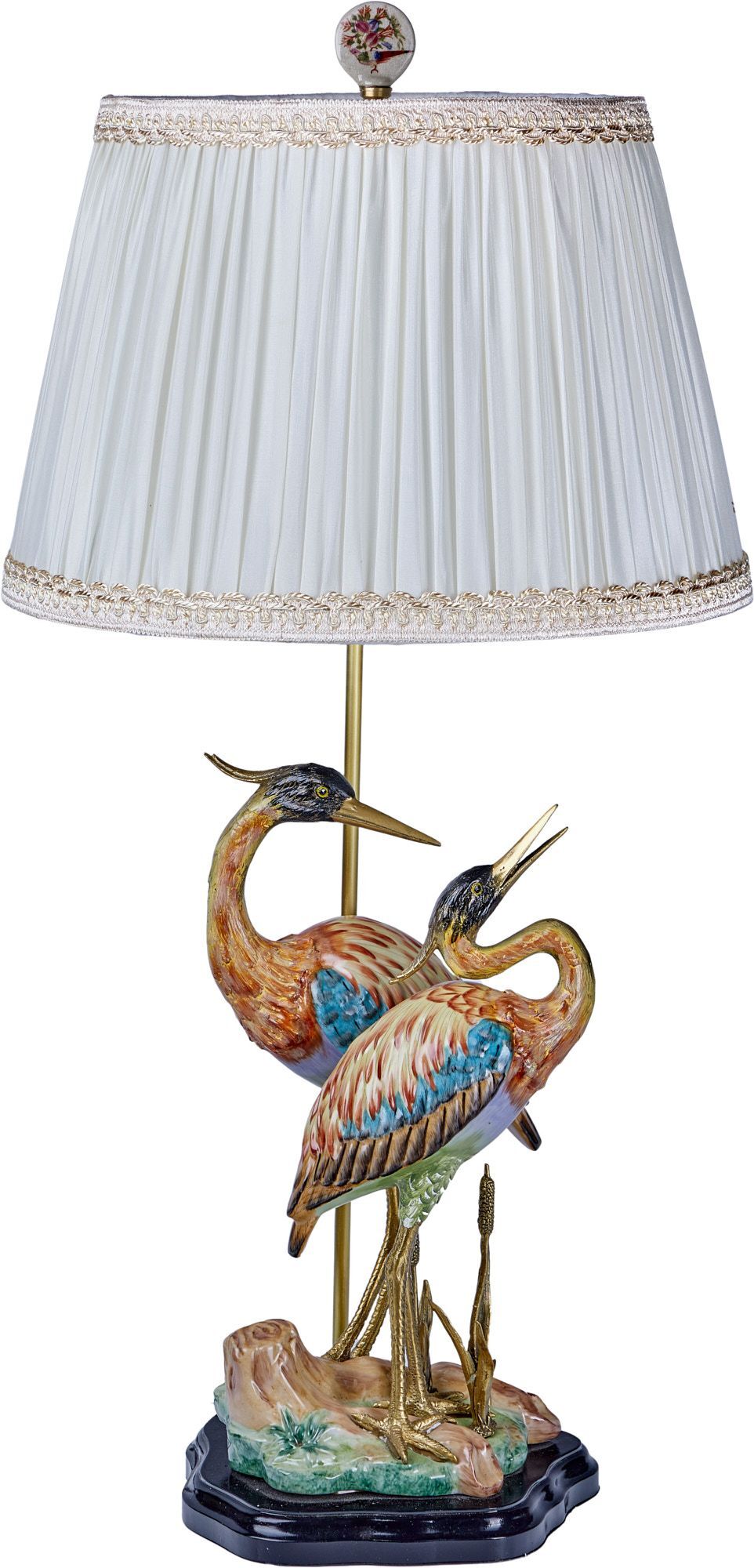 Светильник с абажуром, декорированный двумя цаплями, выполненный из фарфора с бронзовыми элементами. Уникальное изделие ручной работы. При производстве этих художественных изделий из фарфора с бронзой используются вековые традиции китайских мастеров. Видимые трещинки (кракелюры) делаются по уникальной технологии, что придает более благородный вид старинного изделия.