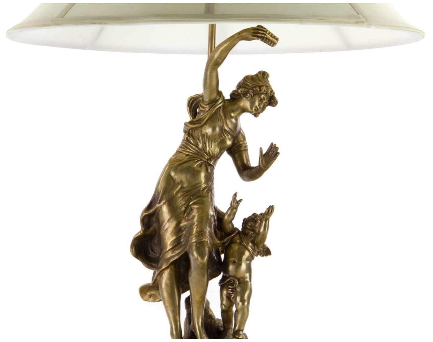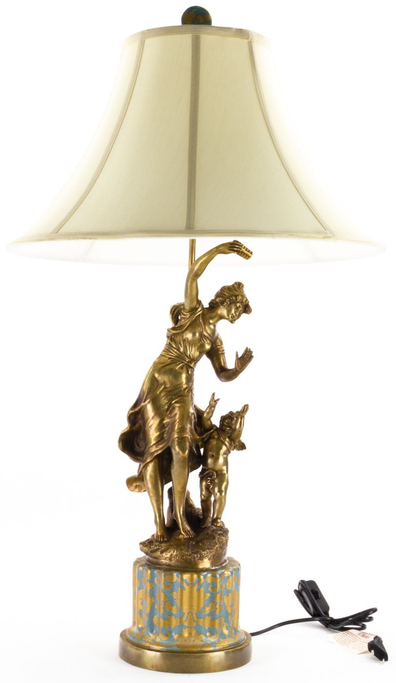 Светильник с абажуром в виде девушки с ангелом, выполненный из фарфора с бронзовыми элементами. Уникальное изделие ручной работы. При производстве этих художественных изделий из фарфора с бронзой используются вековые традиции китайских мастеров. Видимые трещинки (кракелюры) делаются по уникальной технологии, что придает более благородный вид старинного изделия.