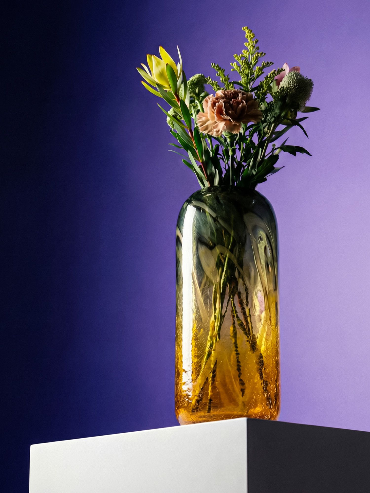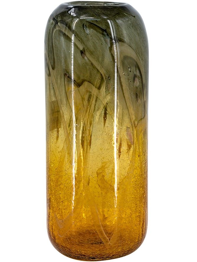 Изысканная стеклянная ваза, в которой цилиндрический силуэт обретает новую художественную интерпретацию, украшена сочетанием янтарных и серых оттенков. Независимо от того, стоит ли ваза пустая или наполнена вашими любимыми цветами, она идеально впишется в любой интерьер на столе, каминной полке или консоли. Изящные, четкие линии и контрастная цветовая гамма позволяют этому изделию сочетаться с переходными, современными, модернистскими и эклектичными стилями.